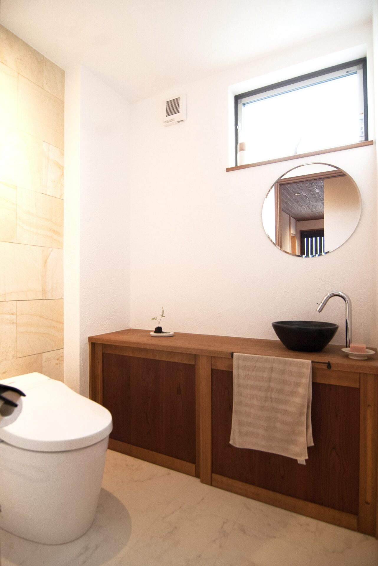 トイレスペースも造作の洗面台で、ステキな和モダン空間に!収納扉の取っ手一つ、タオル掛け一つとっても、決してメッキは使わず、本物のアイアンで仕上げました。無垢材の木目の黒いボウルと相まって、旅館のような風情を演出。