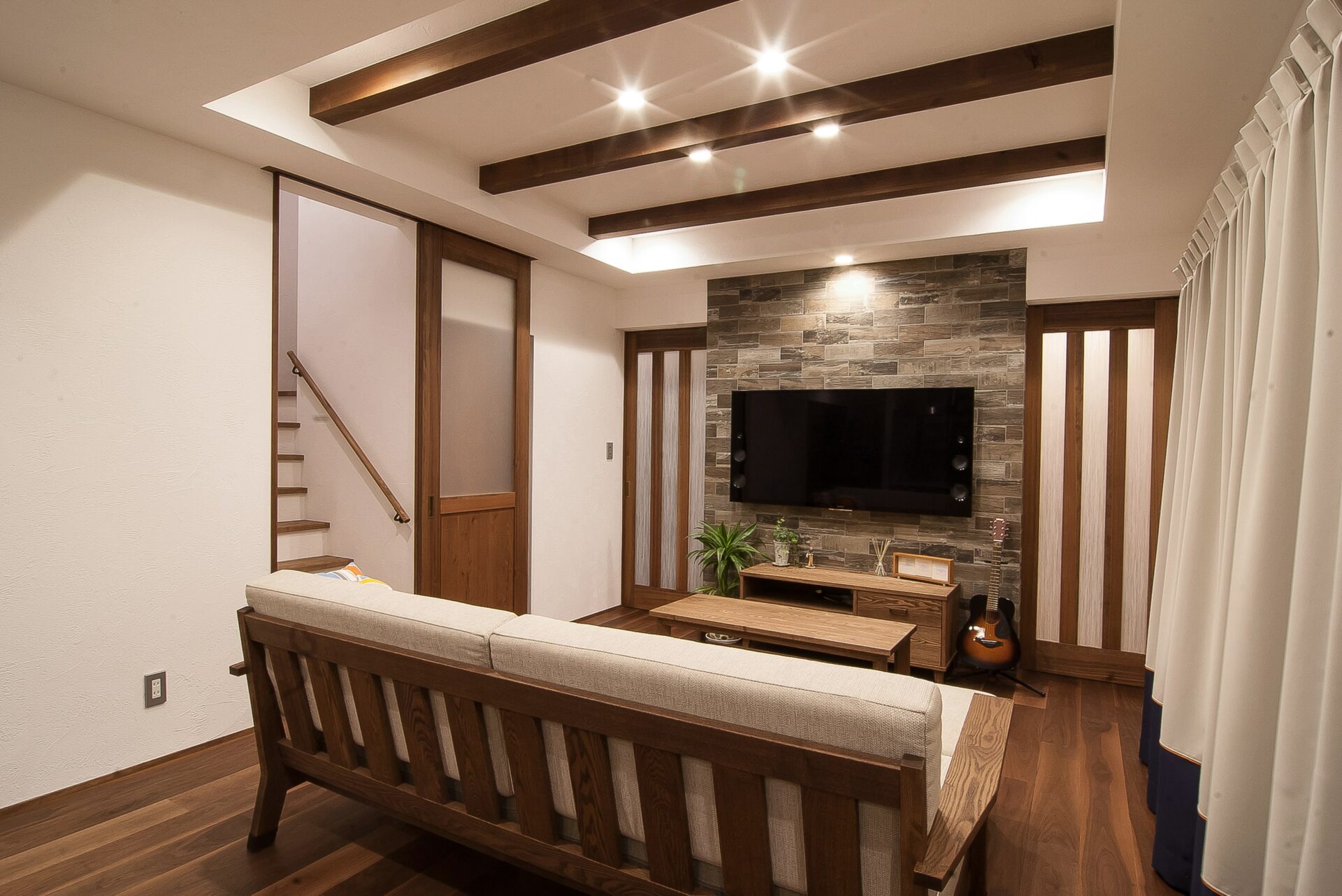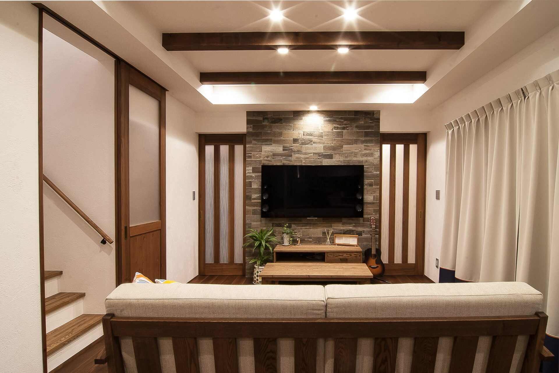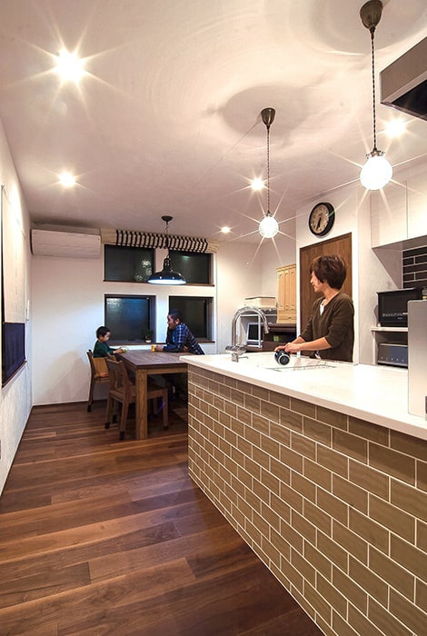 TV側の壁は木目がついたタイルを貼り、重厚感ある雰囲気にするなどこだわりが満載。 特に気にしたのが人の動き。行き止まりのない回遊型動線や、帰宅後すぐに上着を片づけられる大型の玄関クロークを備えるなど、設計士にアドバイスをもらいながら細部までこだわられました。