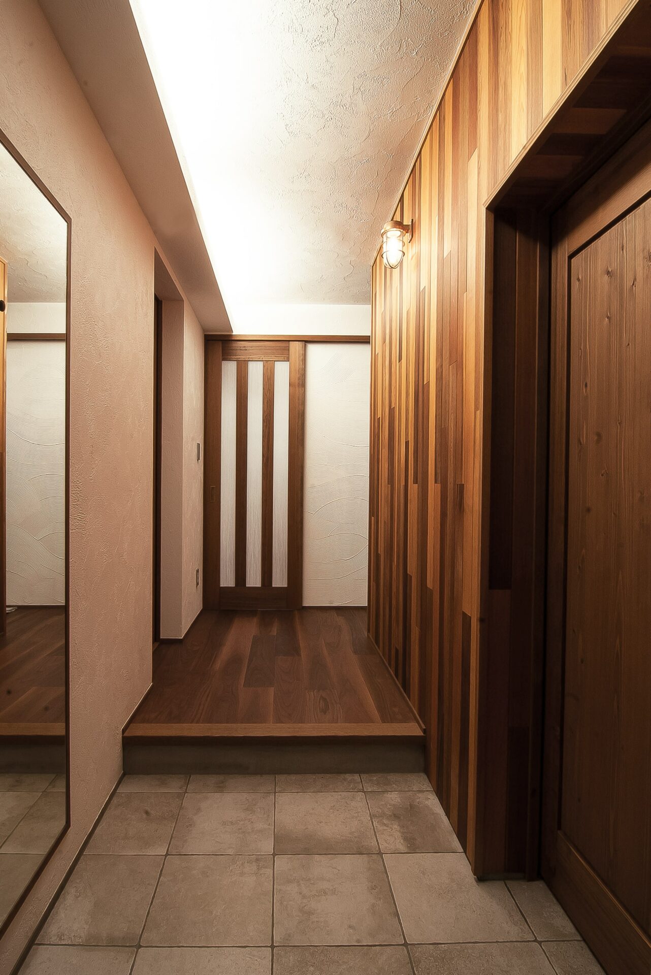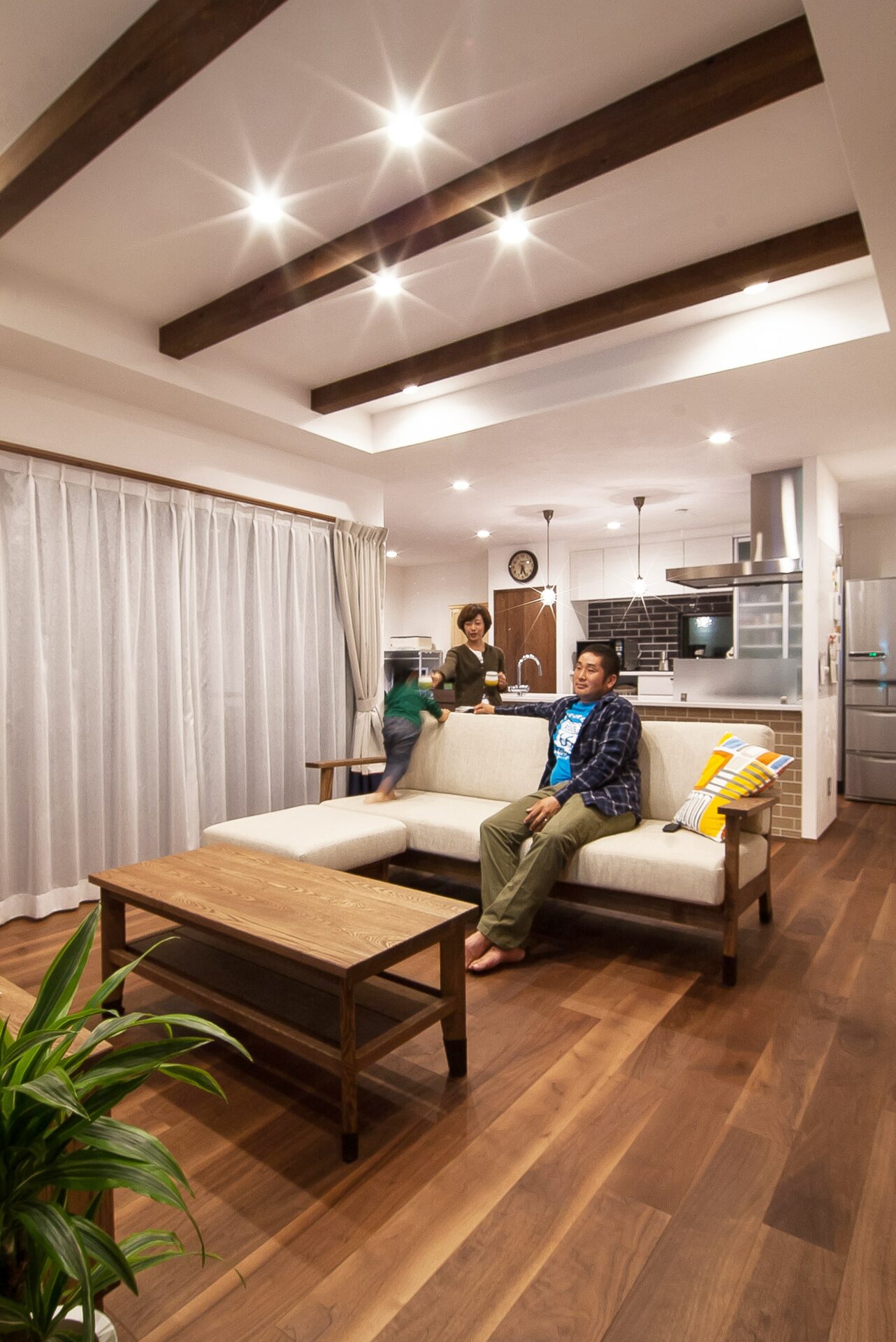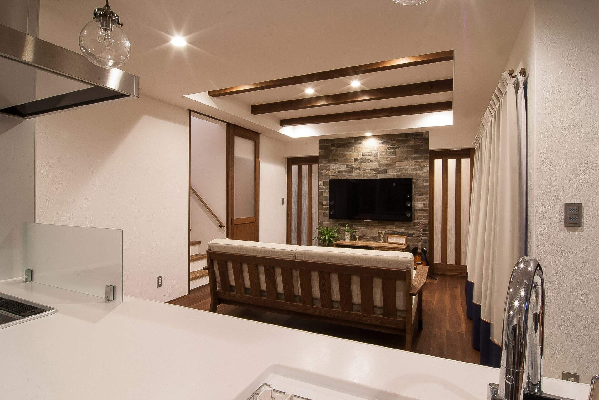 TV側の壁は木目がついたタイルを貼り、重厚感ある雰囲気にするなどこだわりが満載。 特に気にしたのが人の動き。行き止まりのない回遊型動線や、帰宅後すぐに上着を片づけられる大型の玄関クロークを備えるなど、設計士にアドバイスをもらいながら細部までこだわられました。