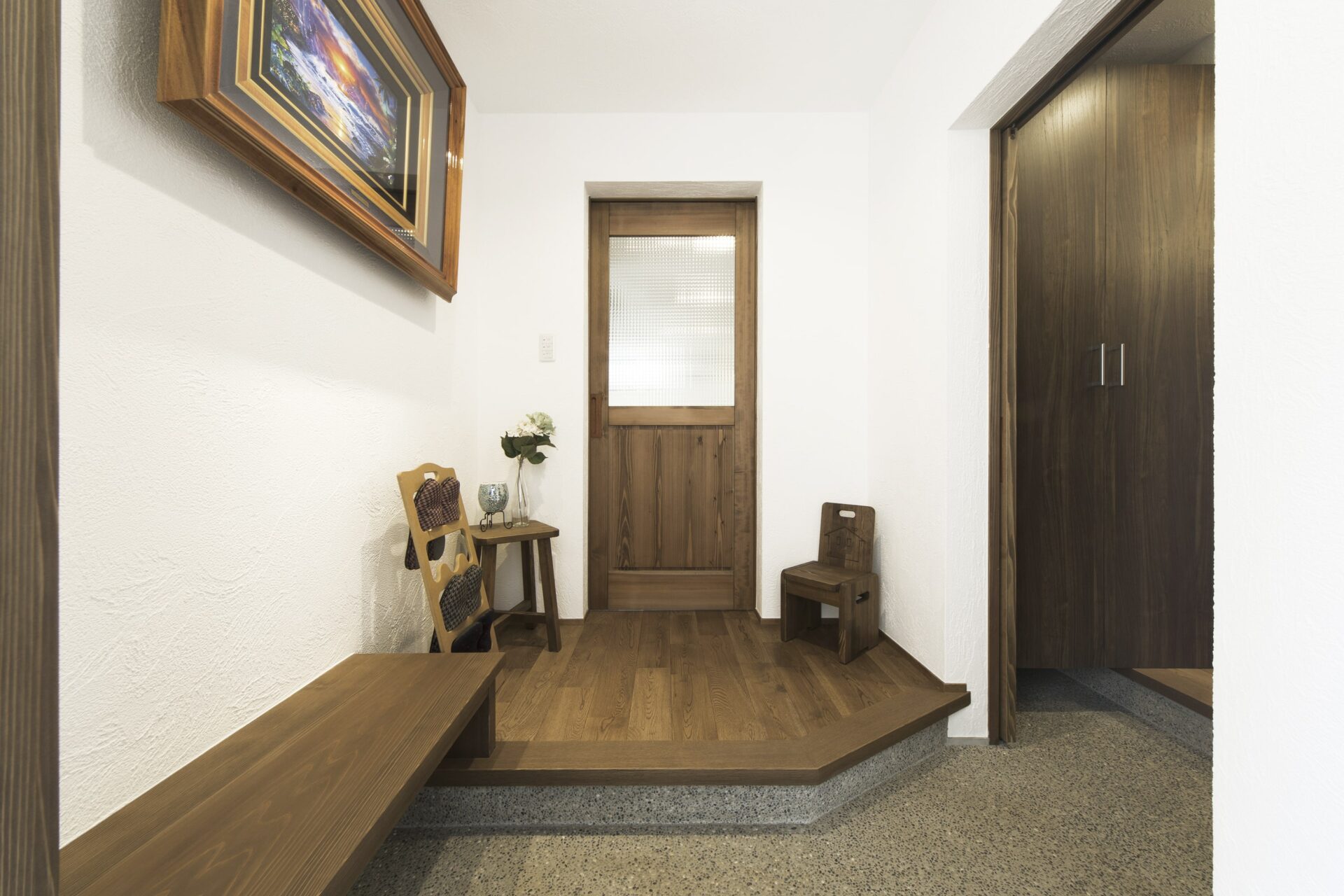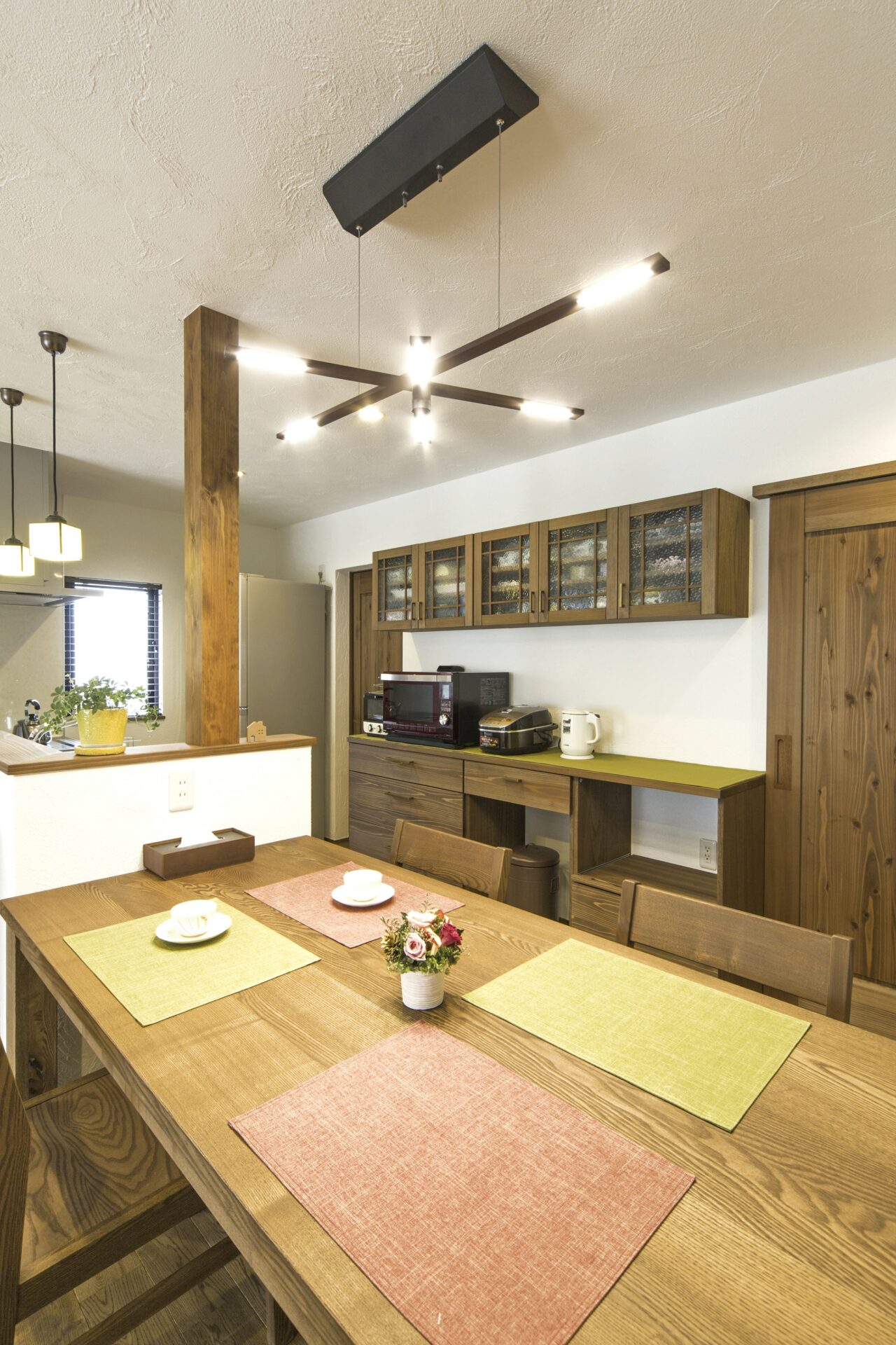 落ち着いたショコラ色に塗装した無垢材と漆喰がオーガニックカフェを連想させる自然素材のお住まいです。