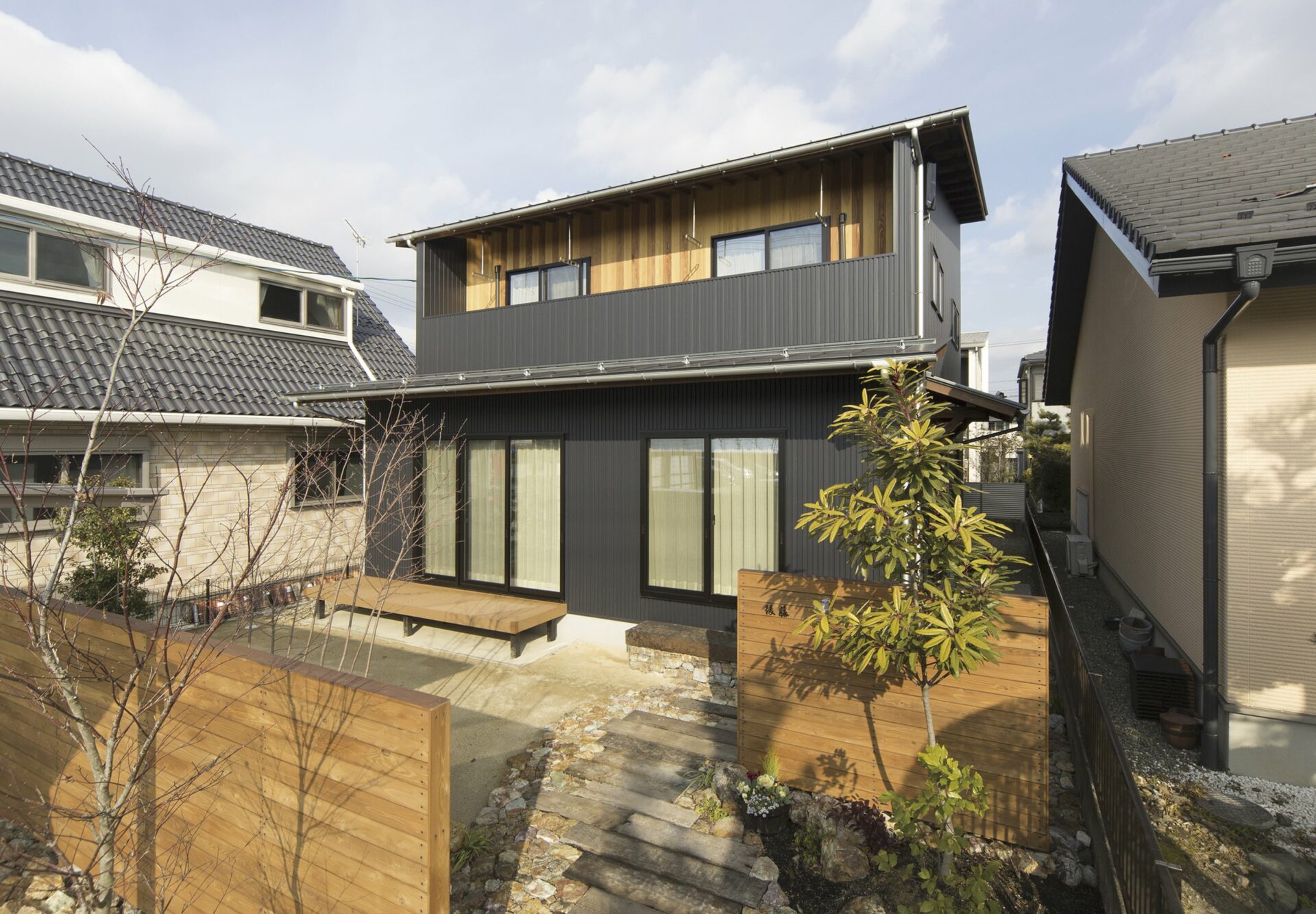 ガルバリウムの外観にレッドシダー風に塗装した杉無垢がアクセントのカッコイイ外観です。