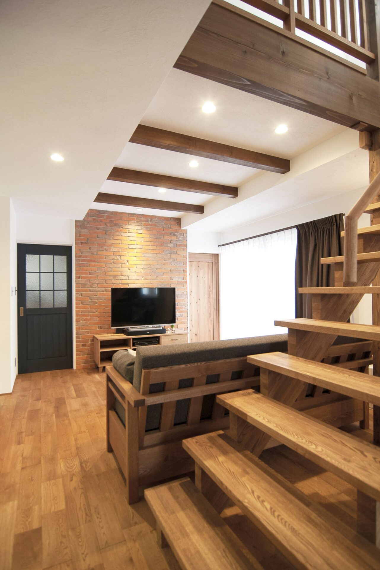 TV背面のアクセントウォールもみずほ展示場を参考に施工し、ヴィンテージ感たっぷり。映画観賞が好きな夫のお気に入りの場所となりました。