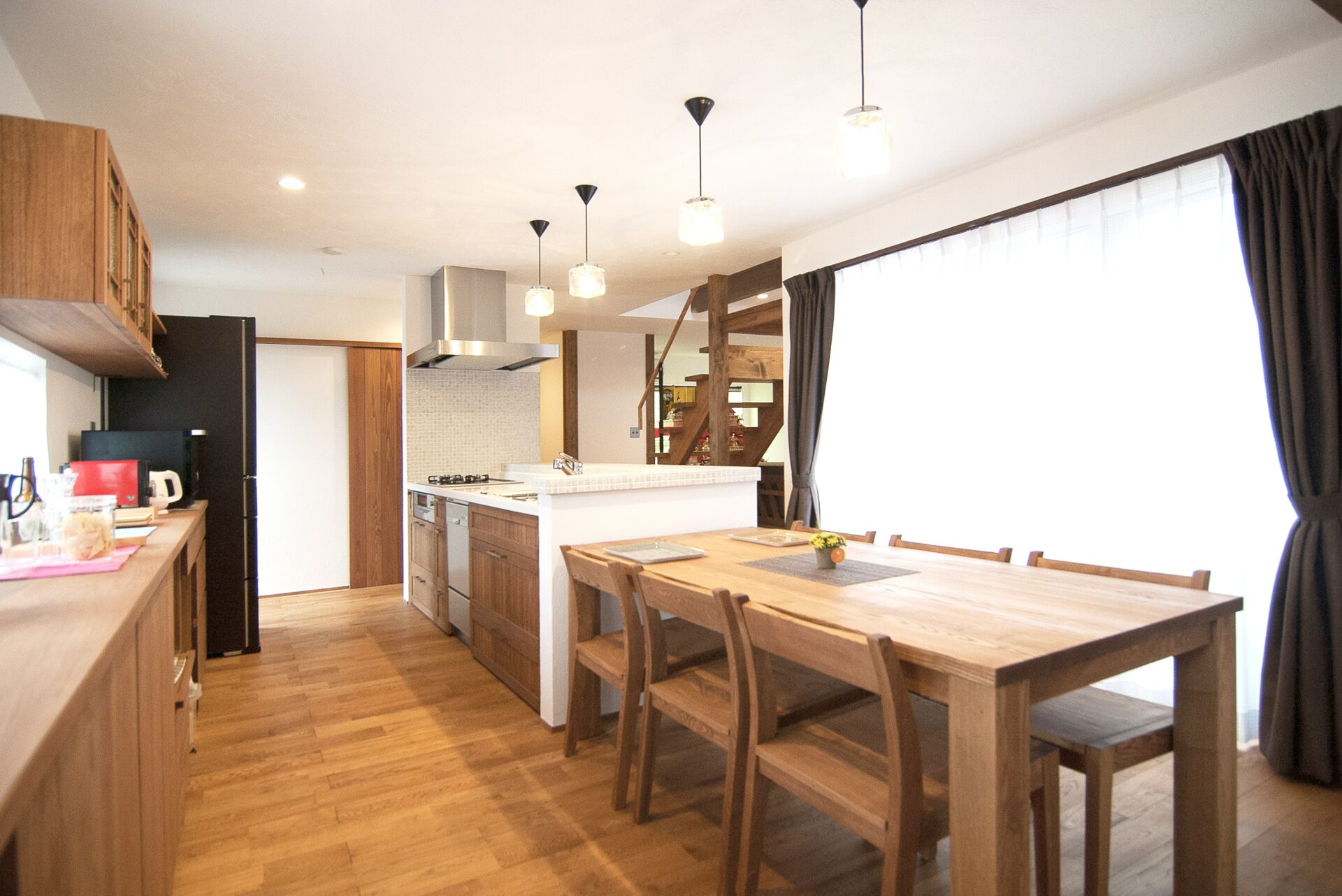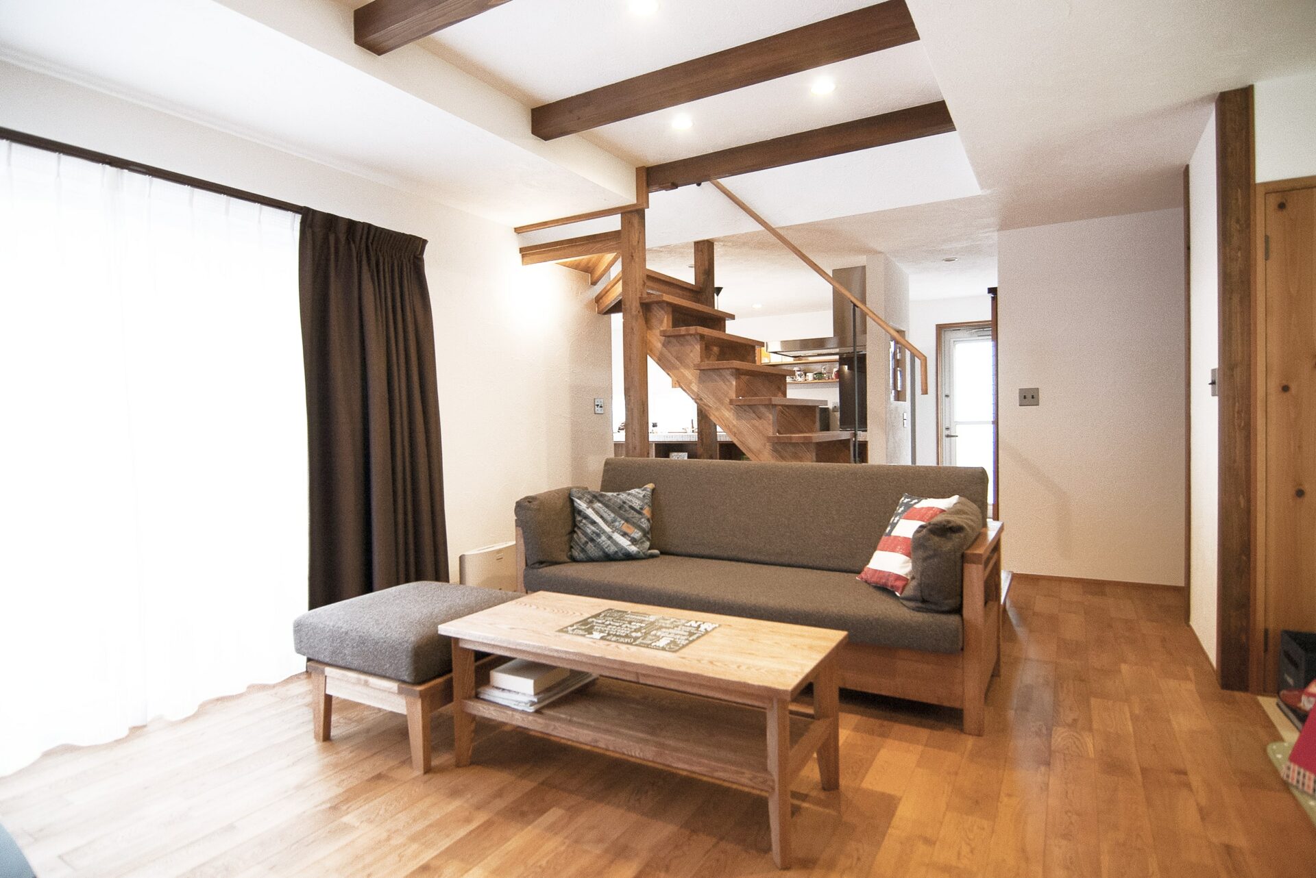 弊社造作の無垢家具にストリップ階段。洗練されたデザインでしっとりとした落ち着けるヴィンテージ感を感じさせます。