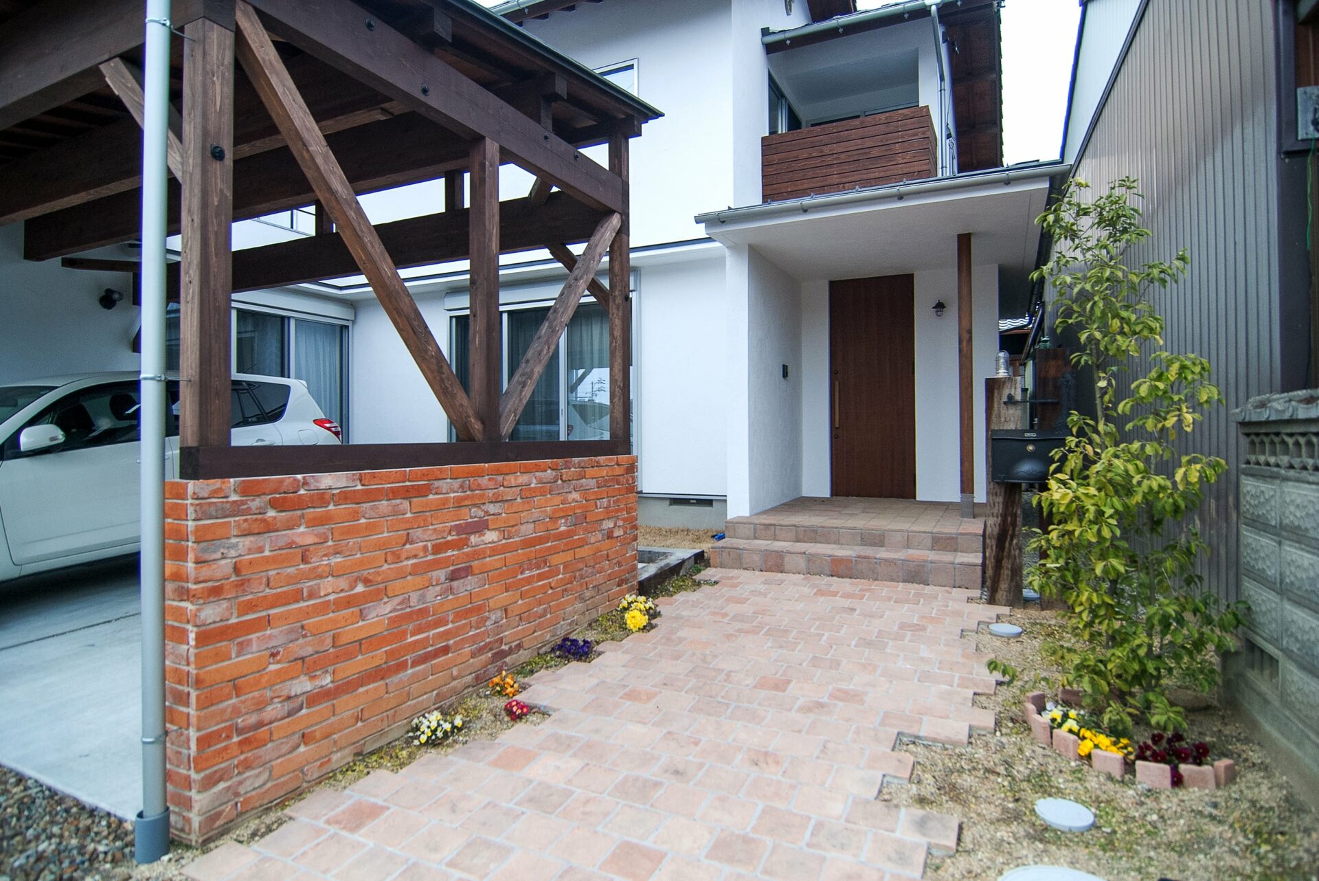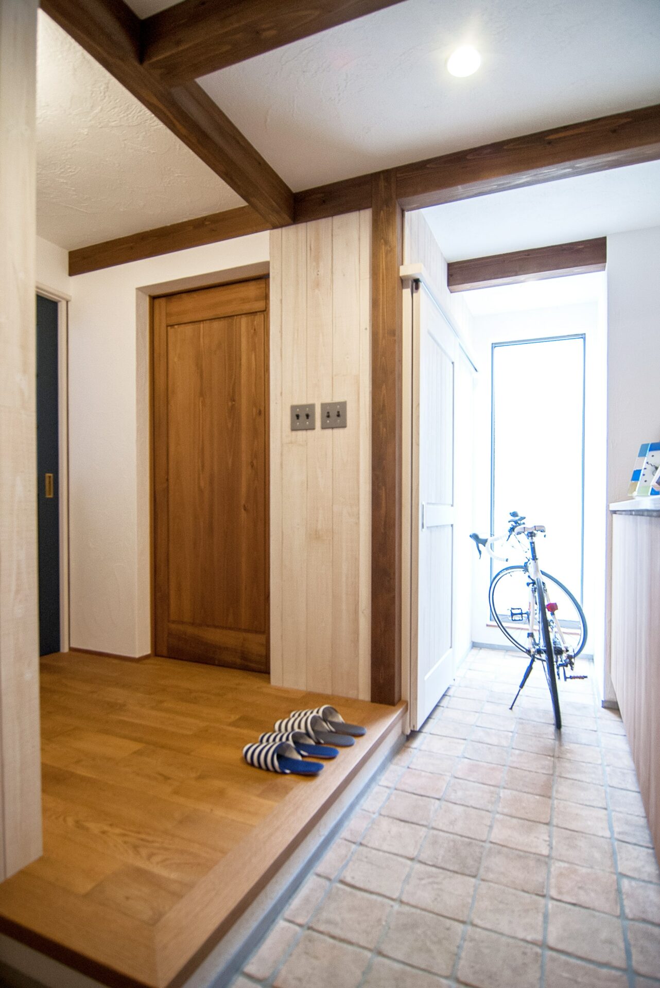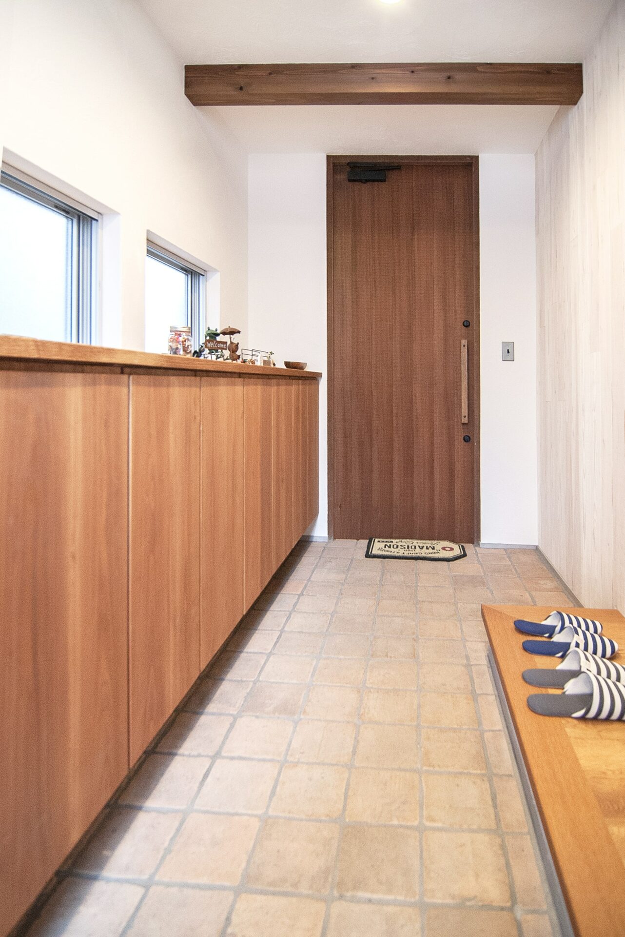 玄関のアクセントの大きなダークブラウンの梁。広く長い玄関土間に、物で溢れがえりがちな玄関をスッキリさせるクロークもあり、おしゃれで機能性も抜群です。「みずほ展示場を基に、より自分達にとって暮らしやすくしてもらいました」とF様。