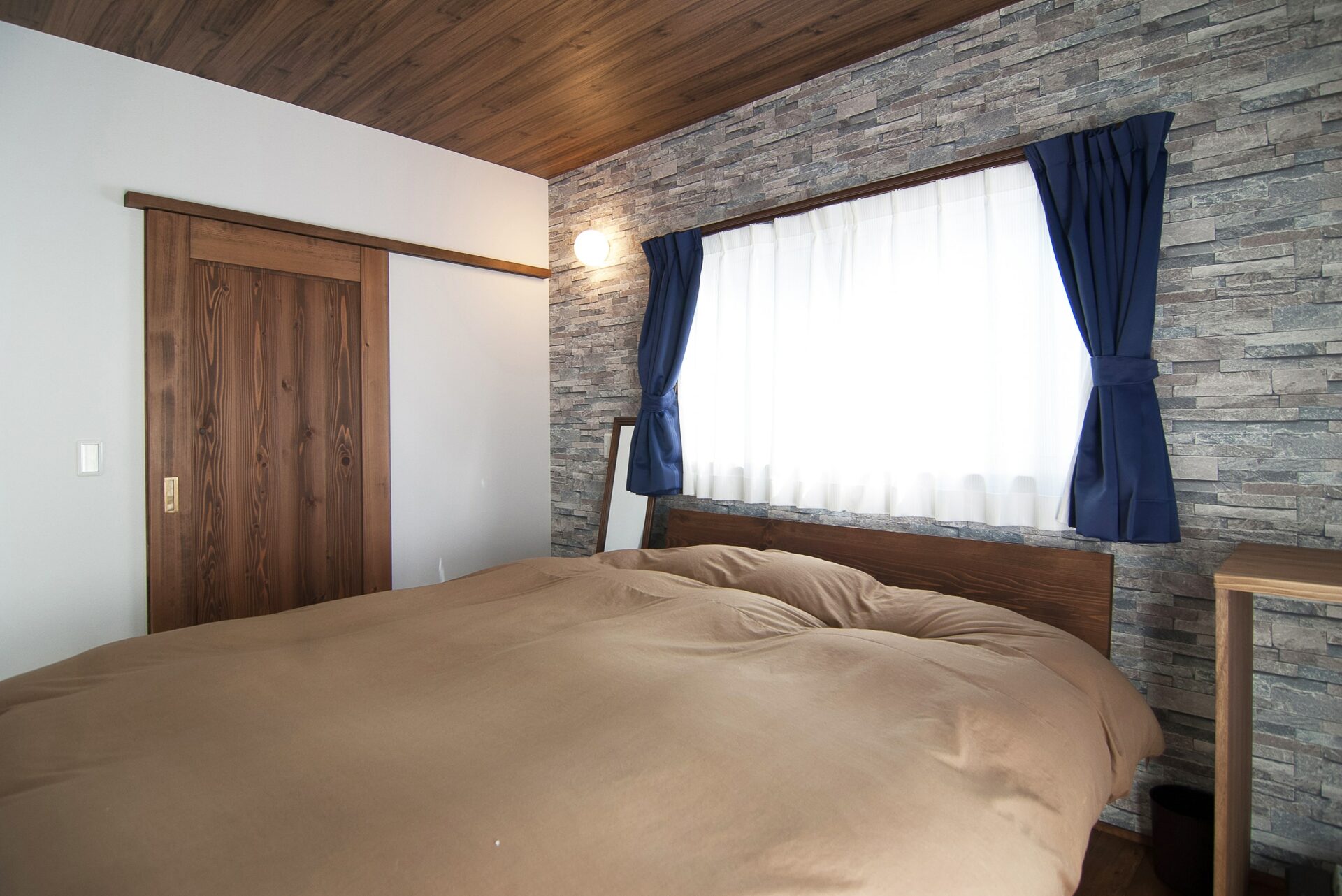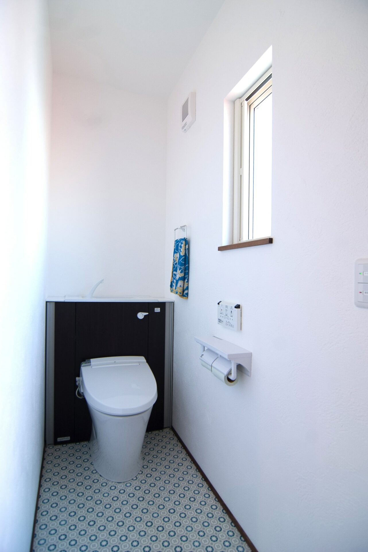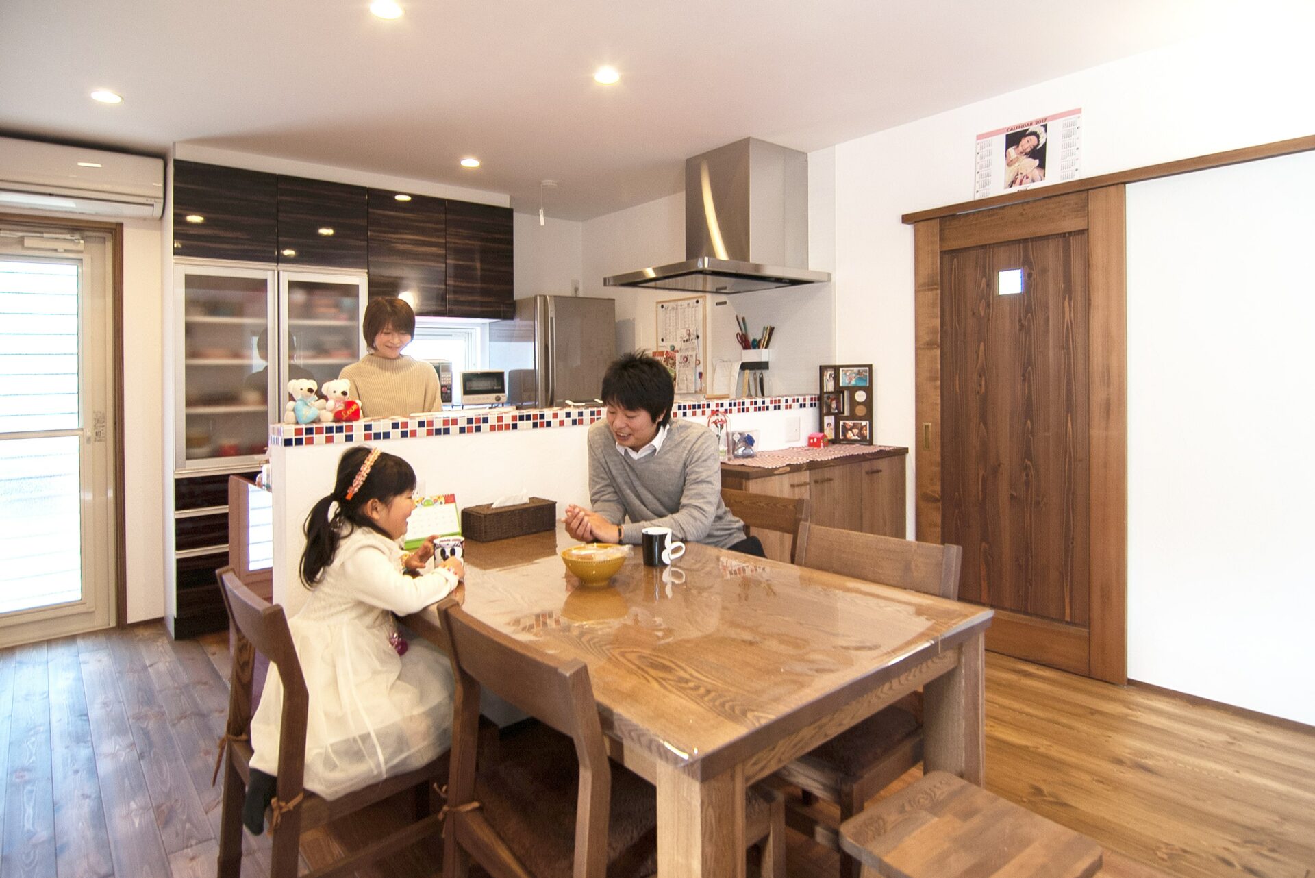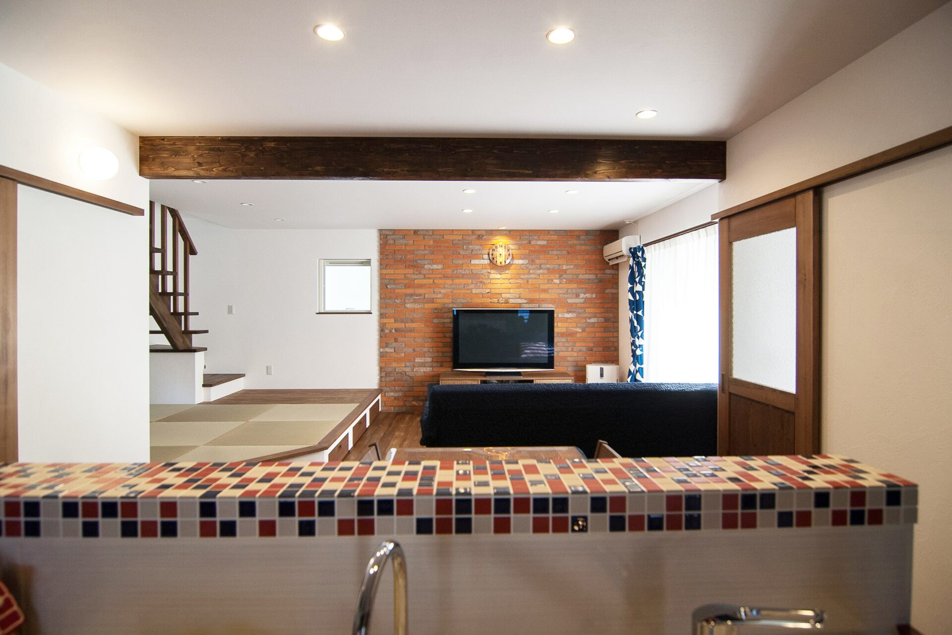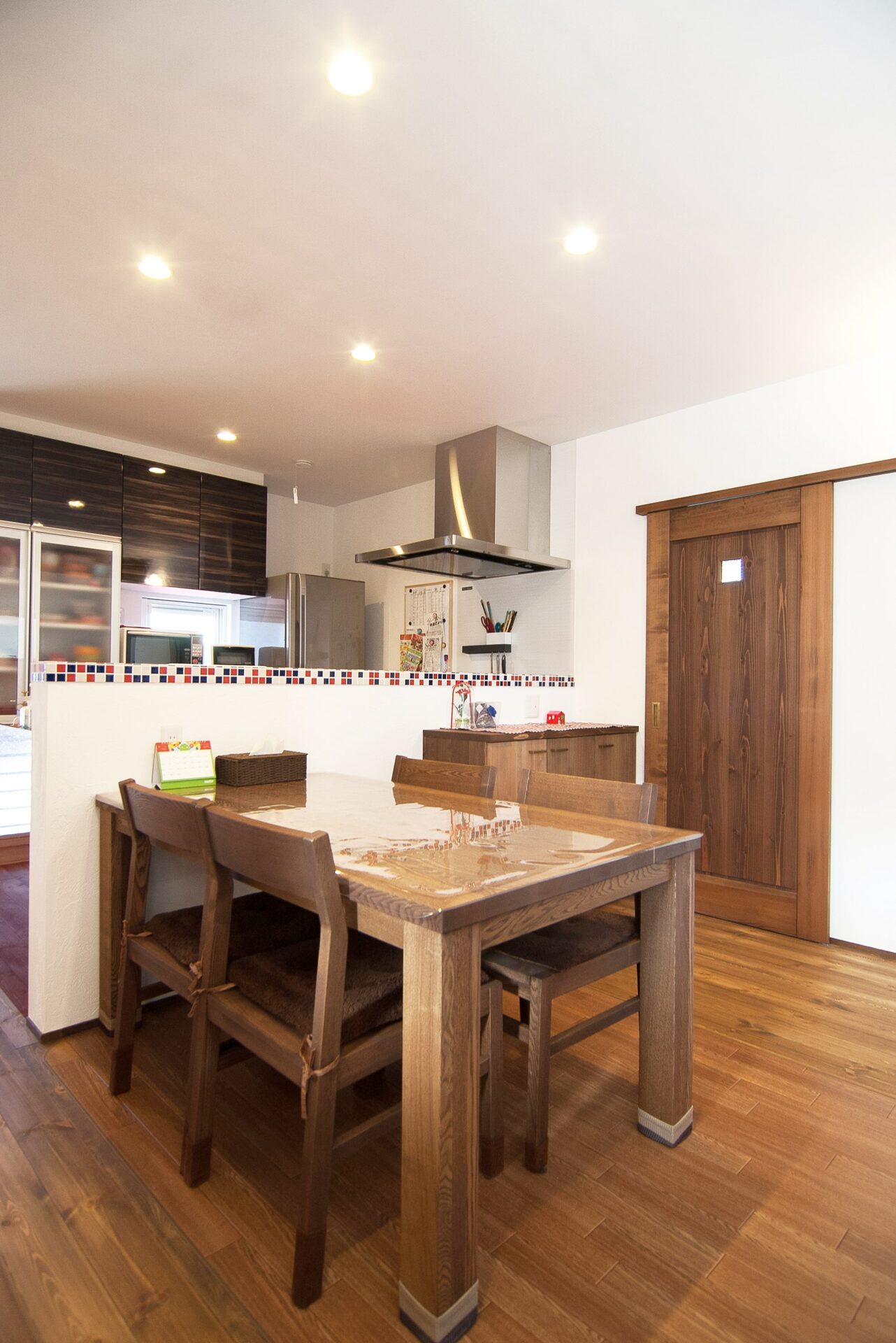 キッチンカウンターには奥様の大好きな配色のタイル、二階の寝室と子ども室は壁紙で遊ぶなど、自由なインテリアを実現しました。