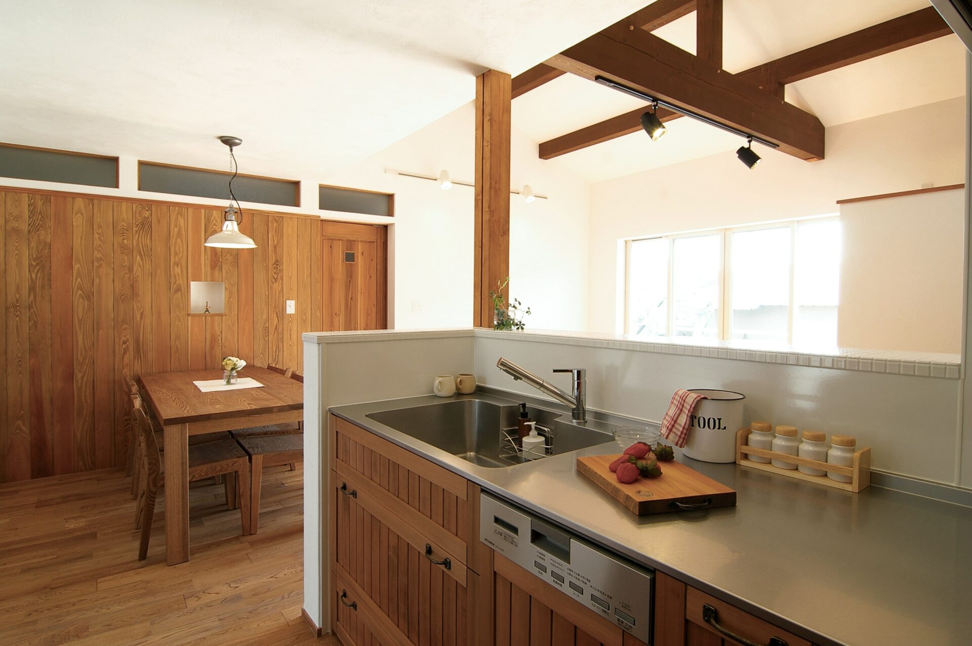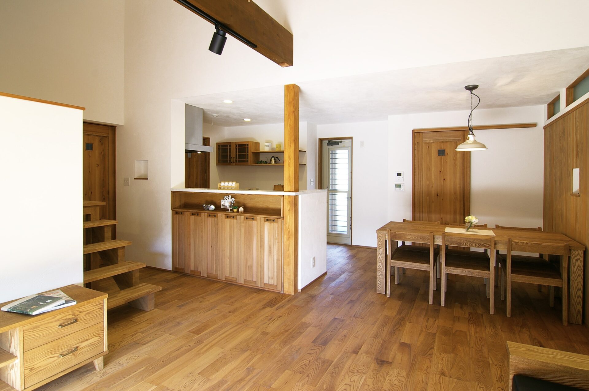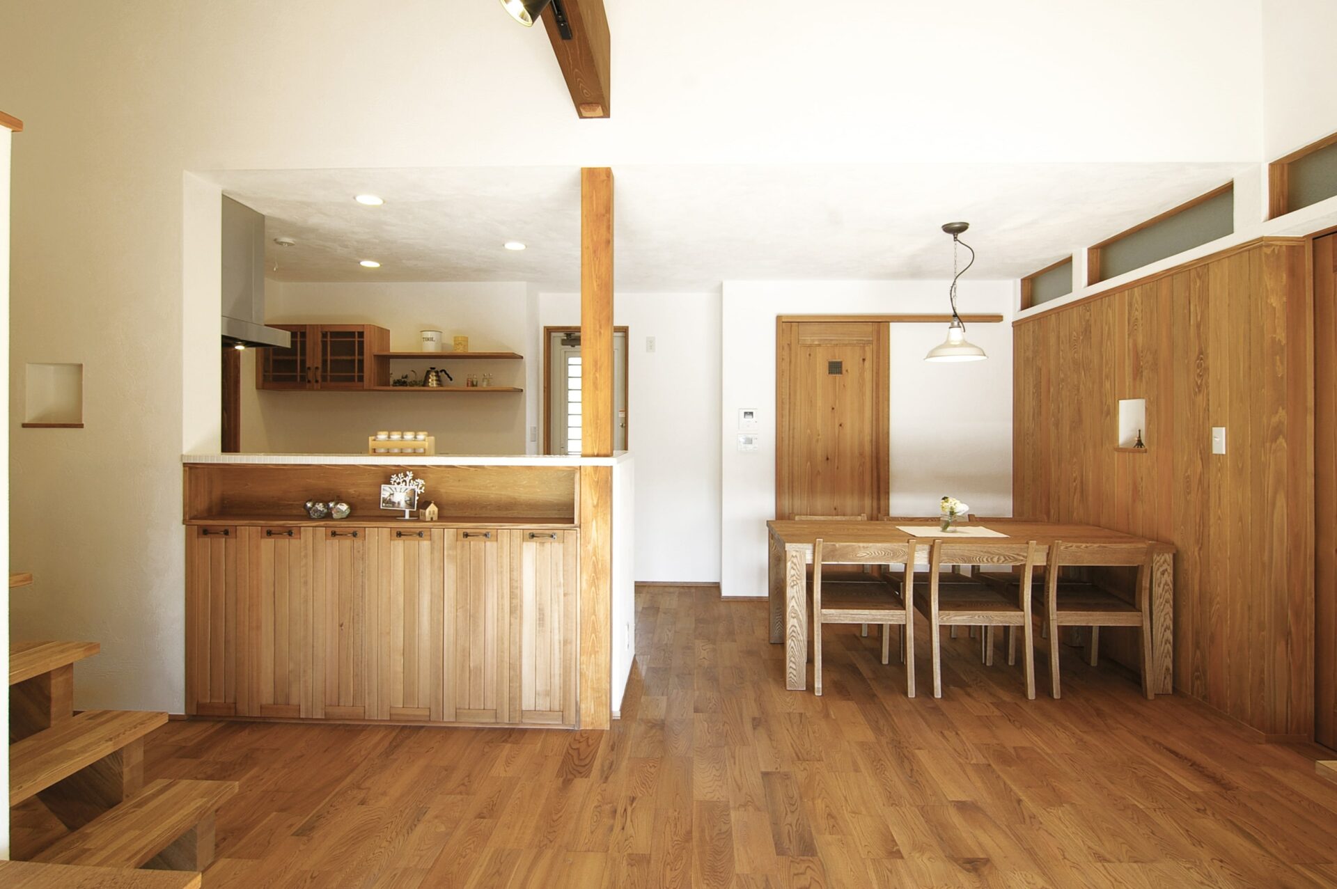大きな梁とスキップフロアの階段が伸びるLDKが特長的な平屋の自然素材の家です。ダイニングの一面を無垢の板貼りでアンティーク調に。