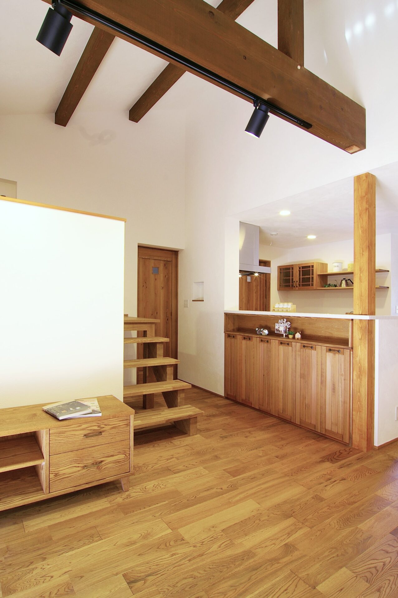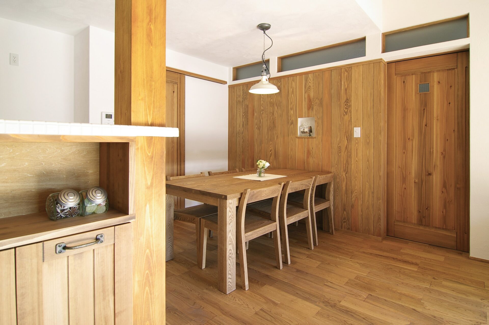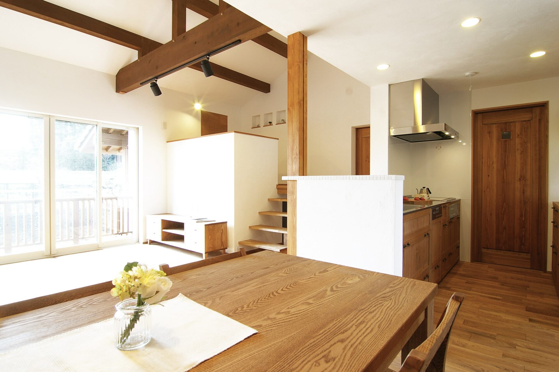 大きな梁とスキップフロアの階段が伸びるLDKが特長的な平屋の自然素材の家です。ダイニングの一面を無垢の板貼りでアンティーク調に。
