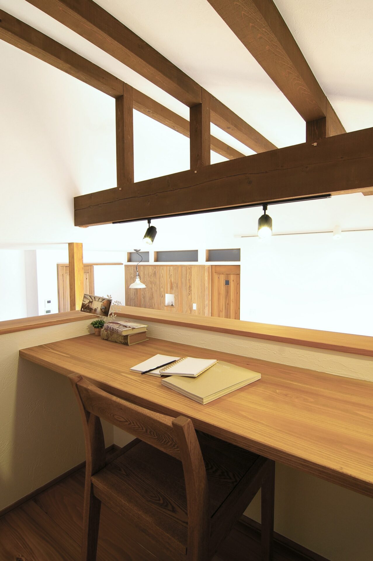 小上がりのカウンターデスクから見える勾配天井とダイナミックな梁はモダンな雰囲気。大きな窓から採光がたっぷり入り、いつも明るいLDKに。