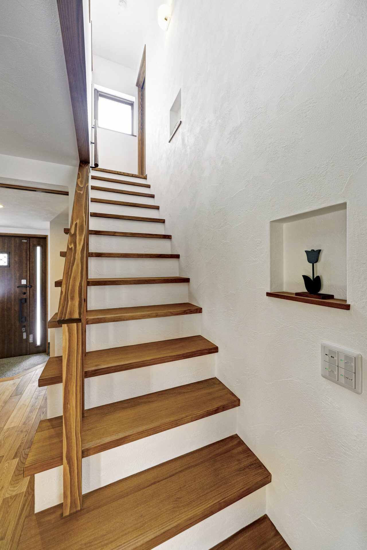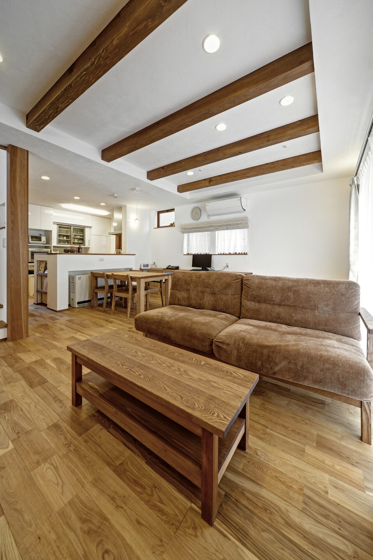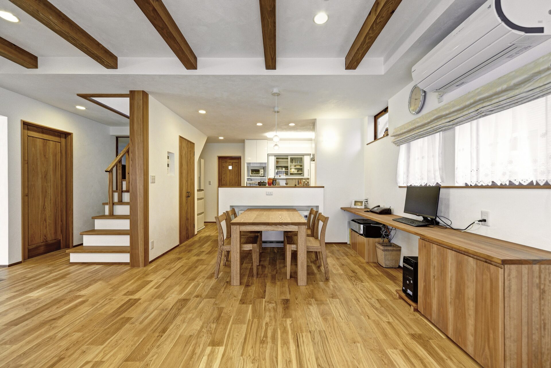 春日井市のM様邸は、オーガニックカフェのような優しい雰囲気の自然素材の家です。無垢材のフローリングは素足で歩いてもベトベトせず心地よいのが特徴です。外壁にも内壁にも使う漆喰壁。その質感と白さが魅力ですが、消臭効果もあるのでお部屋のニオイを和らげてくれます。