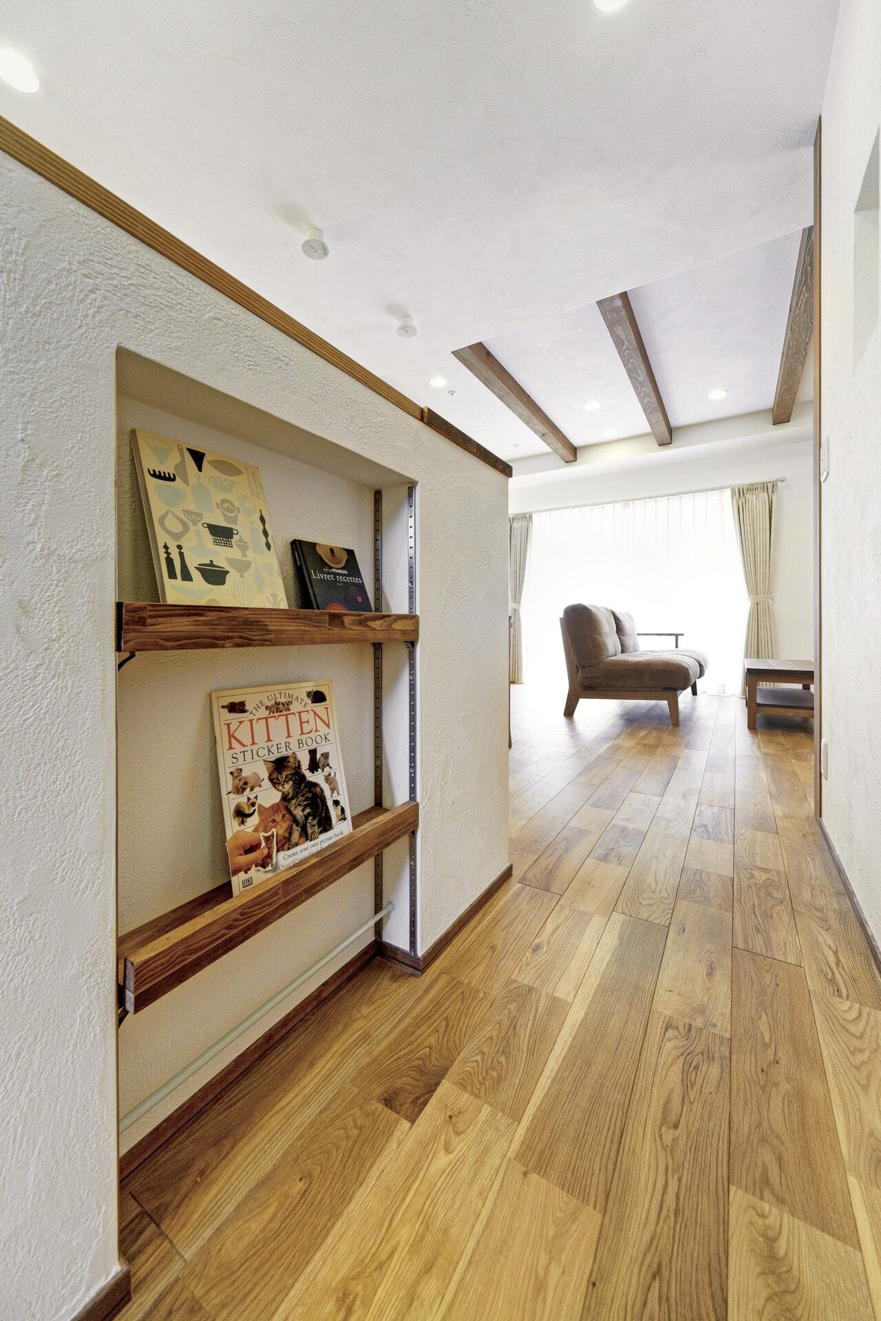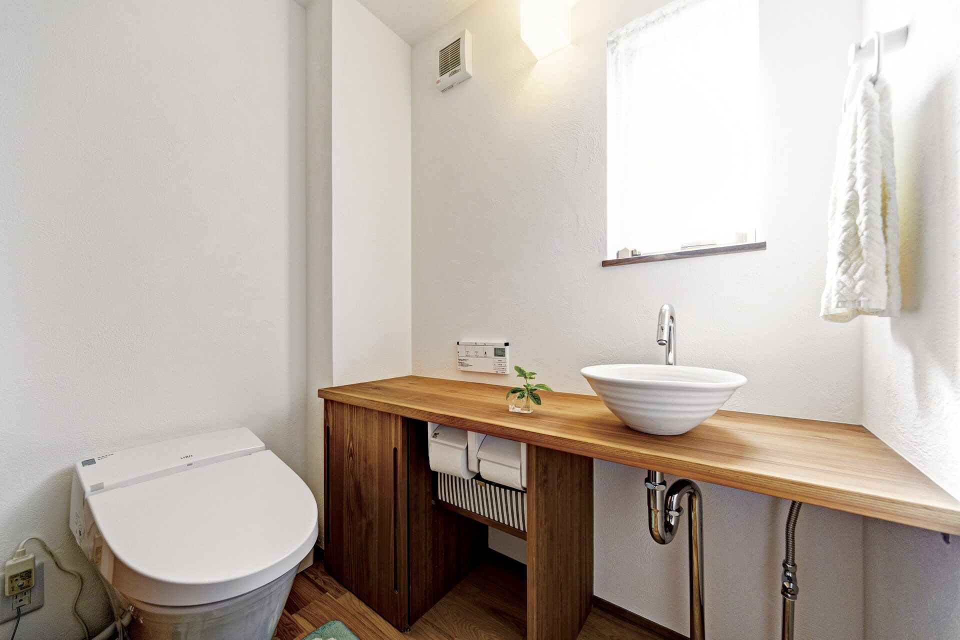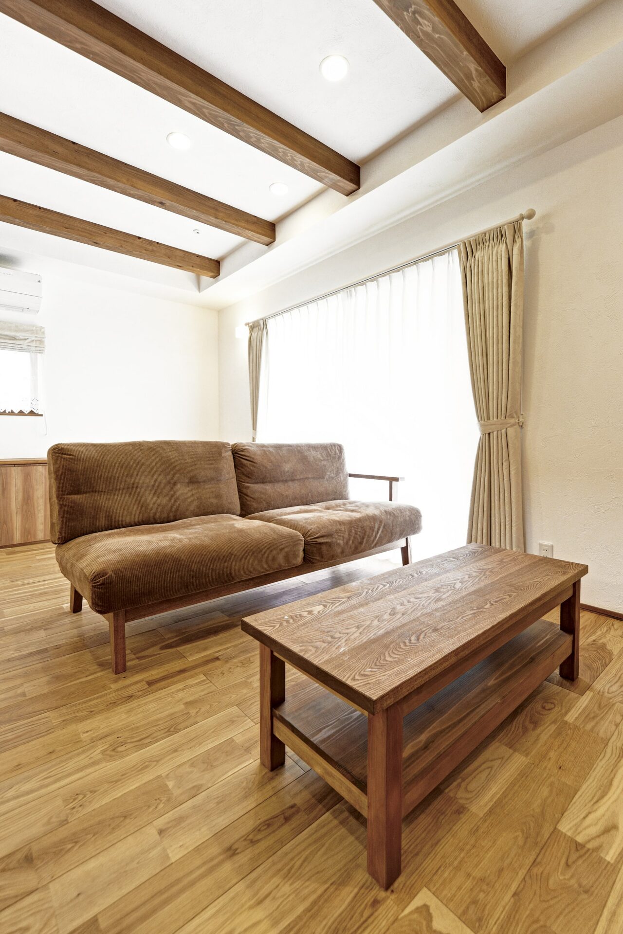 春日井市のM様邸は、オーガニックカフェのような優しい雰囲気の自然素材の家です。無垢材のフローリングは素足で歩いてもベトベトせず心地よいのが特徴です。外壁にも内壁にも使う漆喰壁。その質感と白さが魅力ですが、消臭効果もあるのでお部屋のニオイを和らげてくれます。