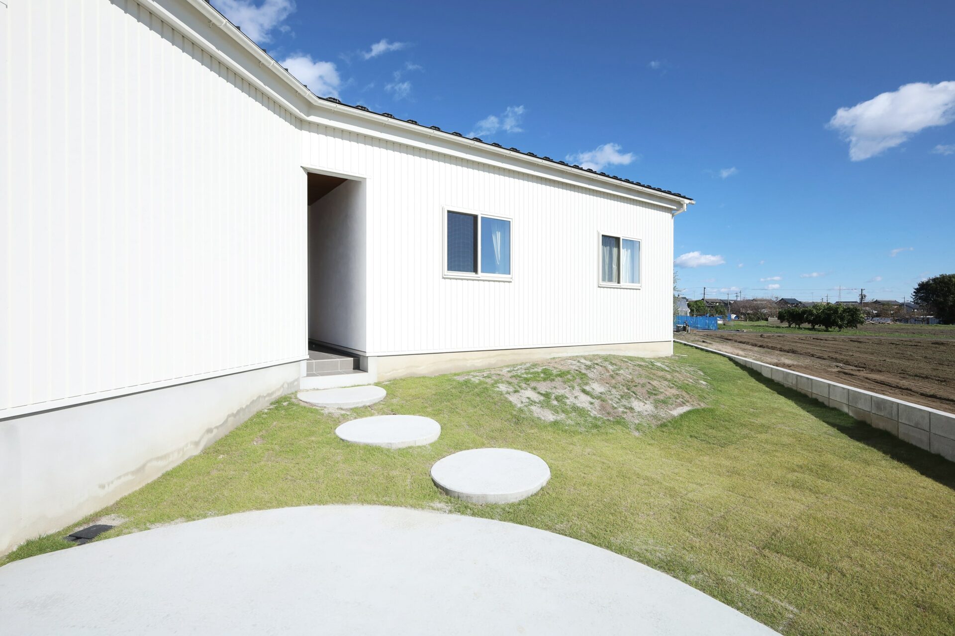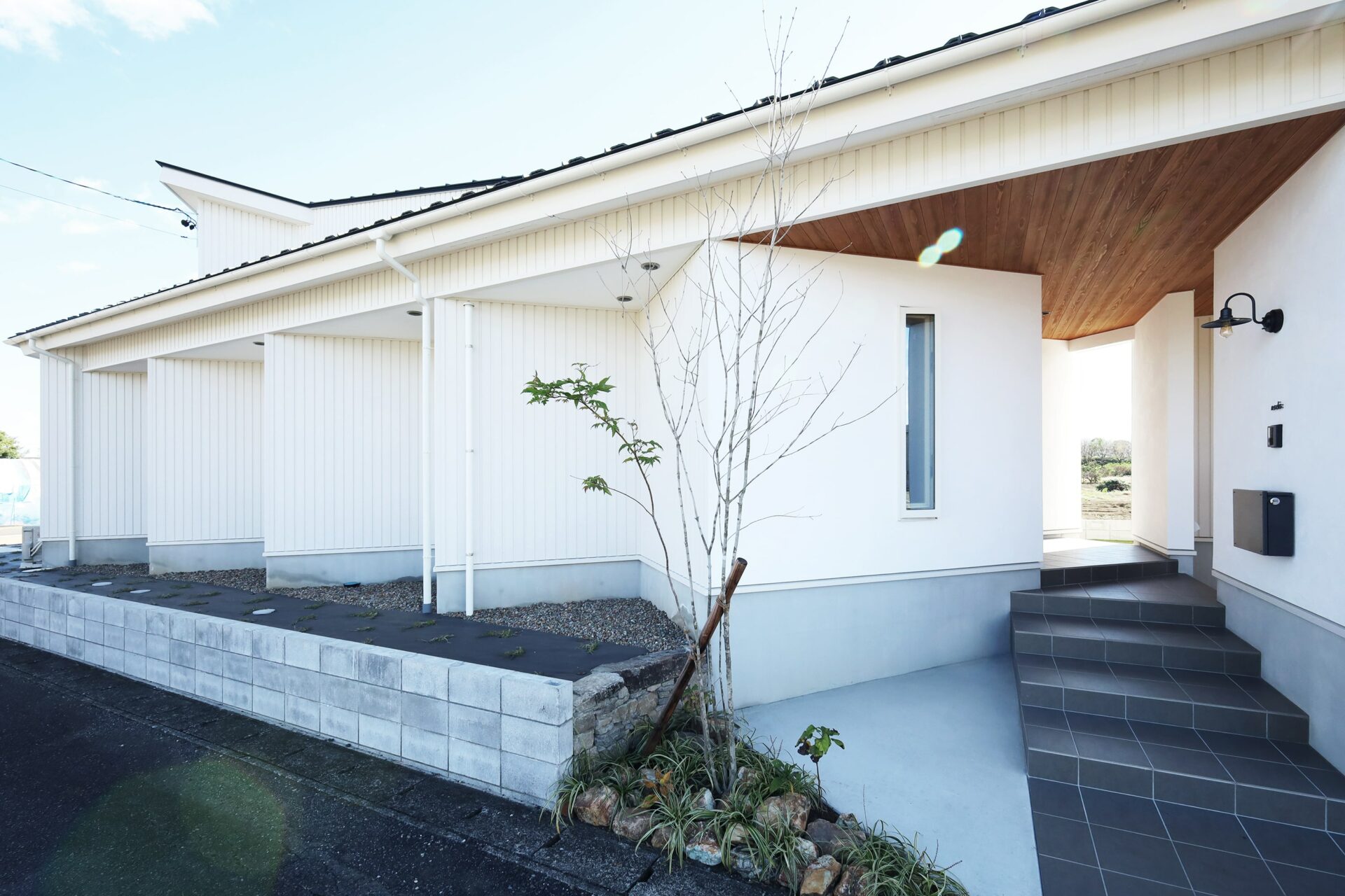 全体は白ガルバリウムにし玄関まわりは漆喰壁を採用。カクカクとした外観から生み出されるタテ・ヨコのラインが建物に奥行き感とスタイリッシュな印象を与えています。