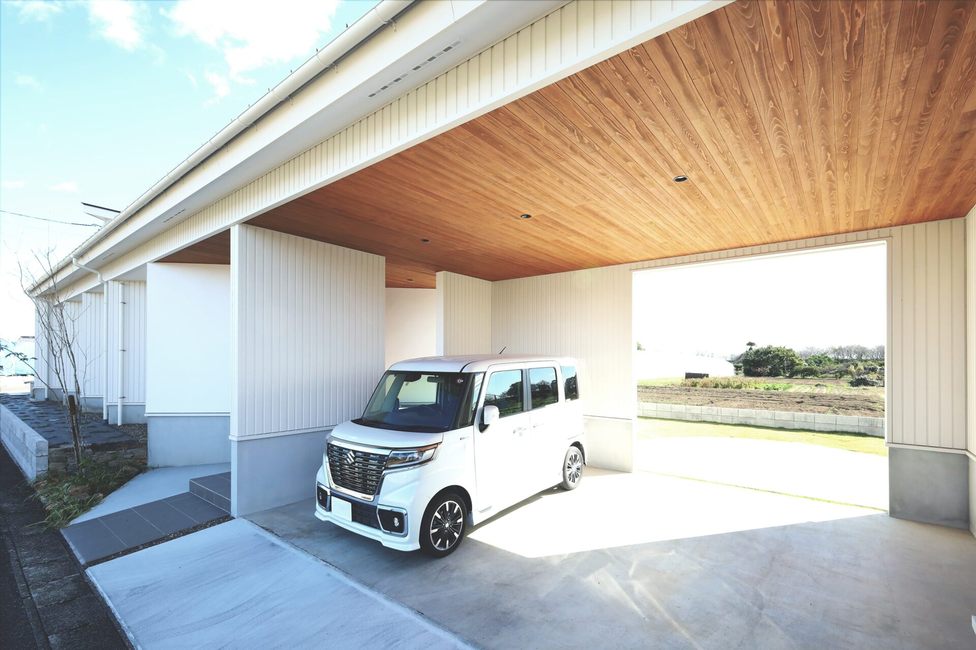 車2台が駐車できるインナーガレージは雨に濡れず家に入ることができます。ガレージ天井はアクセントで杉板張りにしました。
