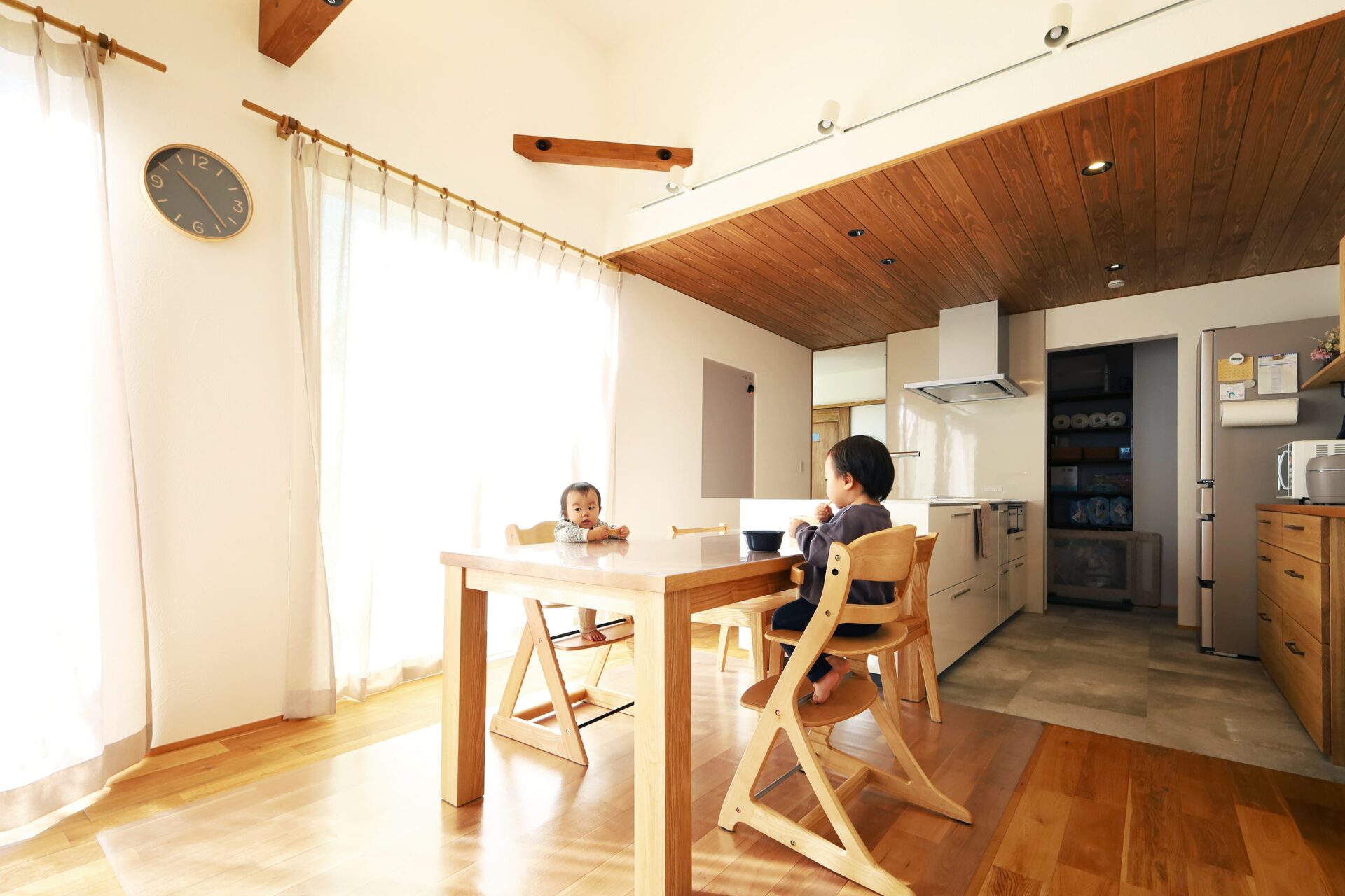 キッチンと横並びのダイニングはオリジナル造作家具。