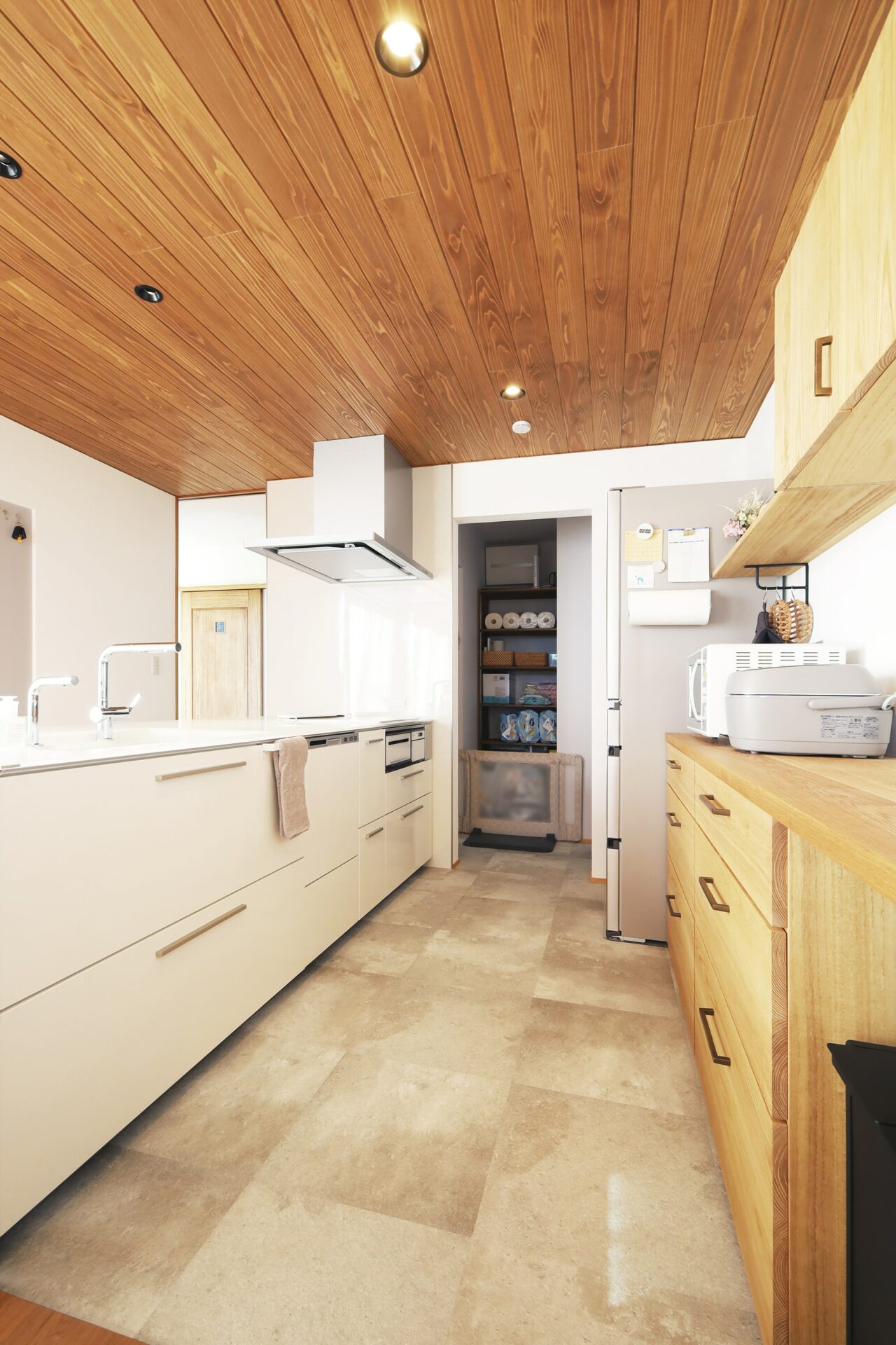 奥様お気に入りのキッチンは毎日の料理が楽しくなったと話してくれます。キッチン背面収納はオリジナル造作家具。