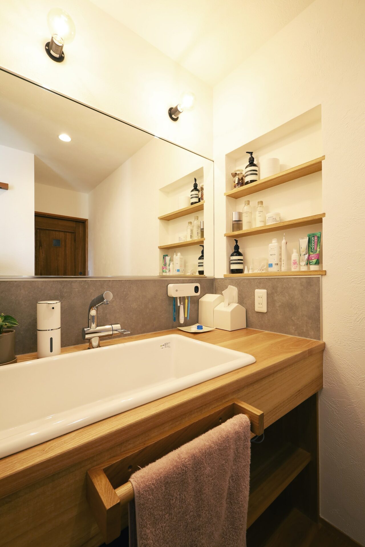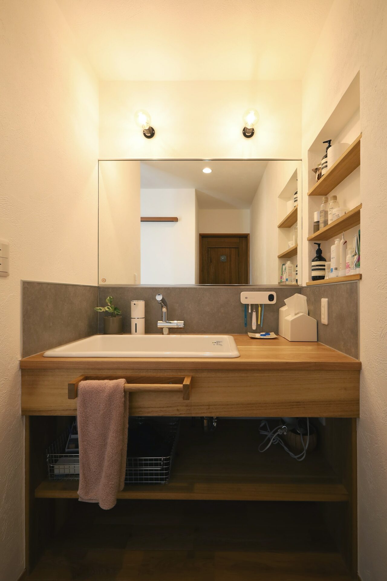 洗面化粧台はオリジナル造作家具。横壁いっぱいの鏡はお施主様のこだわり。