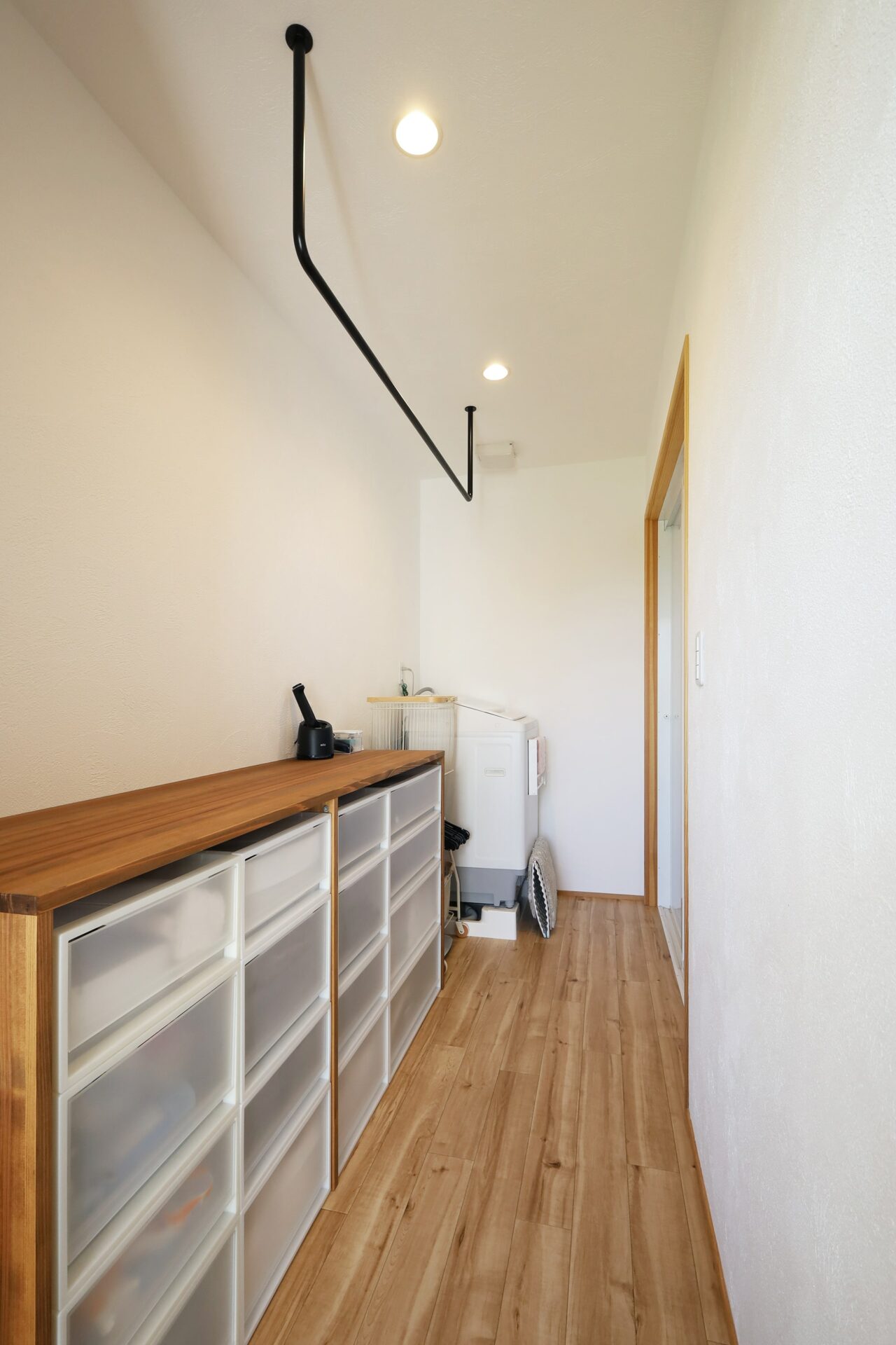 脱衣所には造作の作業台を設置。既製品の引き出しがピッタリ収まるサイズにオーダーできます。