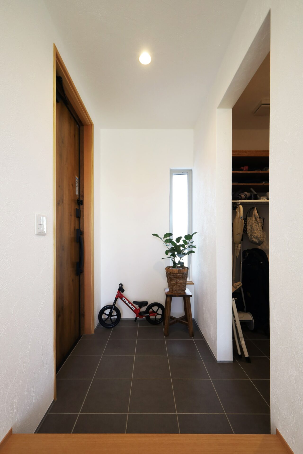 玄関には明り取りのためにスリット窓を設置。玄関収納はロールカーテンで隠せるようにしました。