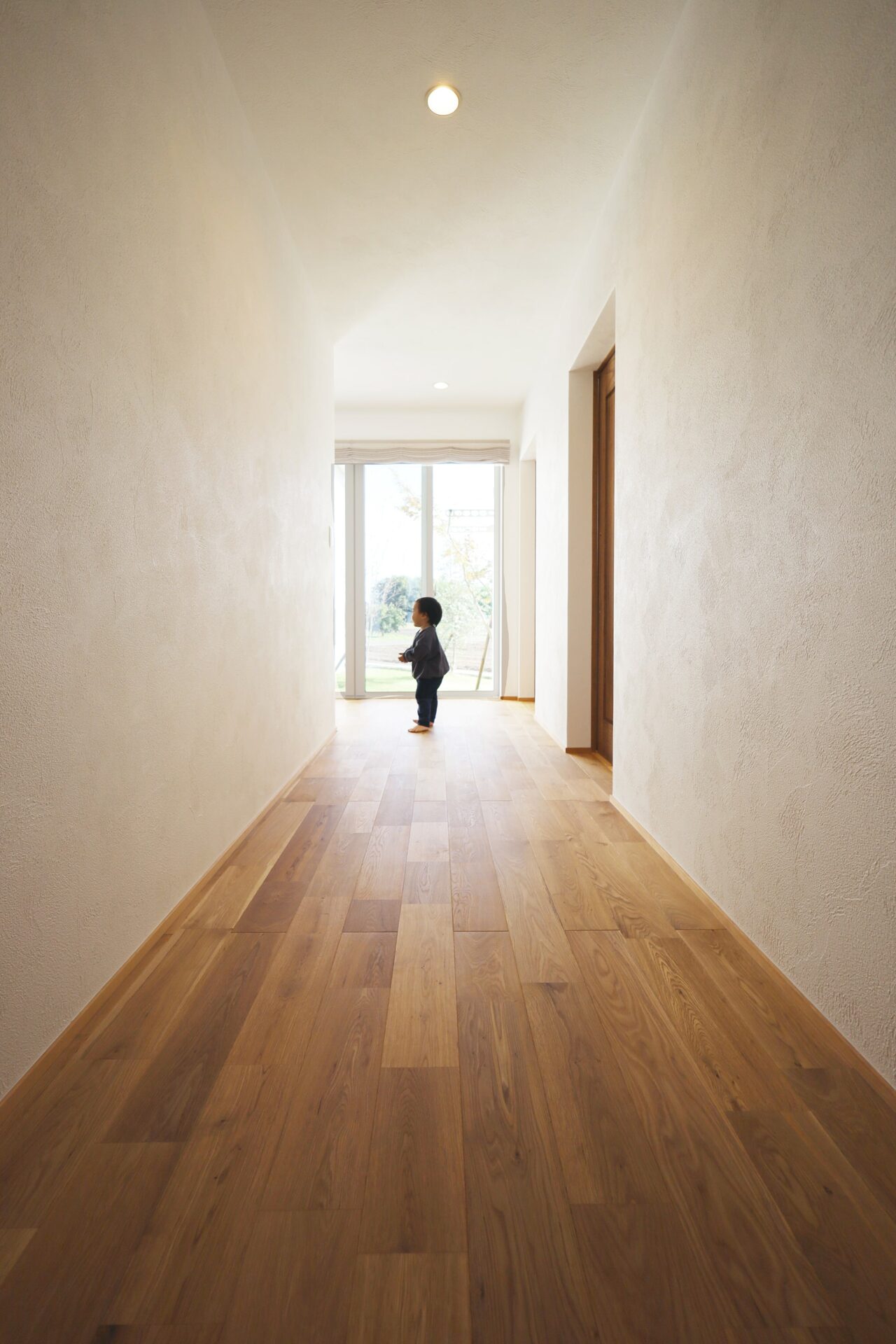 玄関から繋がる長い廊下。あえて廊下をつくり平屋だけど個々のプライベートを確保できる間取りに。