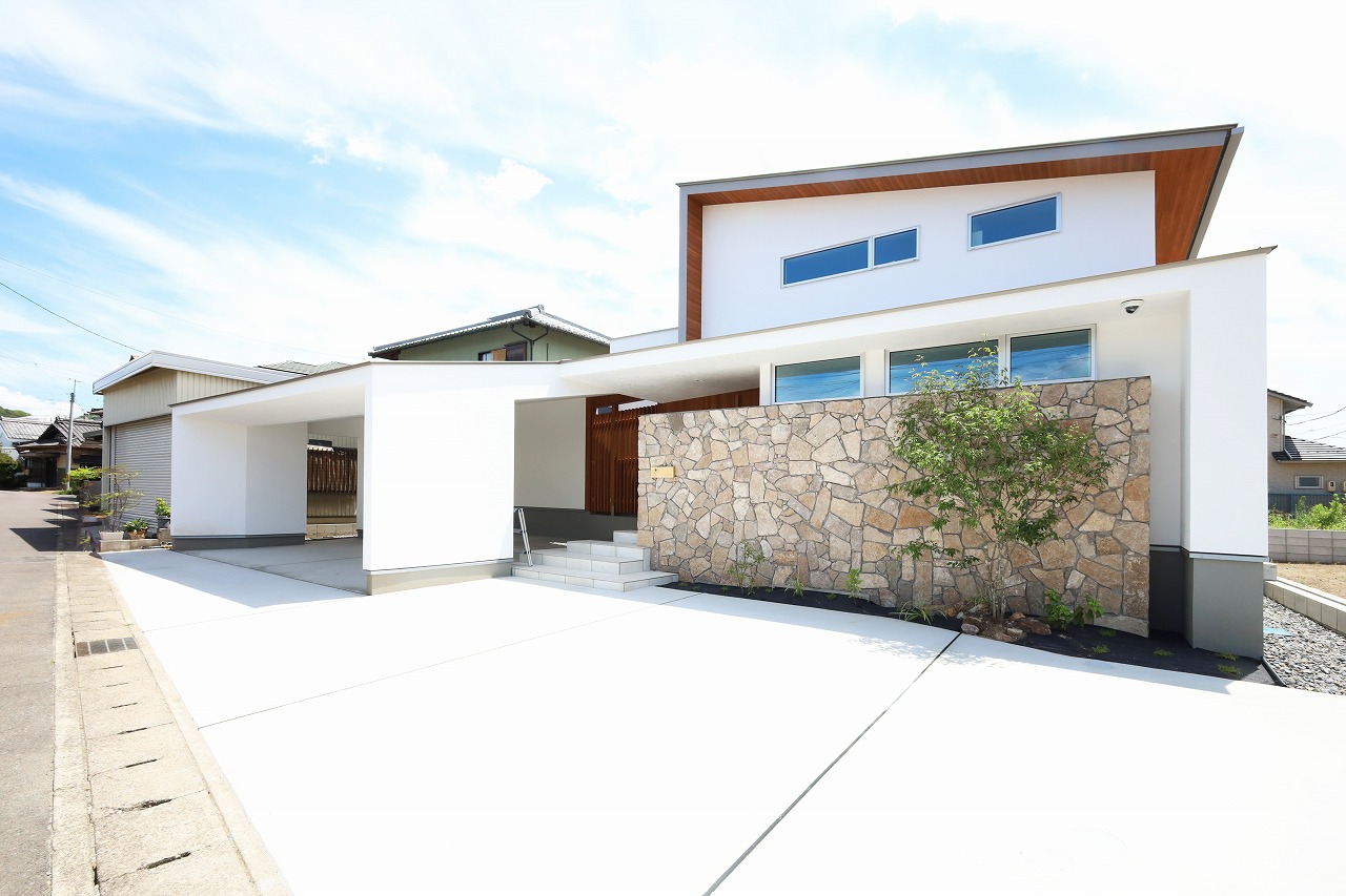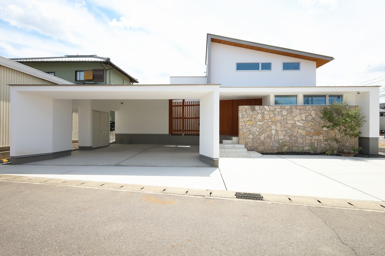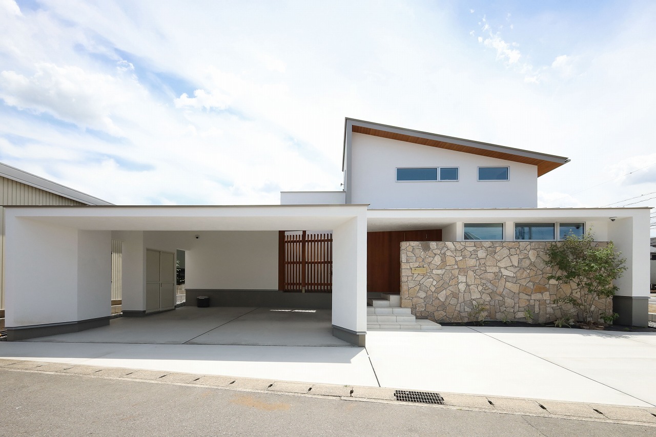大きな片流れ屋根のインナーガレージがあるシンプルで洗練された外観。漆喰のホワイトを基調に袖壁を杉無垢の板貼りでアクセントにしました。玄関扉を隠す前面の壁には天然石を貼り、外観全体の印象がより引き締まりました。