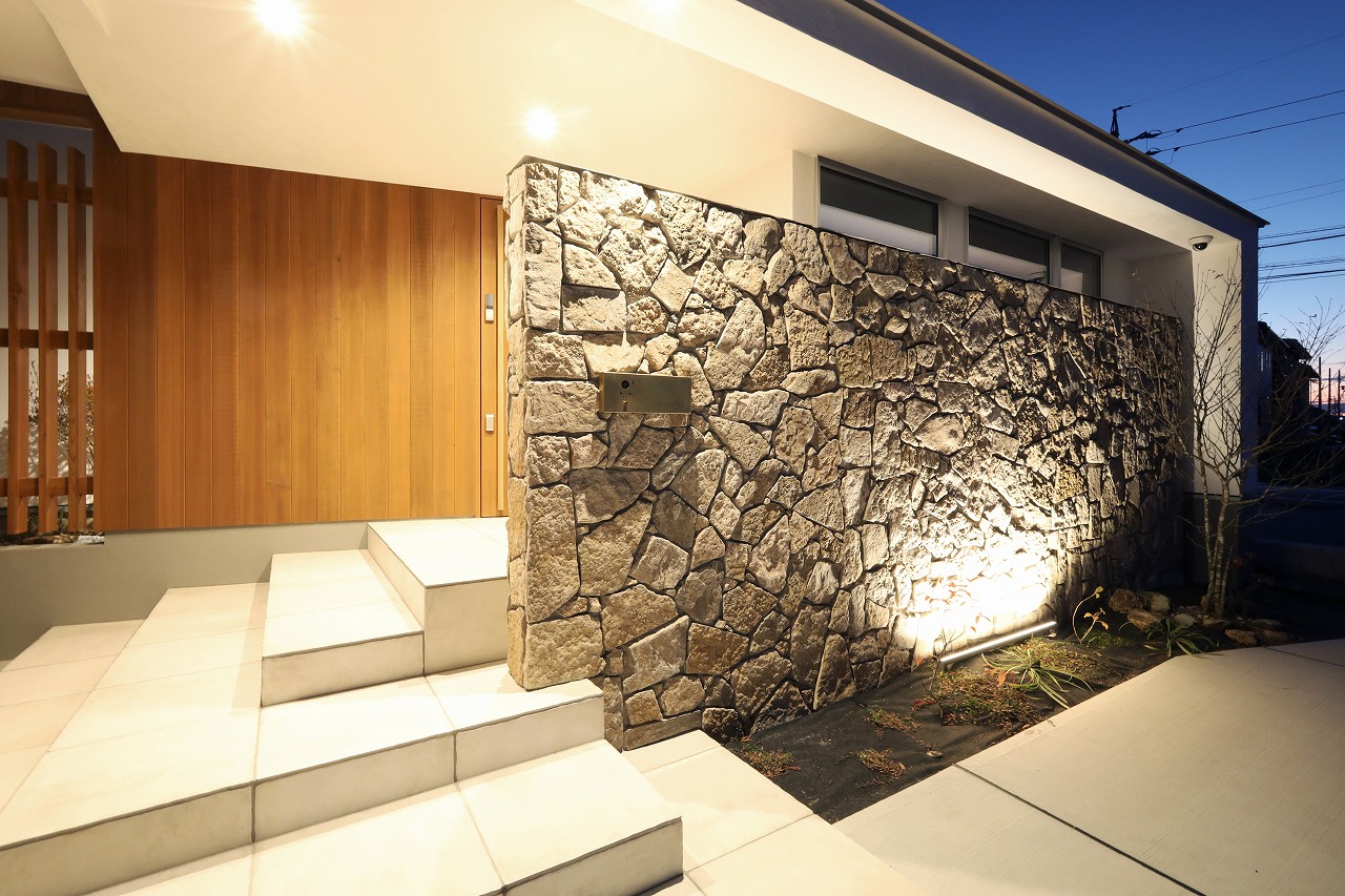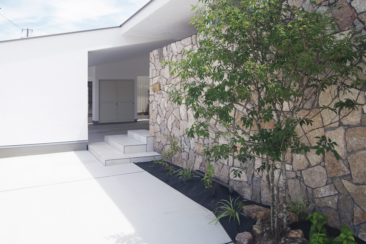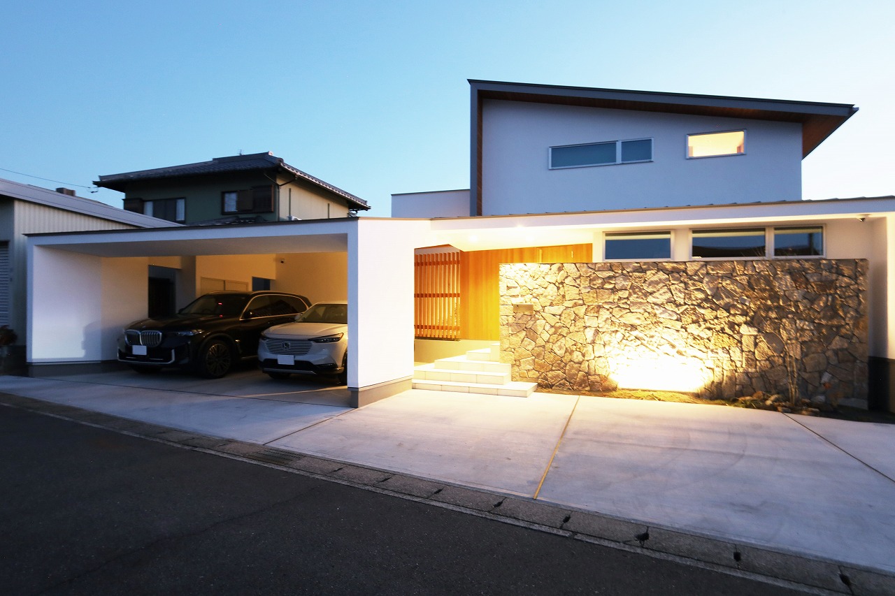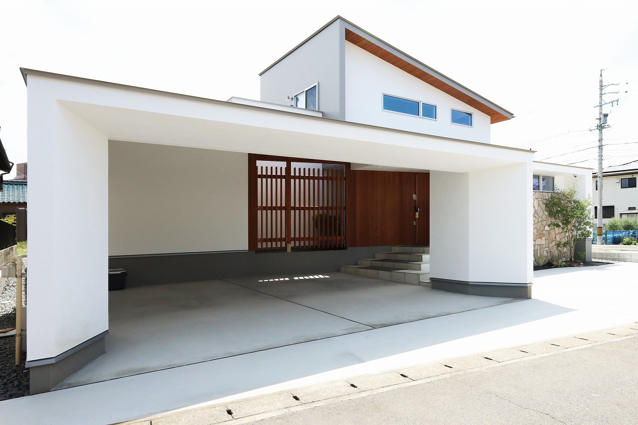 大きな片流れ屋根のインナーガレージがあるシンプルで洗練された外観。漆喰のホワイトを基調に袖壁を杉無垢の板貼りでアクセントにしました。玄関扉を隠す前面の壁には天然石を貼り、外観全体の印象がより引き締まりました。
