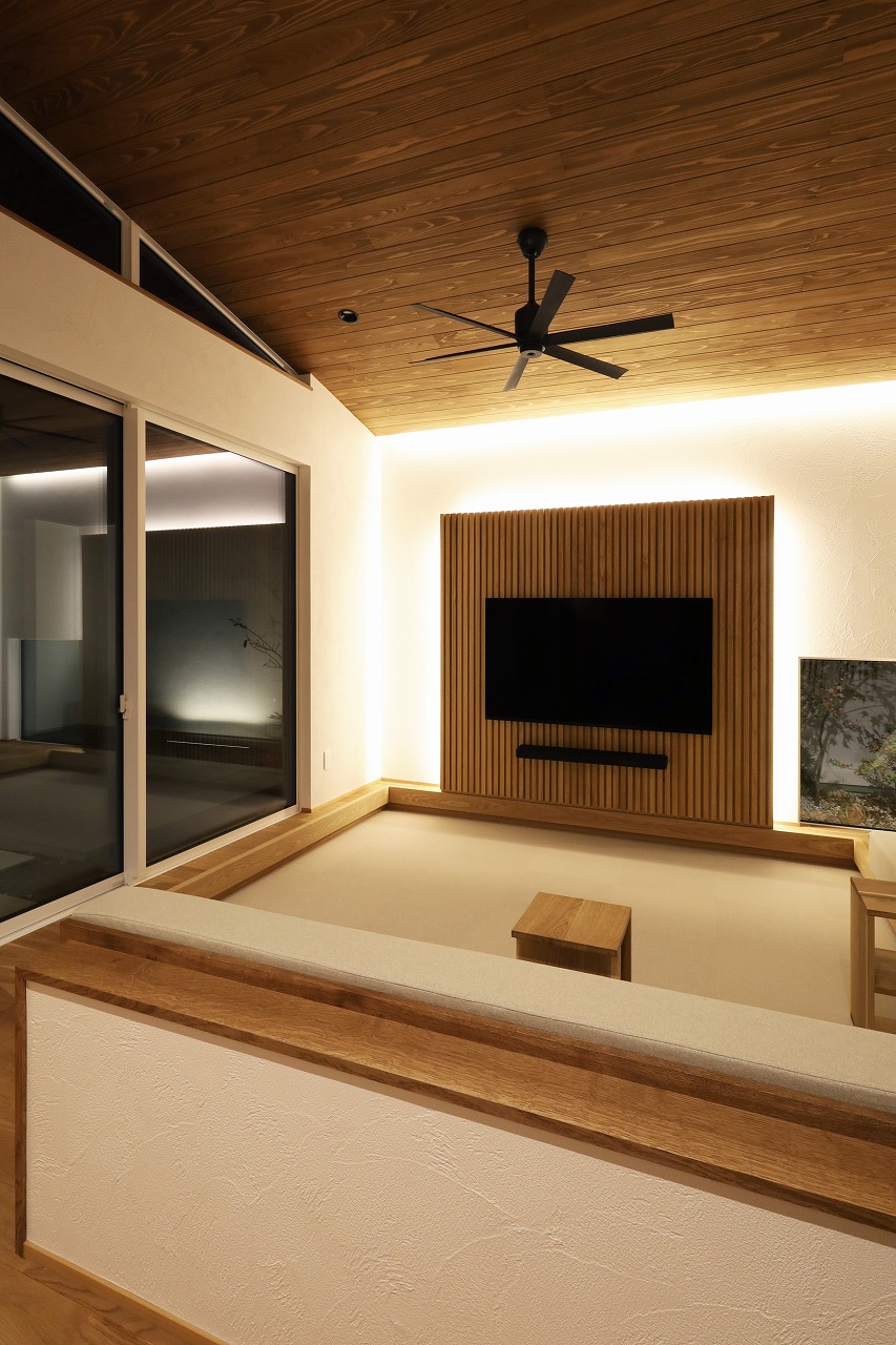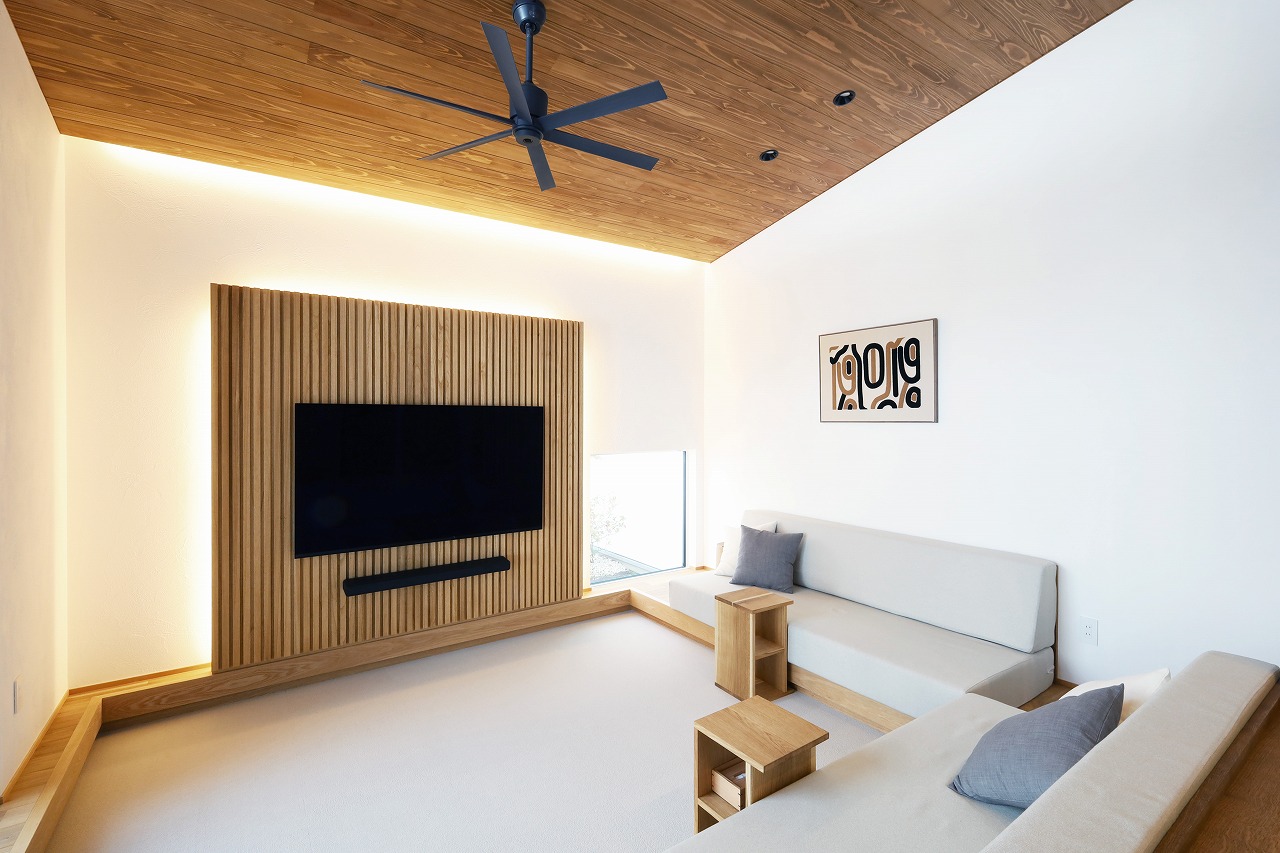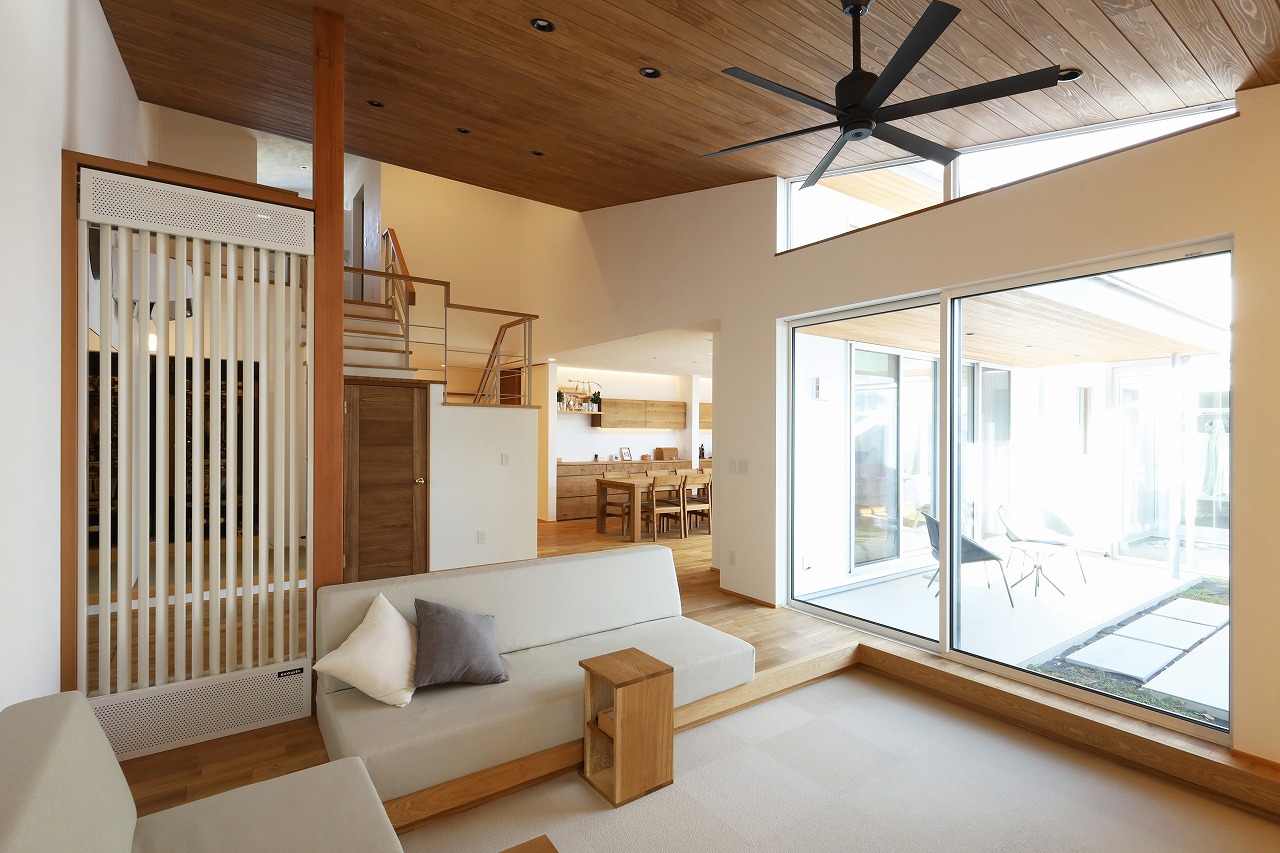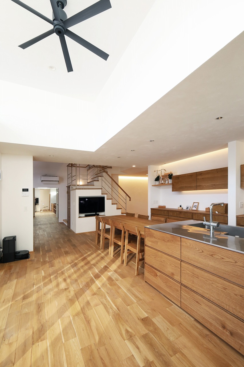 リビングは勾配天井になっており杉の無垢板をアクセントにしました。ダウンフロア部分の床はタイルカーペットを敷き、その他は全てナラの無垢床、壁は漆喰になります。また、こちらのお住まいは輻射式冷暖房パネルが設置されています。風がなく輻射熱で冷やすので、エアコンの様に冷えすぎず、エアコンが苦手な方にピッタリな冷暖房システムです。