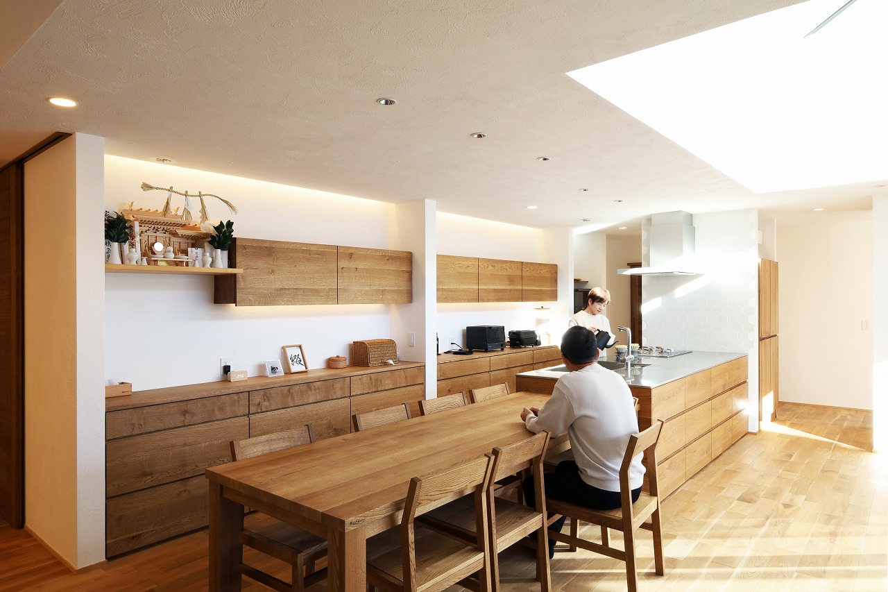 ダイニングキッチンと背面収納も無垢ストーリーのオリジナル家具。本社職人がひとつひとつ手作業でつくり取り付けます^^