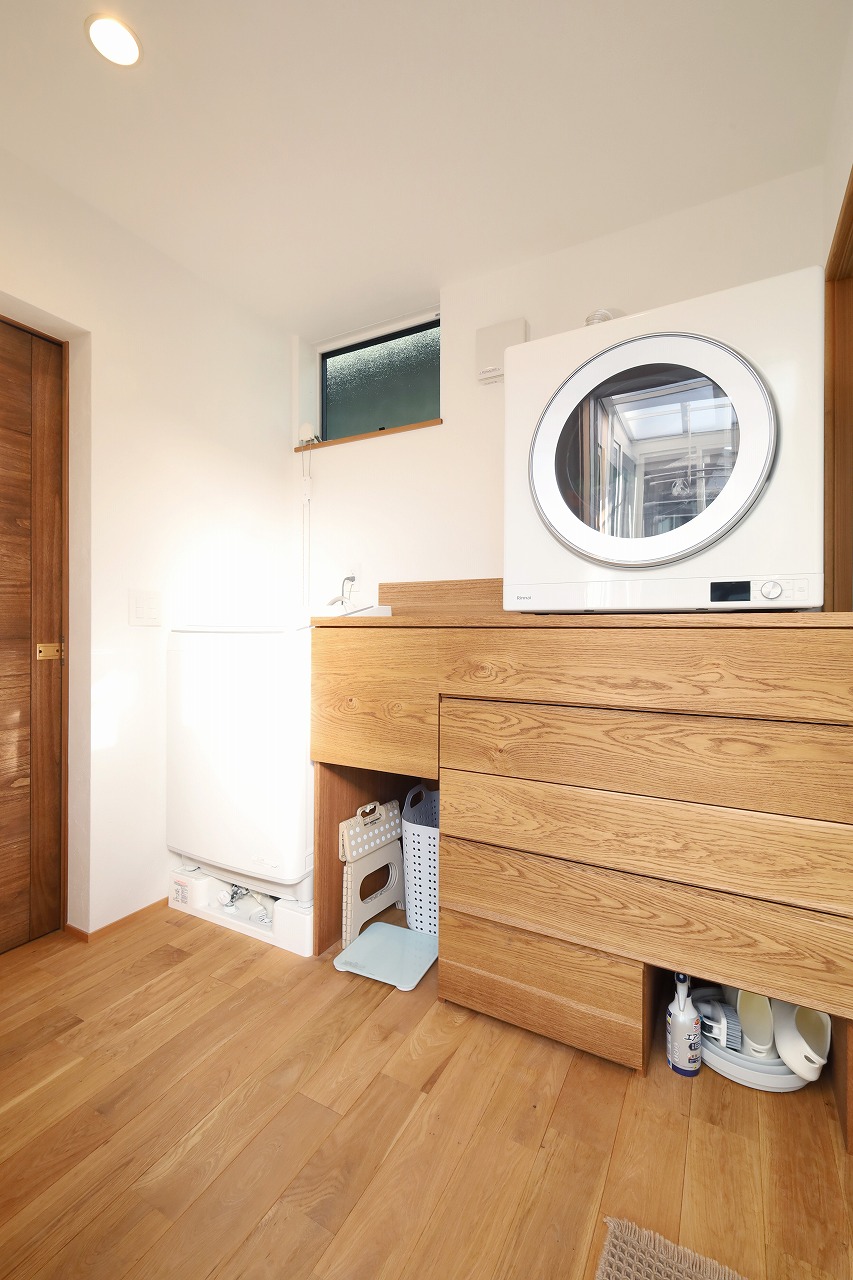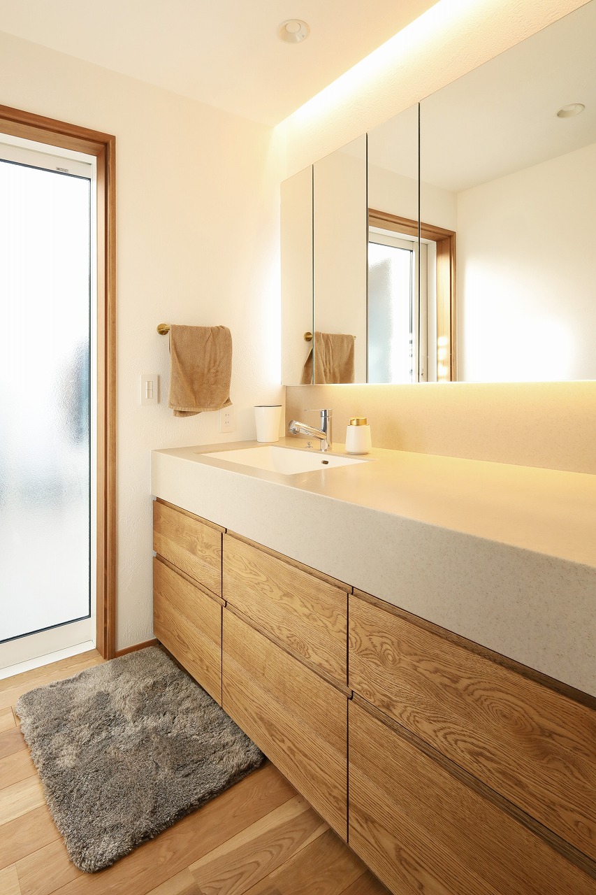 人工大理石の天板と無垢材が優しい雰囲気のオリジナル洗面化粧台。