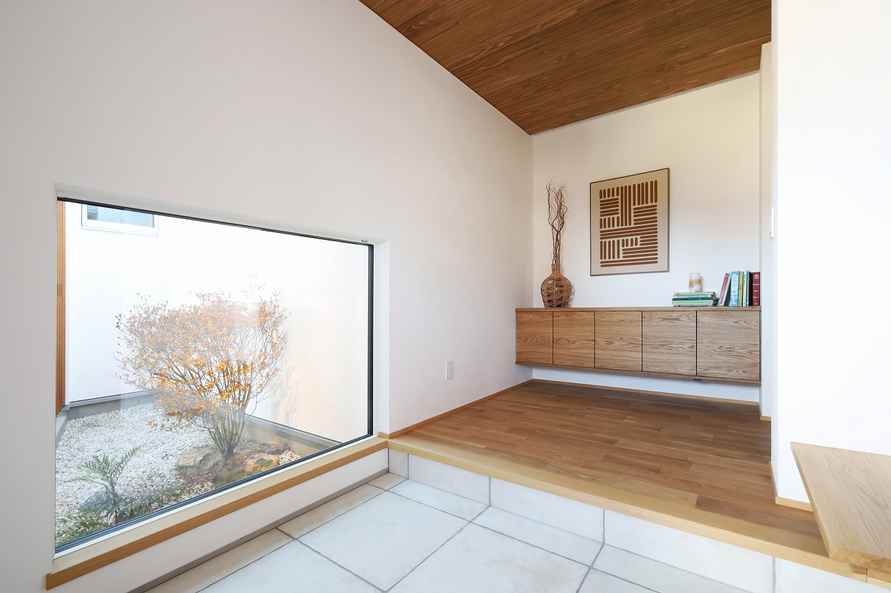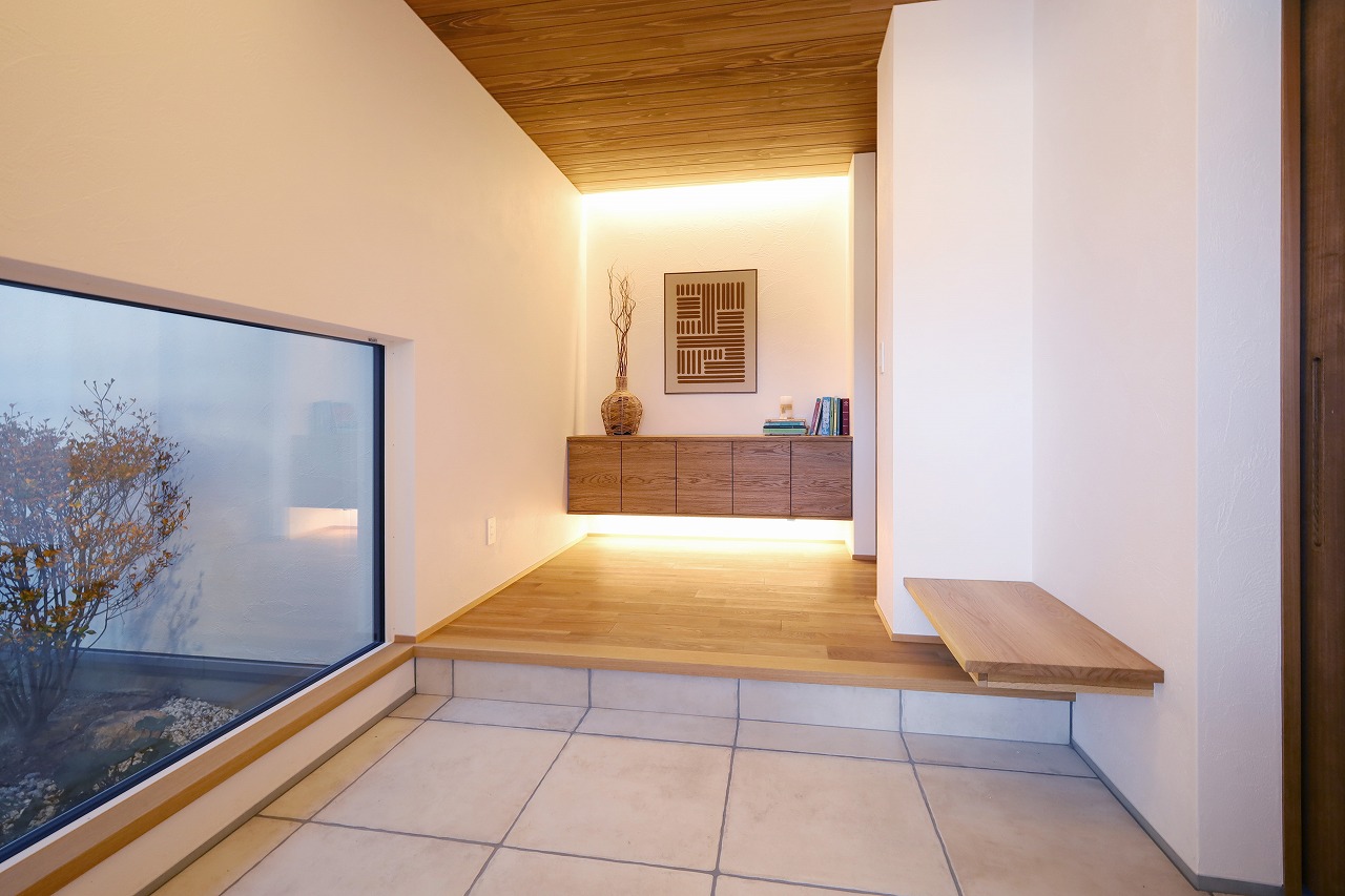 玄関に入った左手はFIX窓になっており植栽を植えます。夜になると間接照明が灯りライトアップされます^^