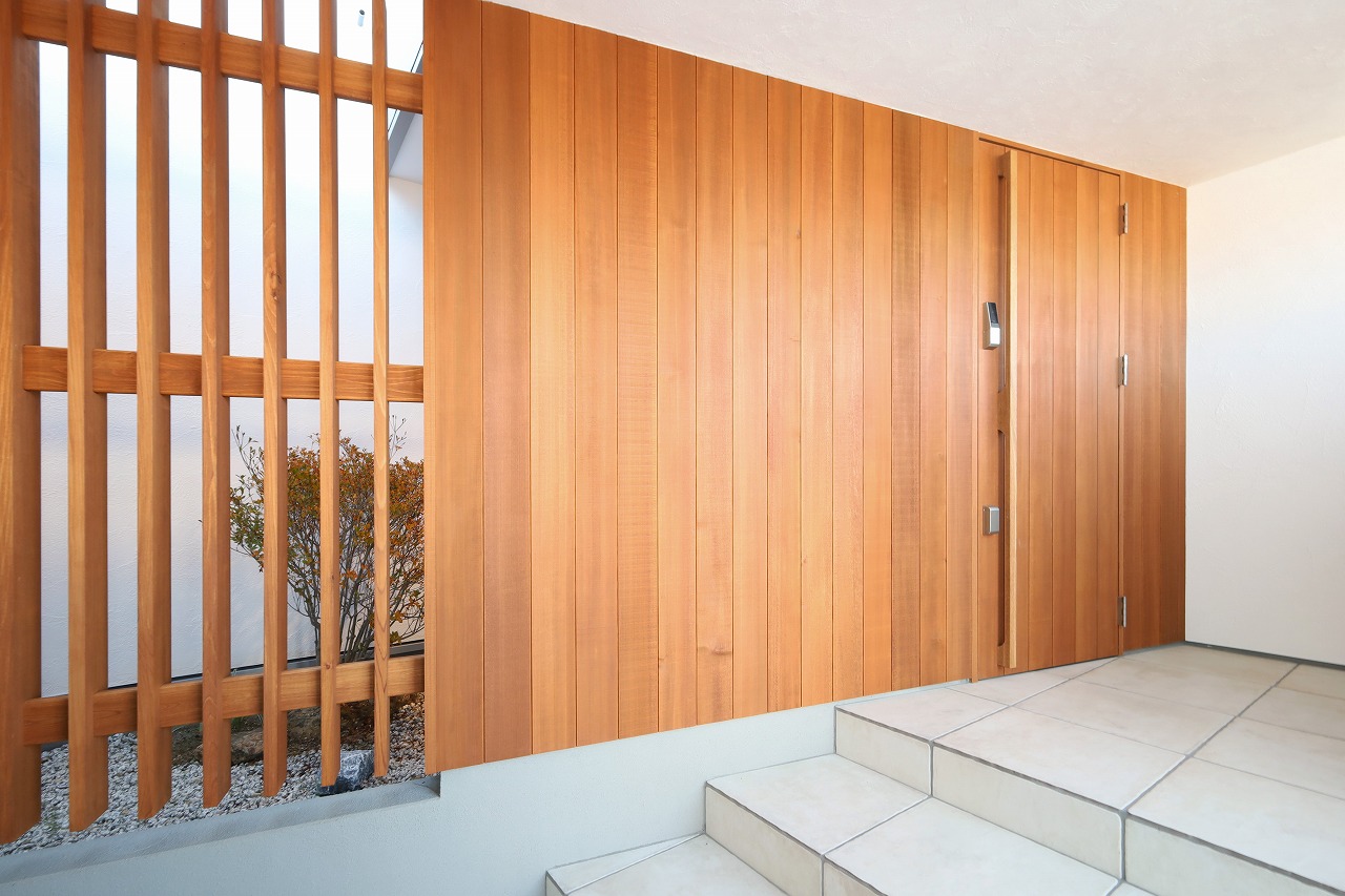 玄関扉も無垢ストーリーのオリジナル。玄関廻りの無垢材と同様の素材を使用したのでデザインを壊しません。