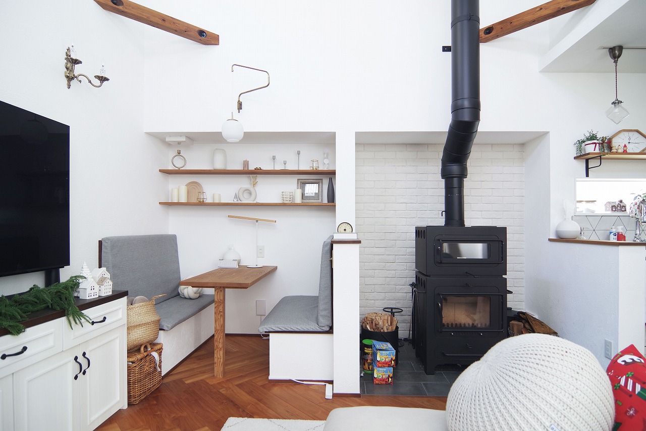リビングの一角にはヌックを設けました。リモートワークをしたり、お茶をしたり多用途に使えるスペース。横の薪ストーブは寒い季節に大活躍^^