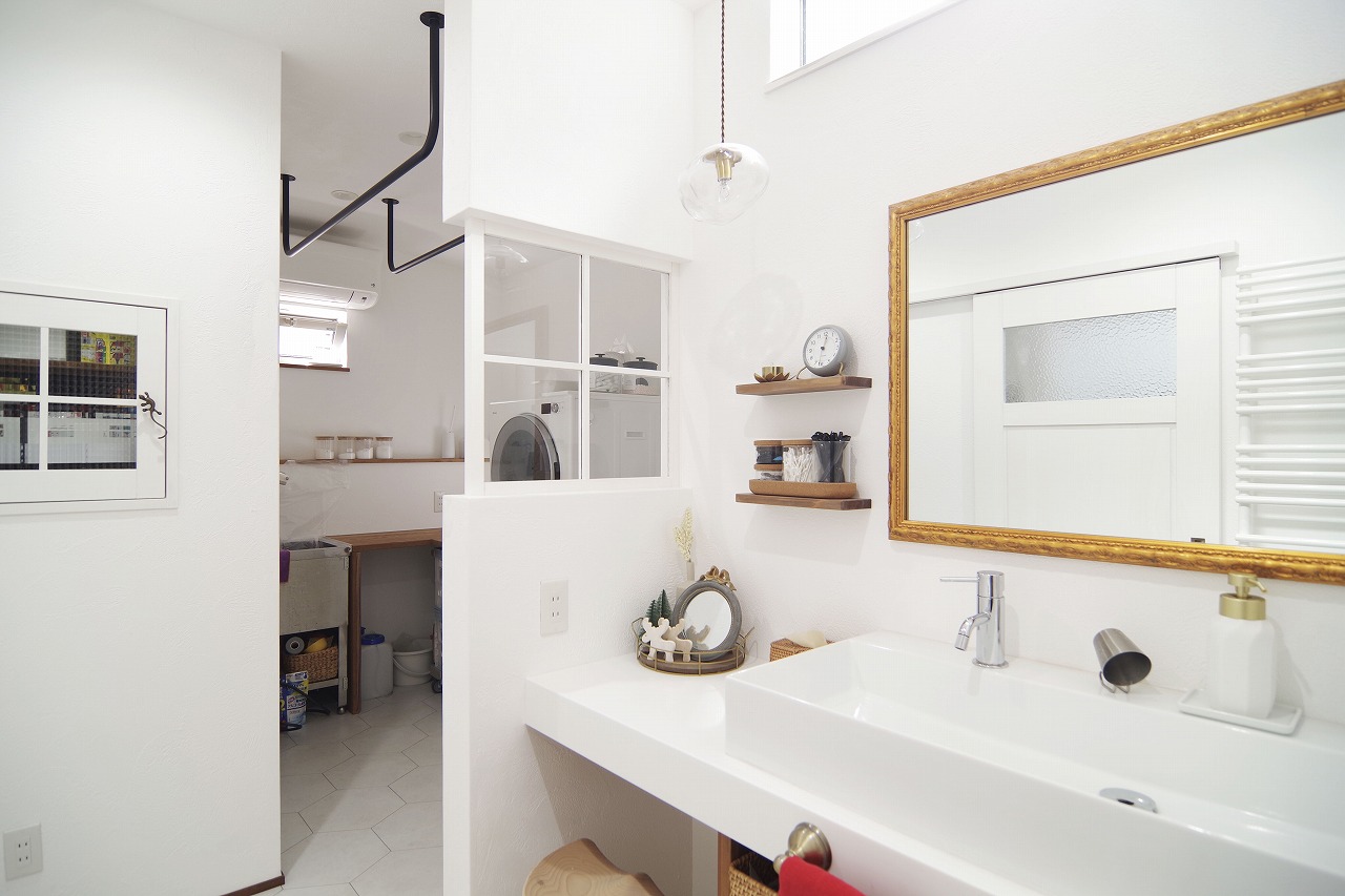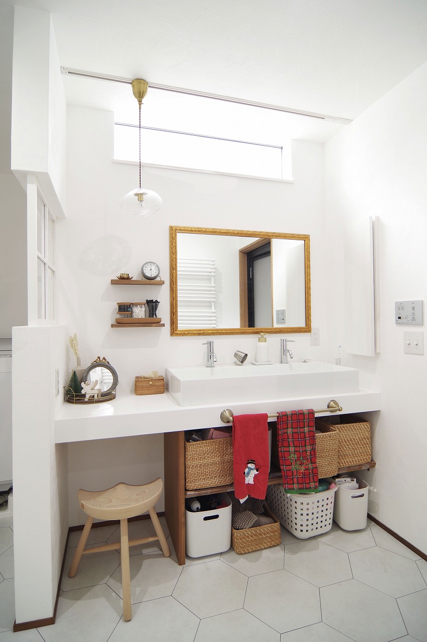 洗面化粧台もオリジナル家具。ゴールドフレームの鏡がアクセントになっています^^