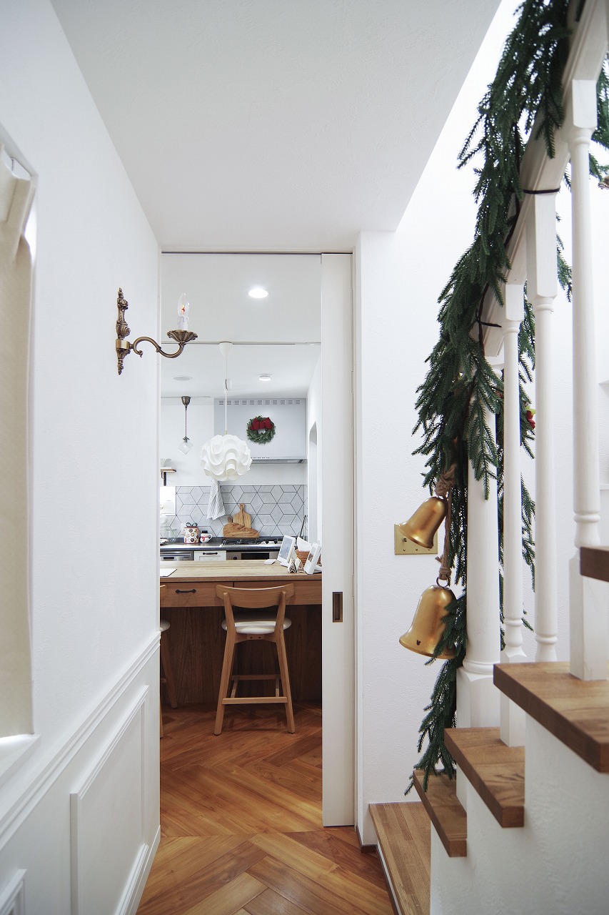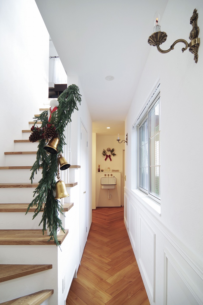 玄関からリビングに繋がる廊下の壁には弊社オリジナル木製の腰壁を取り付け海外の住まいを演出しました。
