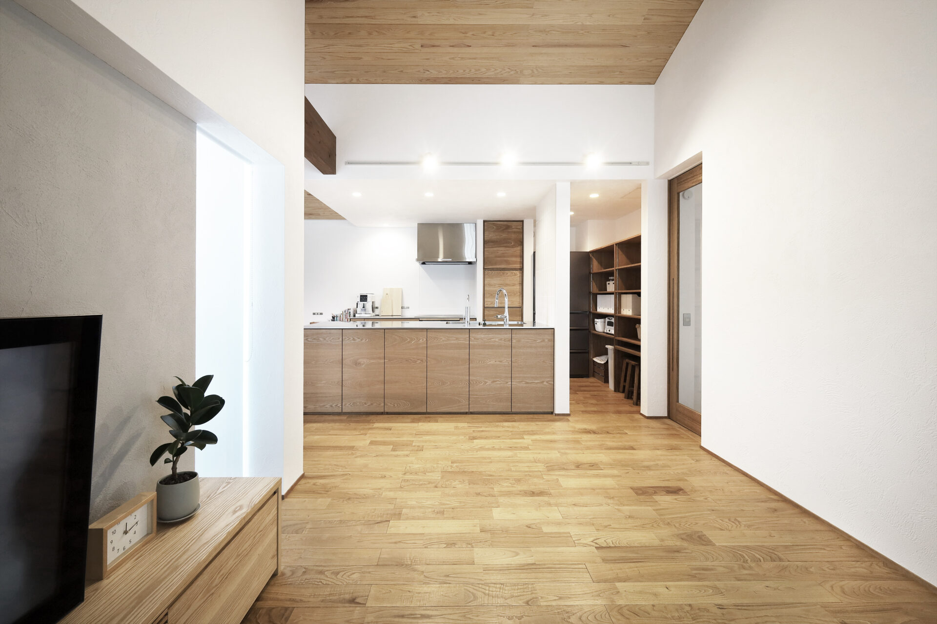 古くなっても愛着が湧く、木をふんだんに使ったシンプルな家が良かったというM様。 2階LDKならではの開放的な勾配天井で、深呼吸すると木の良い香りがします。