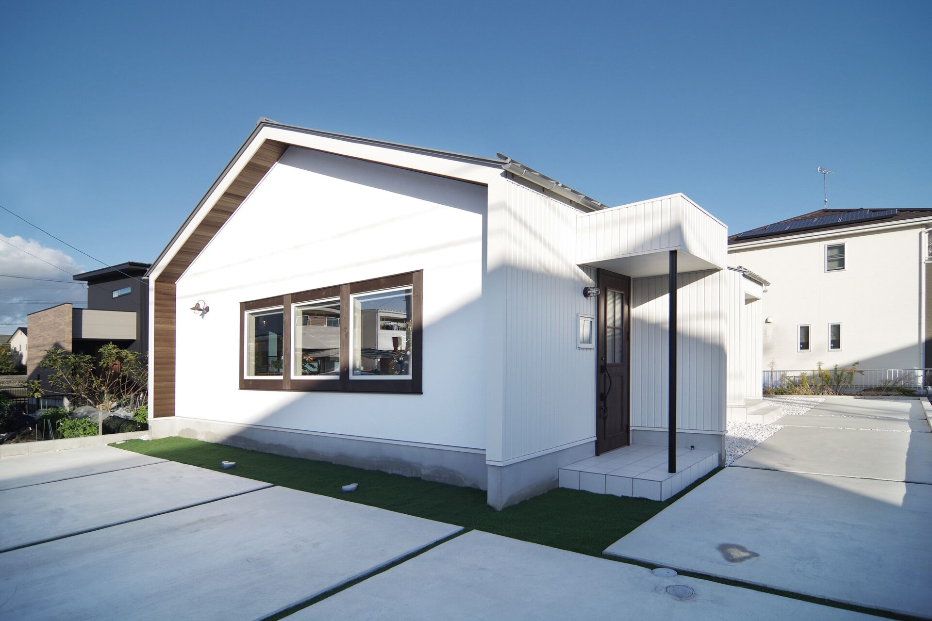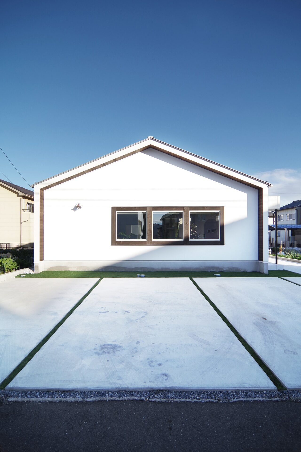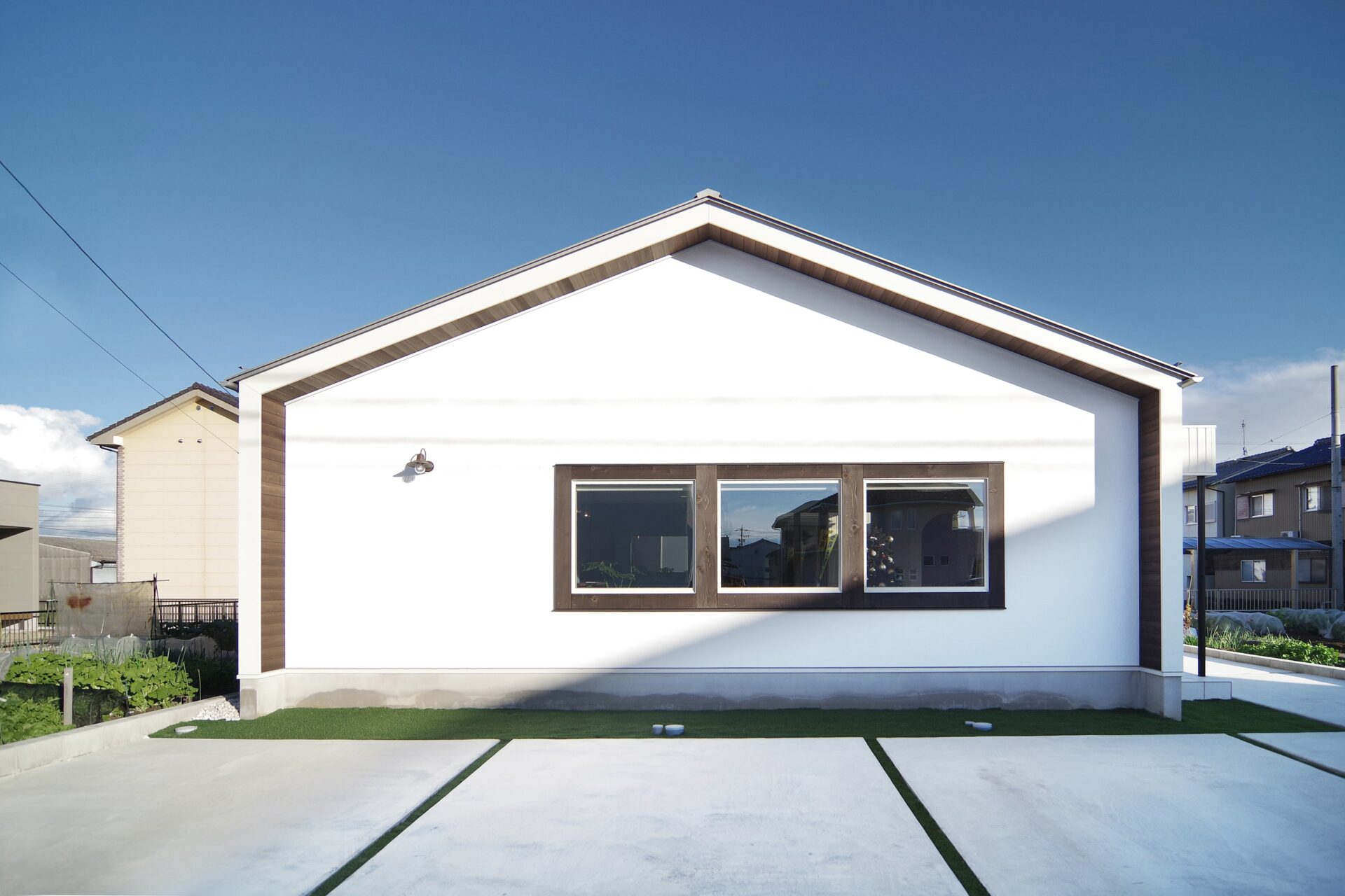 袖壁と軒天を出した、シンプルな三角の外観。木製のモールがアクセントに。