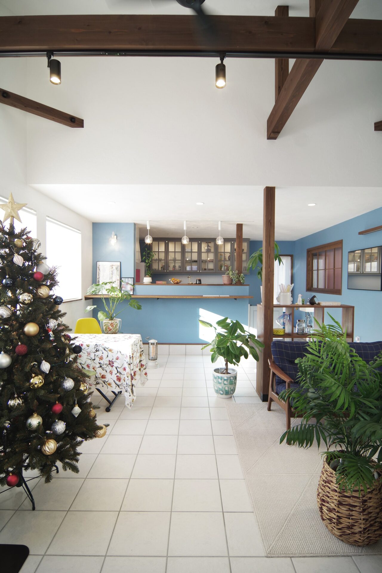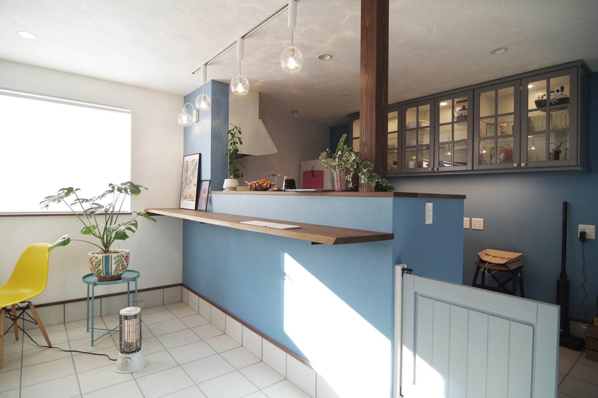 右側の白いパネルは冬は春の陽だまりのようにぽかぽか、夏は鍾乳洞のようにひんやり、輻射熱で暖め冷やす全館冷暖房の輻射式冷暖房パネル。一台のエアコンと連動し、家全体を暖めます。