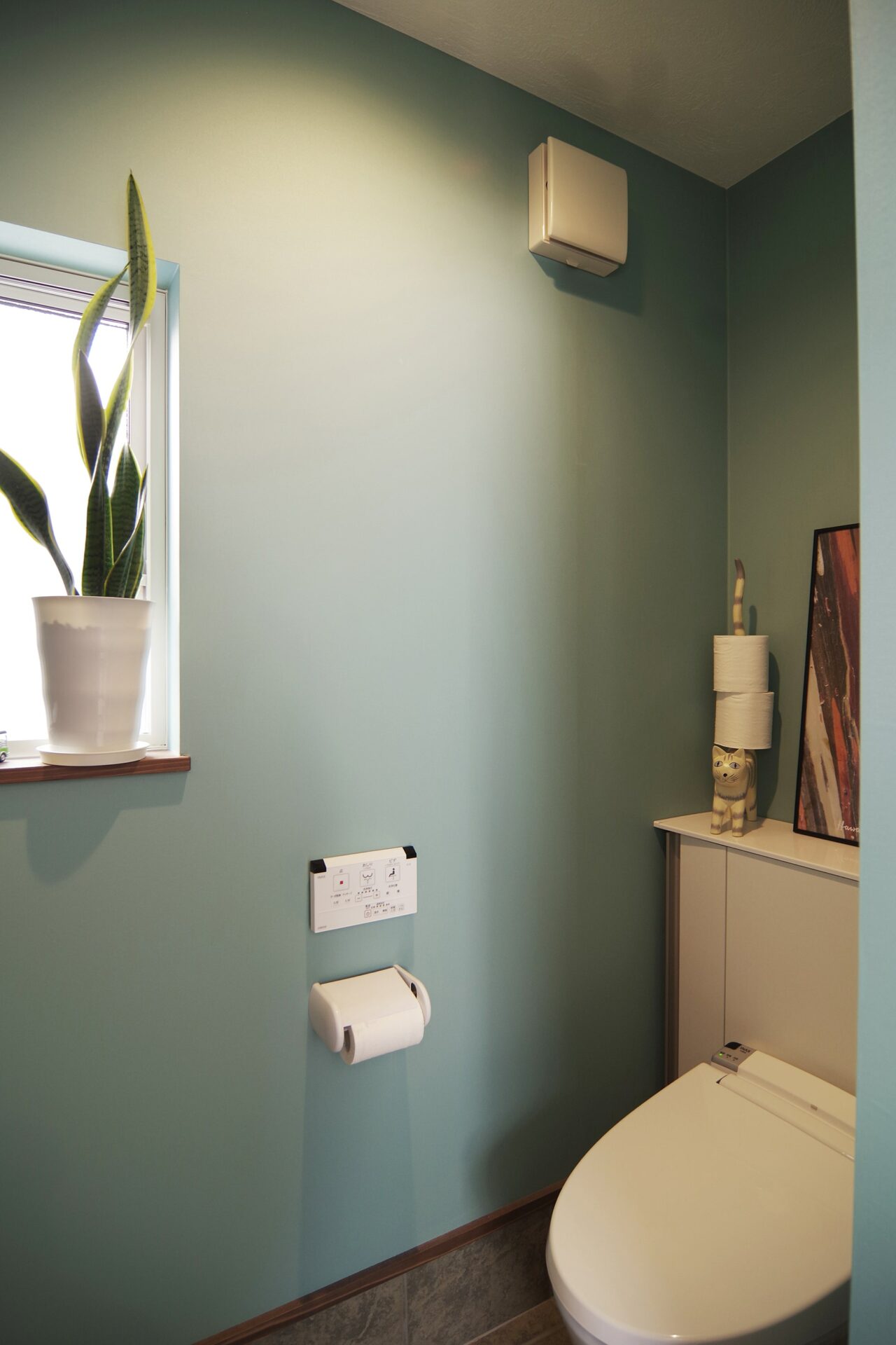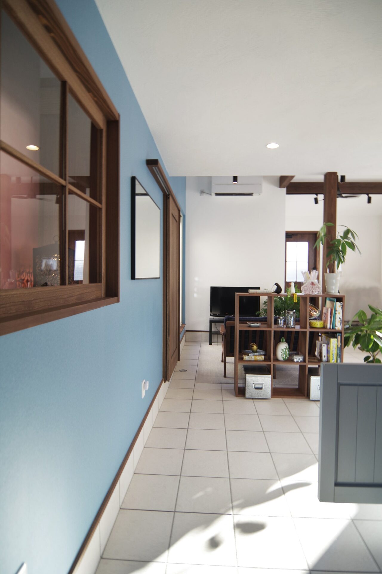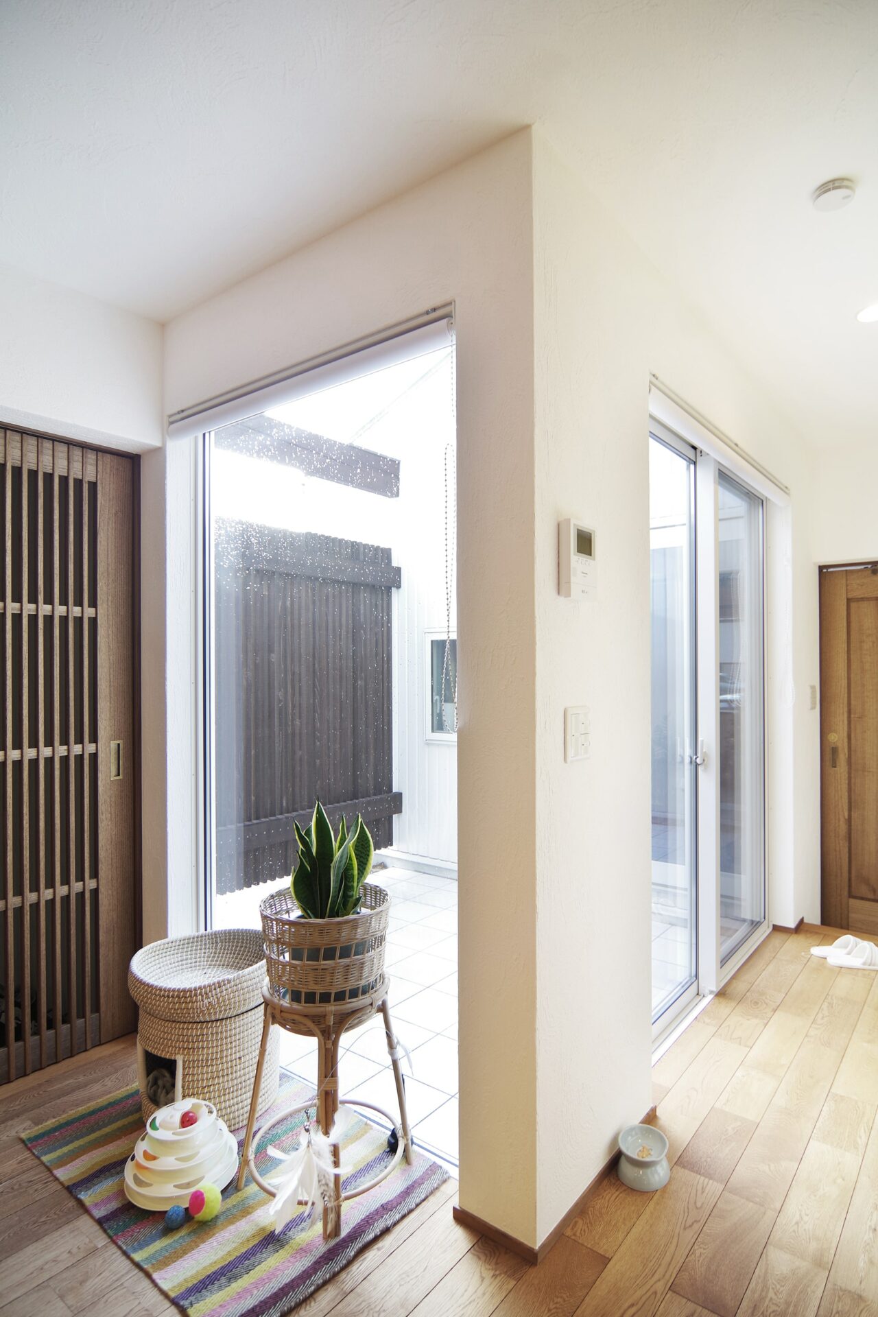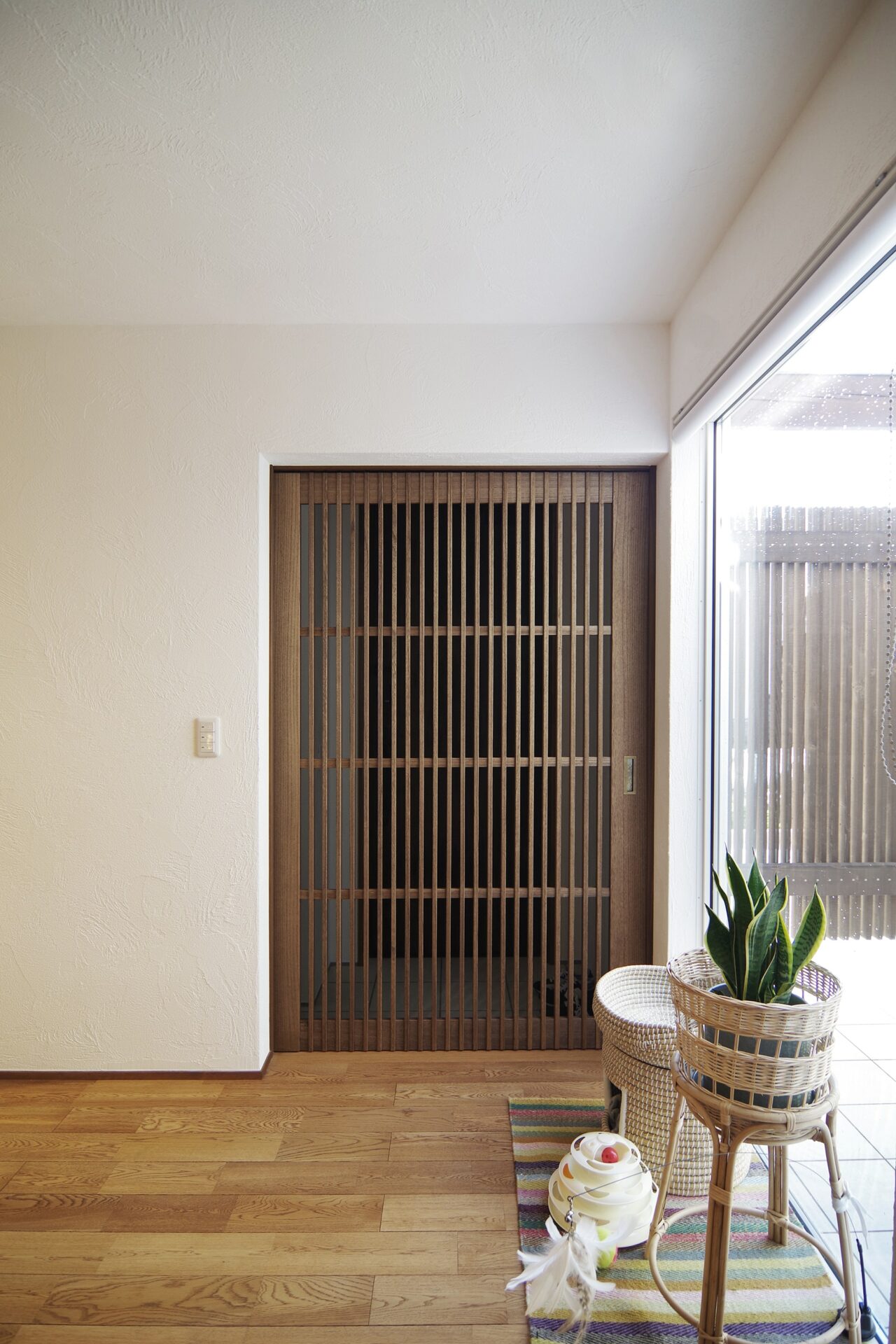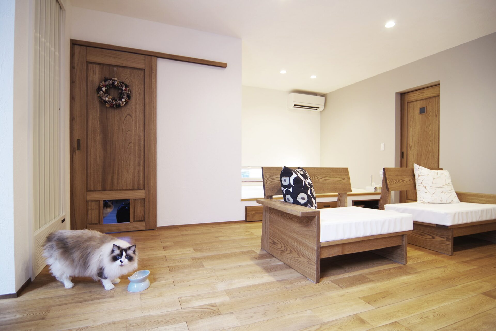ねこちゃんのいる居住スペースは無垢と漆喰のシンプルな内観。ねこちゃんが出入りできる建具はオーダーメイド。本社工場の職人の手づくりです。
