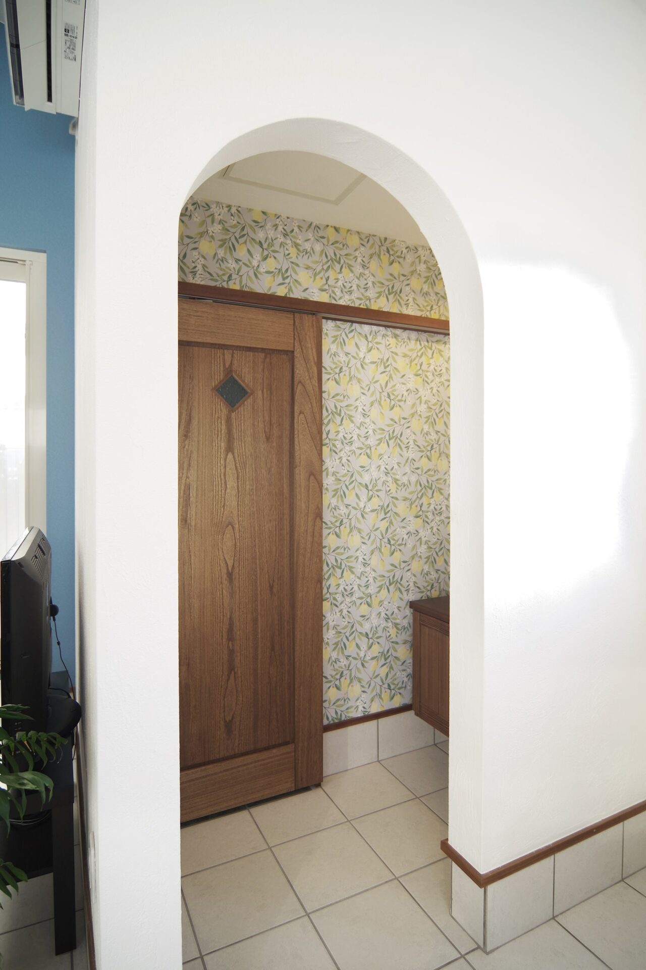アールの垂れ壁の奥はトイレと手洗い場。レモン柄のアクセントクロスがおしゃれです^^