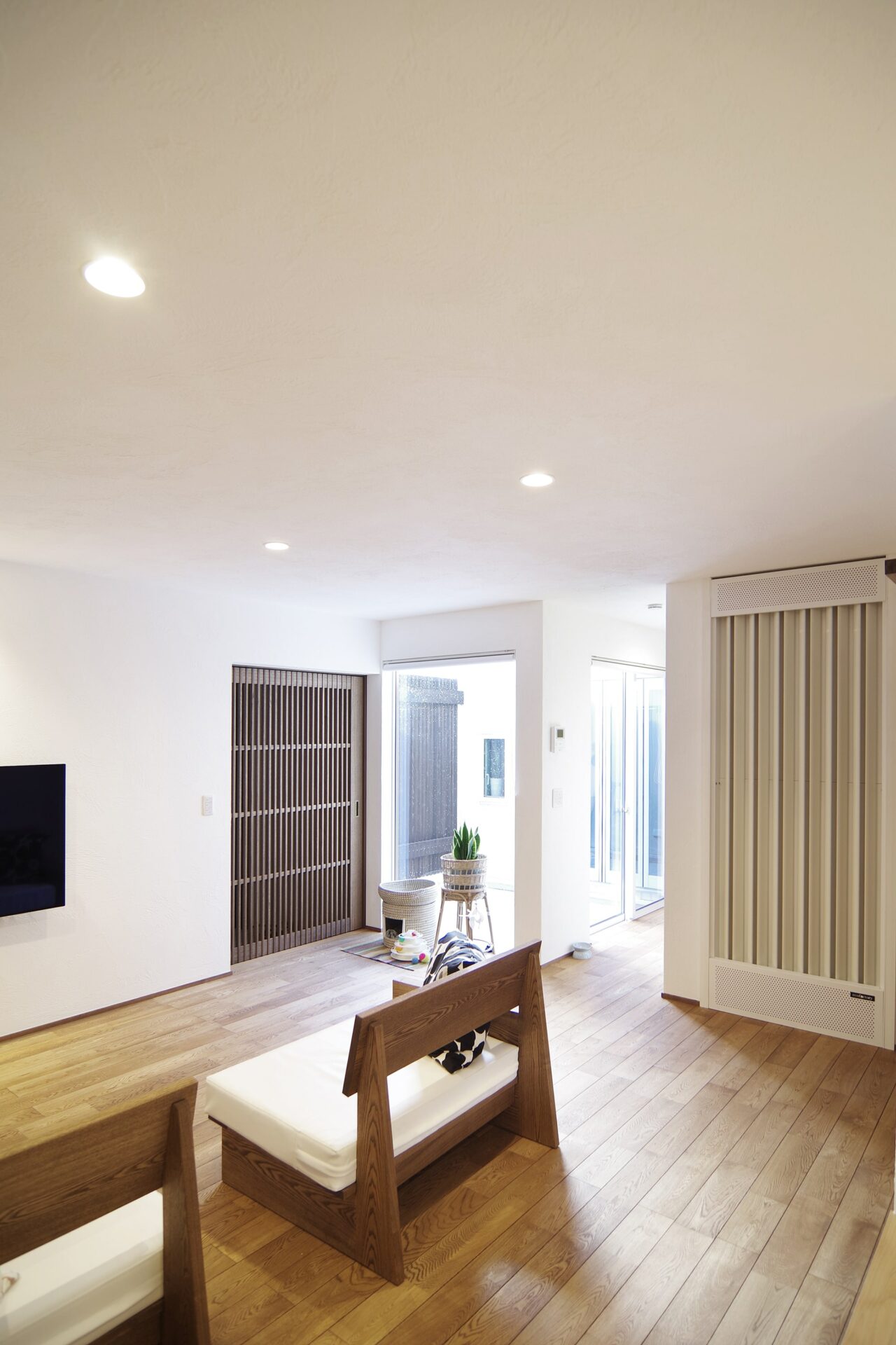奥に長い間取りは中庭をつくると空間全体が明るくなります。また、中庭には目隠しの柵を設け完全なプライベート空間となり、カーテンのいらない生活ができます。