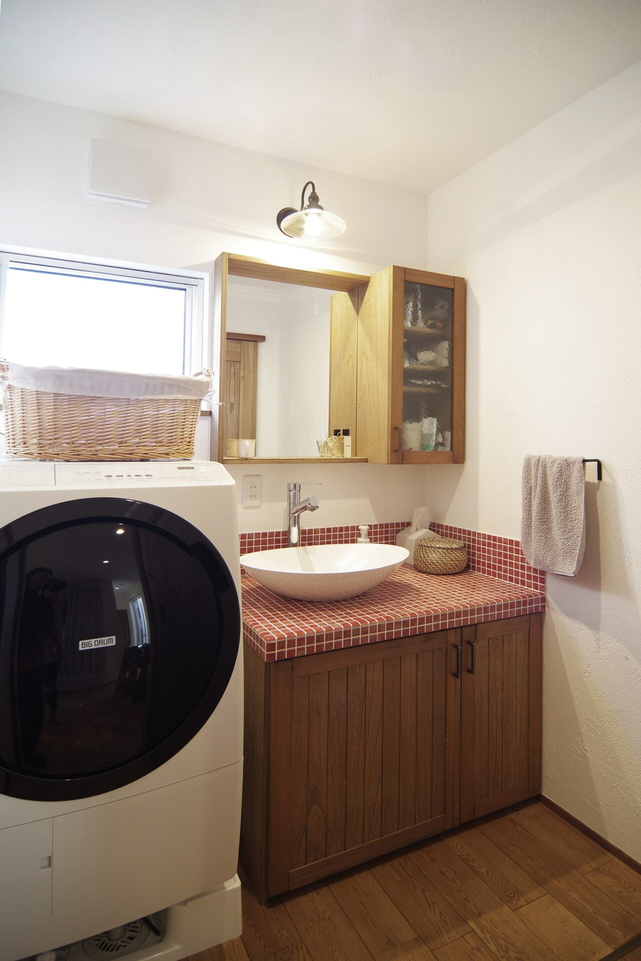 赤いタイルがかわいい造作の洗面化粧台。