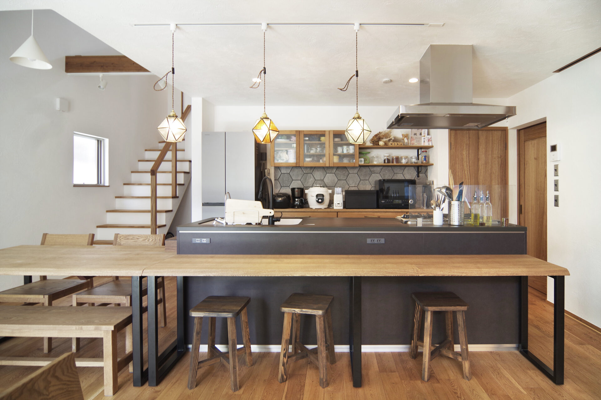 キッチンを囲んで大人数で賑やかに食事を楽しむことができるダイニングカウンターは、無垢ストーリーで造作。一人用のスツールは、本社工場を見学した際、自分たちで手作りしたものです。カップボードも無垢材で造作。真鍮の取っ手も素敵です。ゴミ箱を置く位置などM様が使いやすいように緻密にデザインされています。