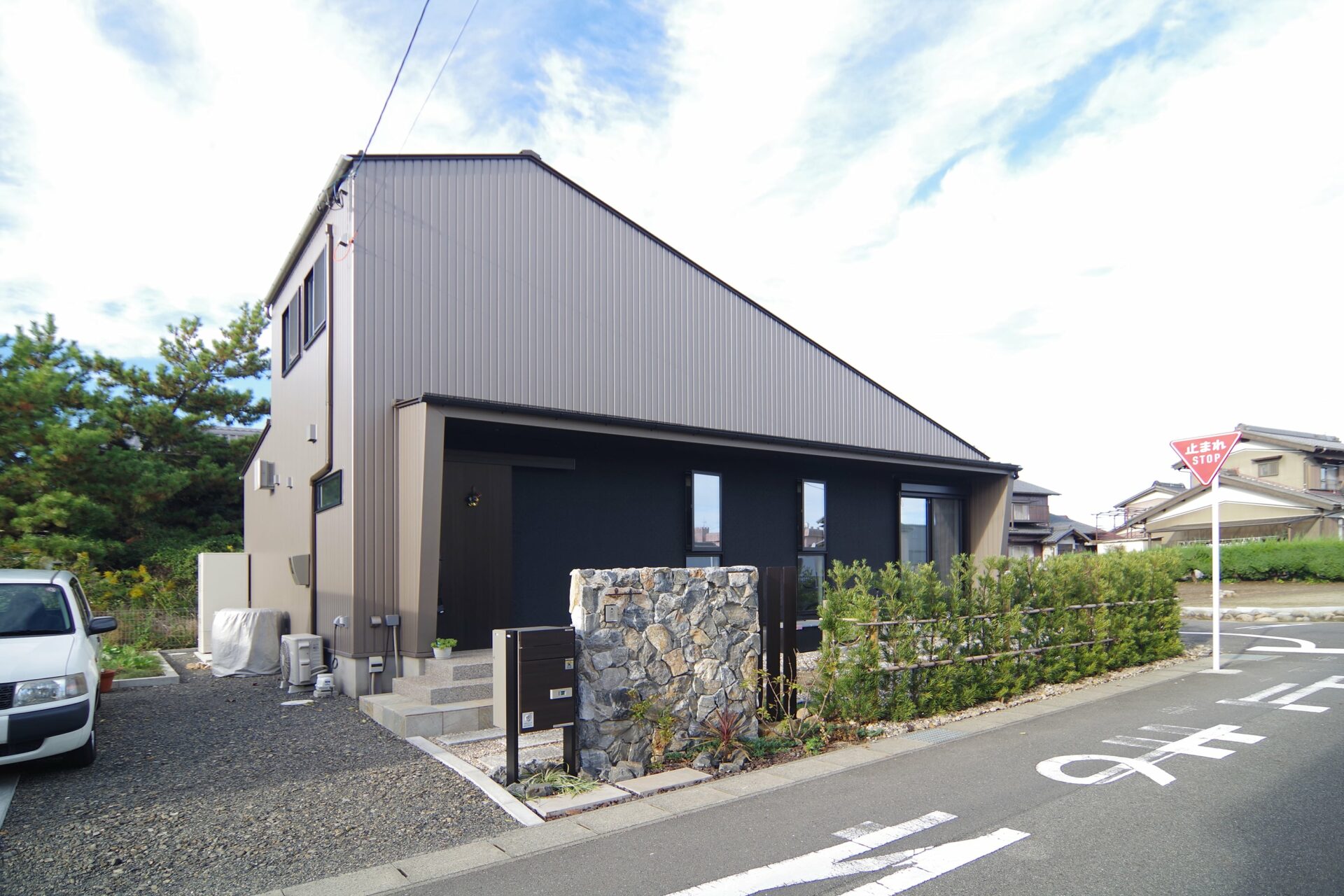 切妻の大屋根とブラウンのガルバリウムと黒のジョリパットの組み合わせがモダンな印象の外観。