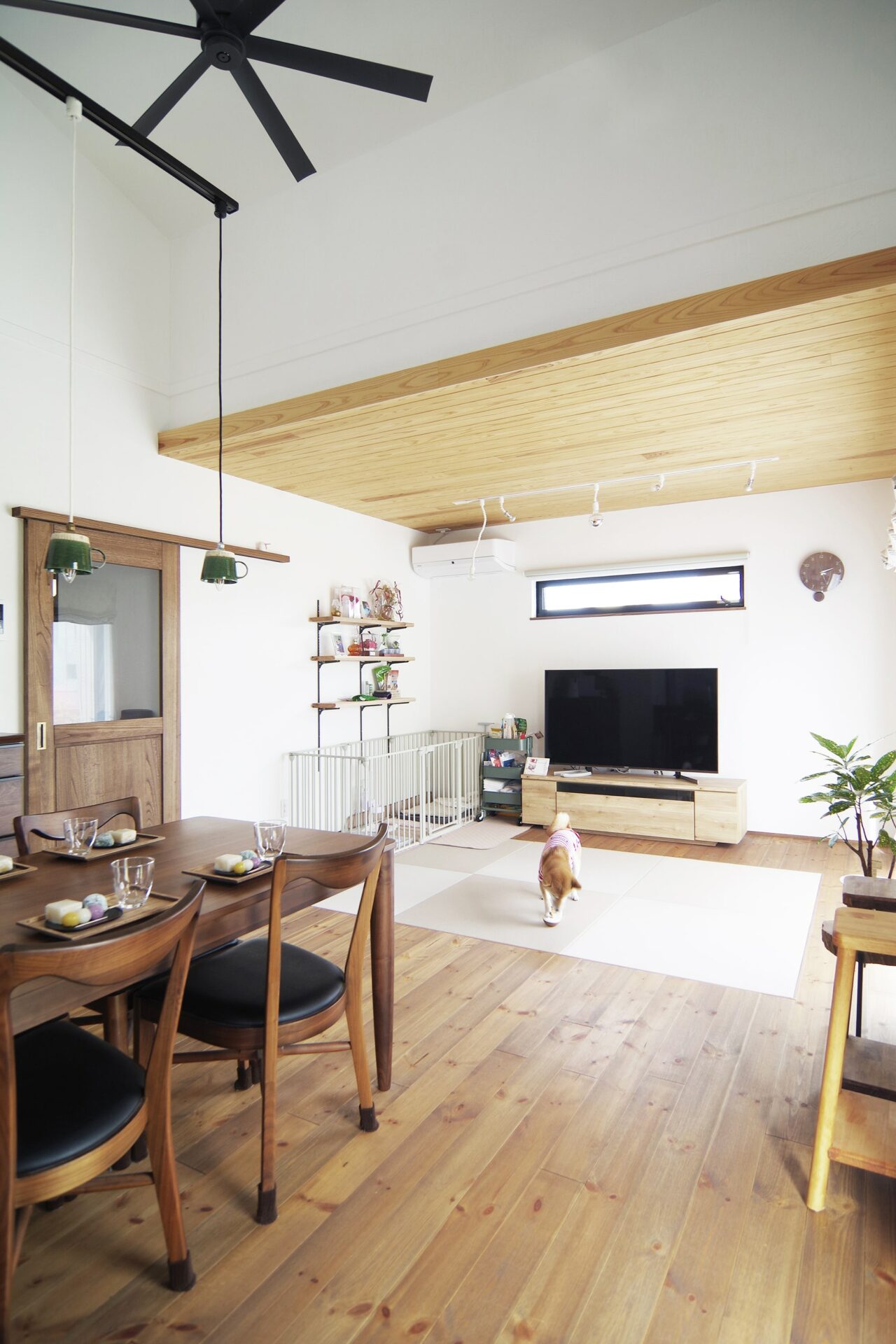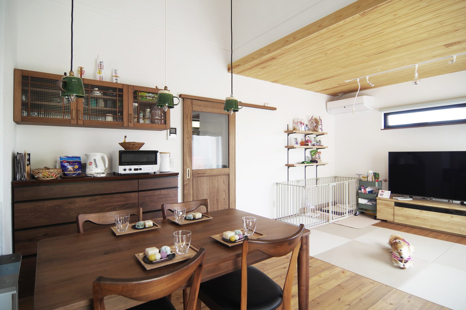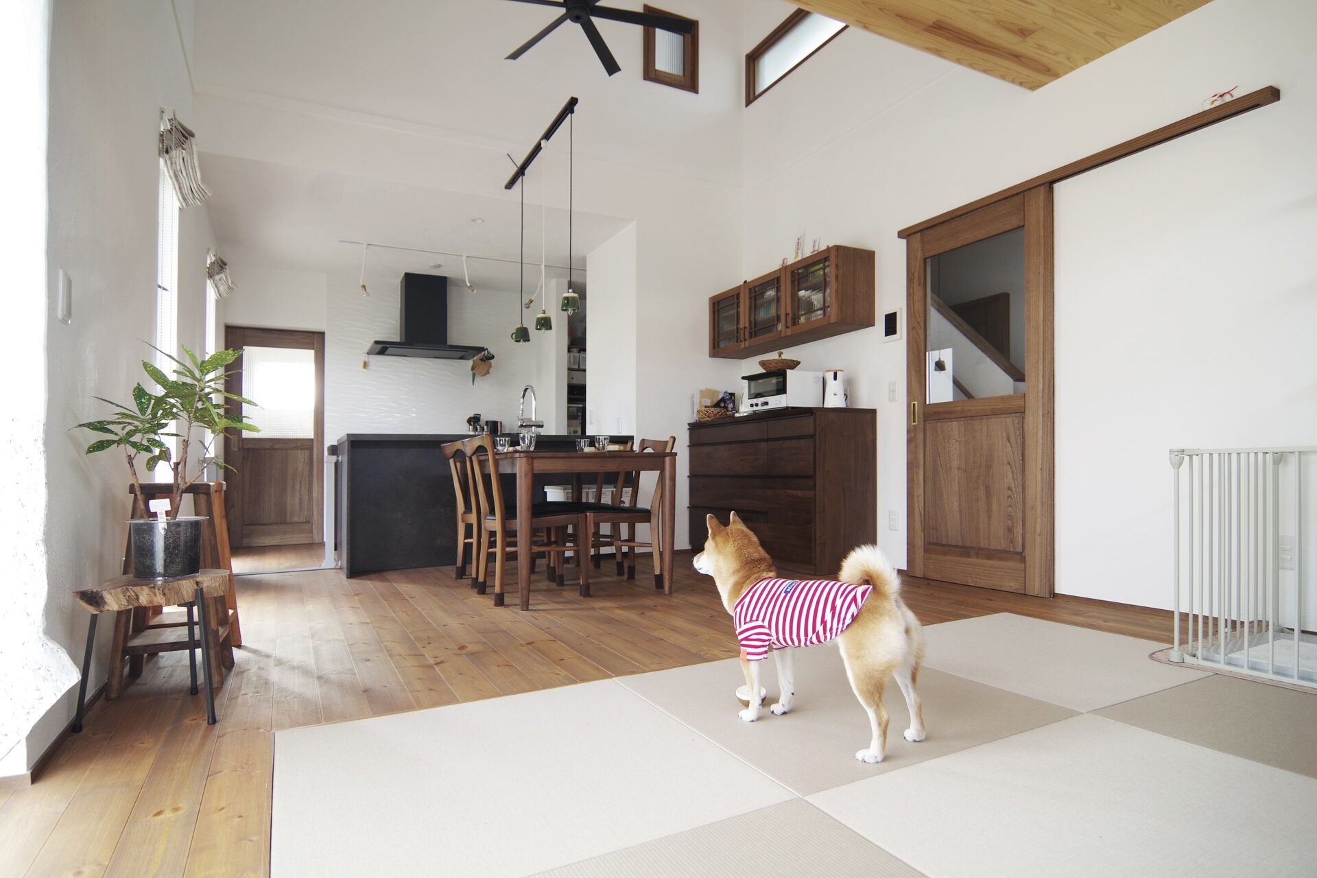 畳敷きのリビングです。天井には杉板を張り、和を感じる空間が落ち着きます。