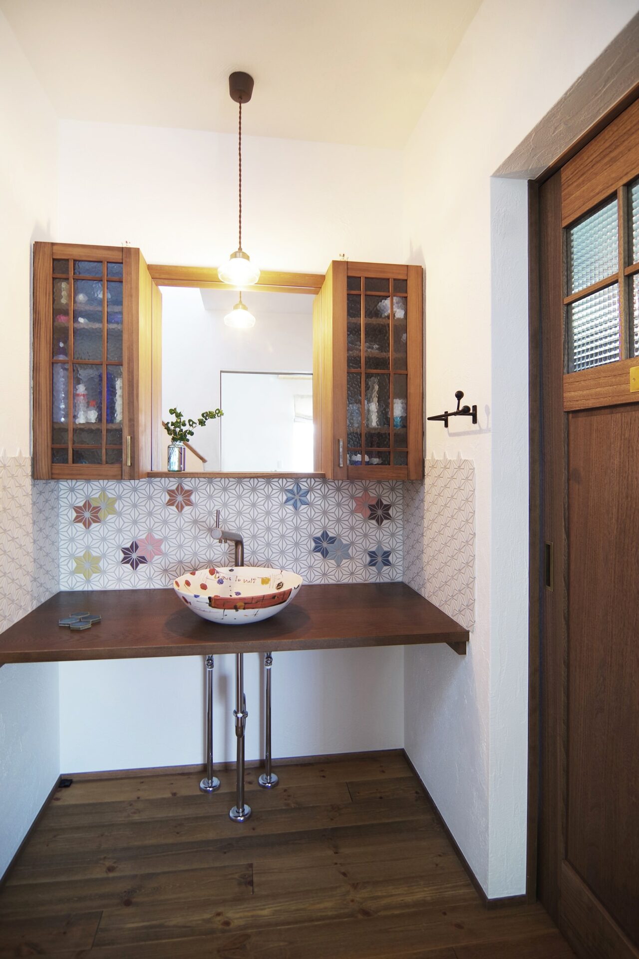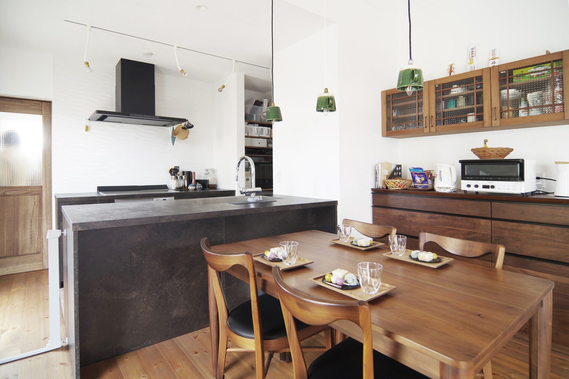 二型のキッチン。背面にはモダンな白いタイルが貼られました。照明はお客様のこだわり^^