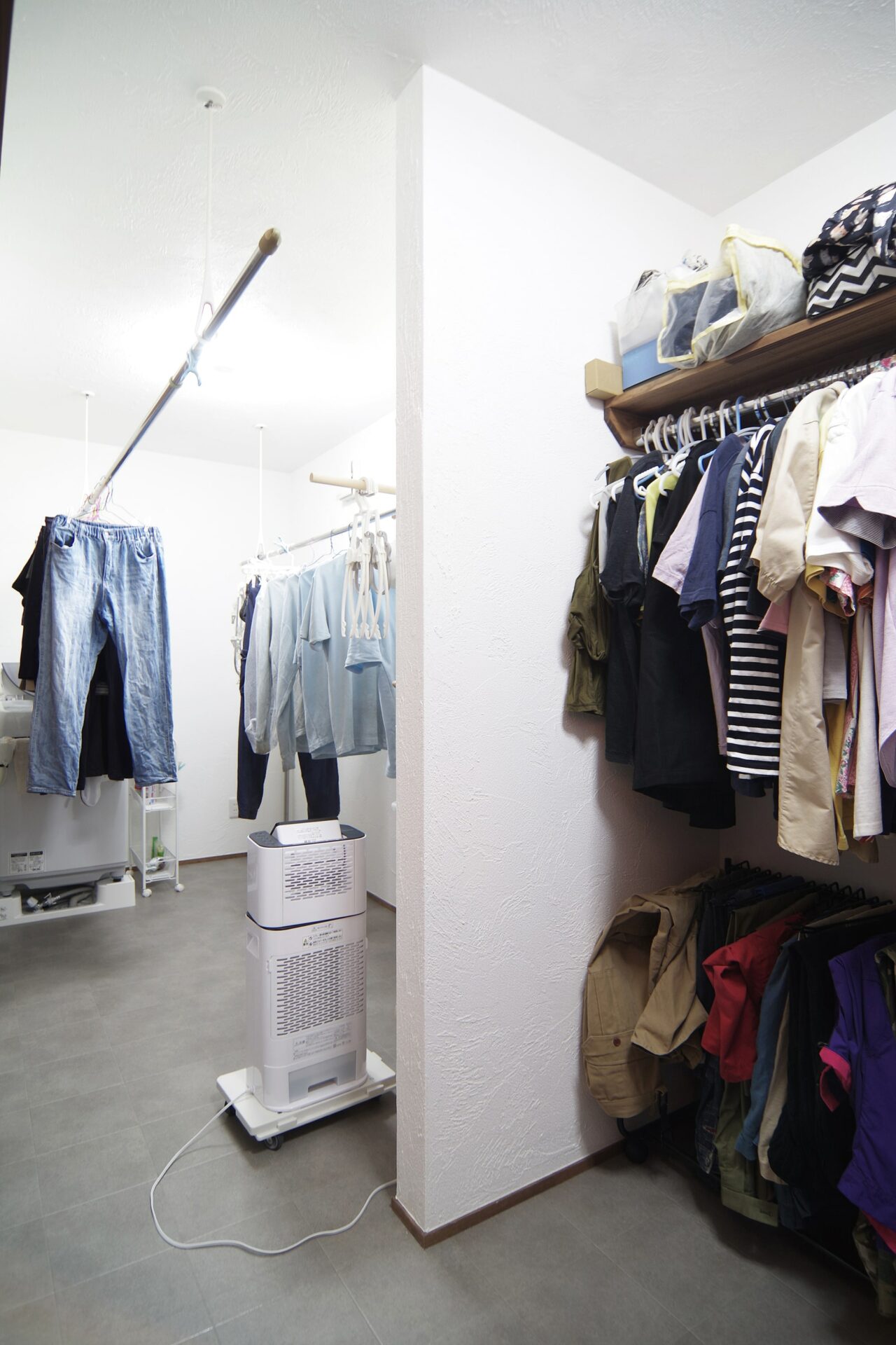 ファミリークローゼットとランドリールーム。無垢ストーリの家は壁天井に漆喰を使っているので、 ランドリールームも湿気がこもらず、匂いも気になりません!^^
