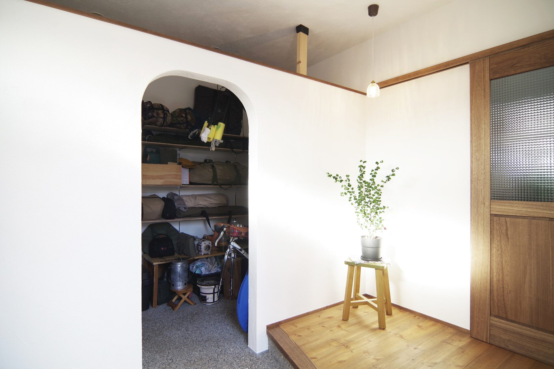 大容量の土間収納。壁を腰壁にすることで、玄関を入ったとき、圧迫感がありません。