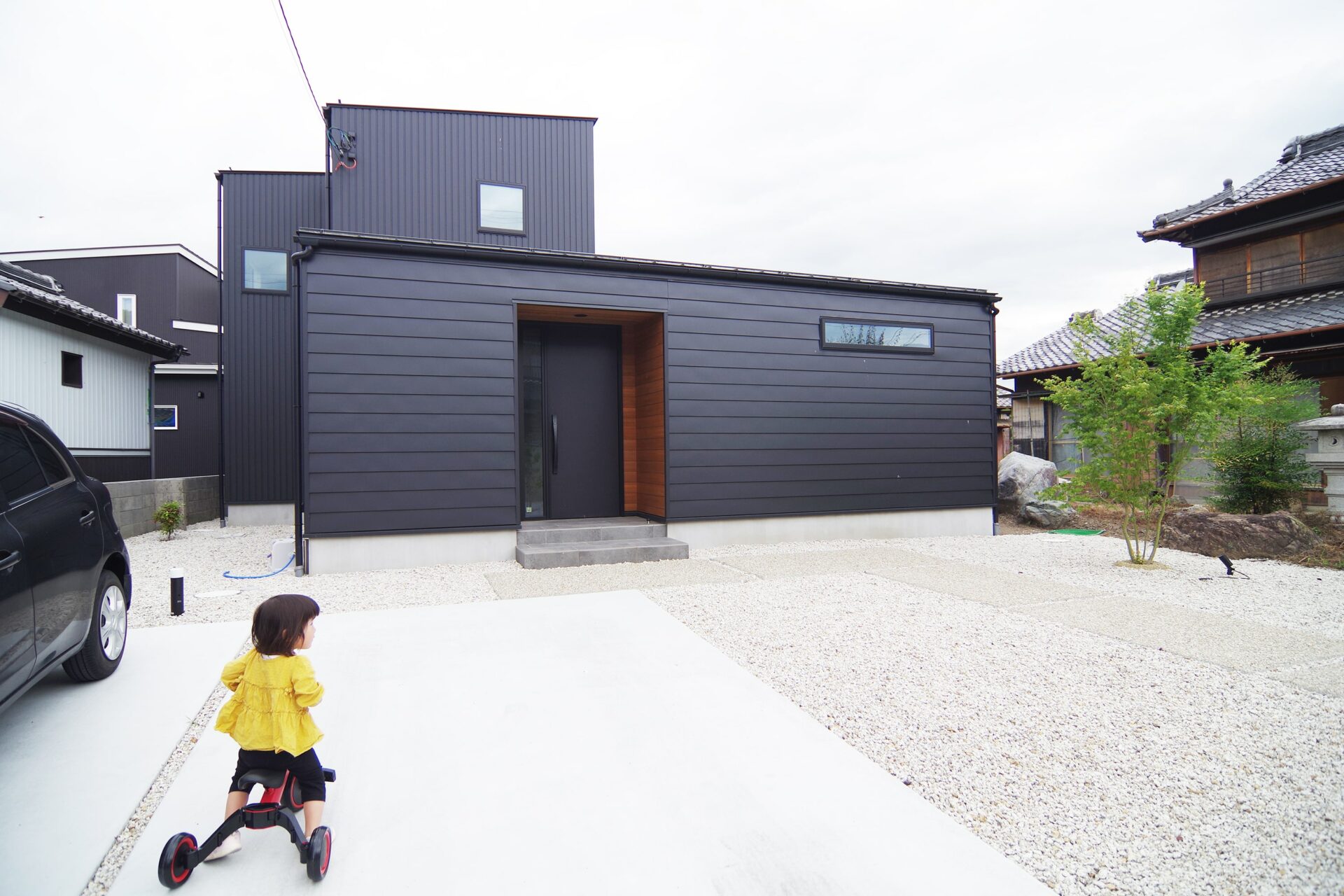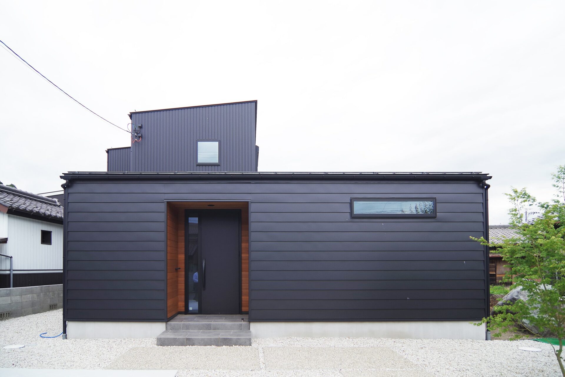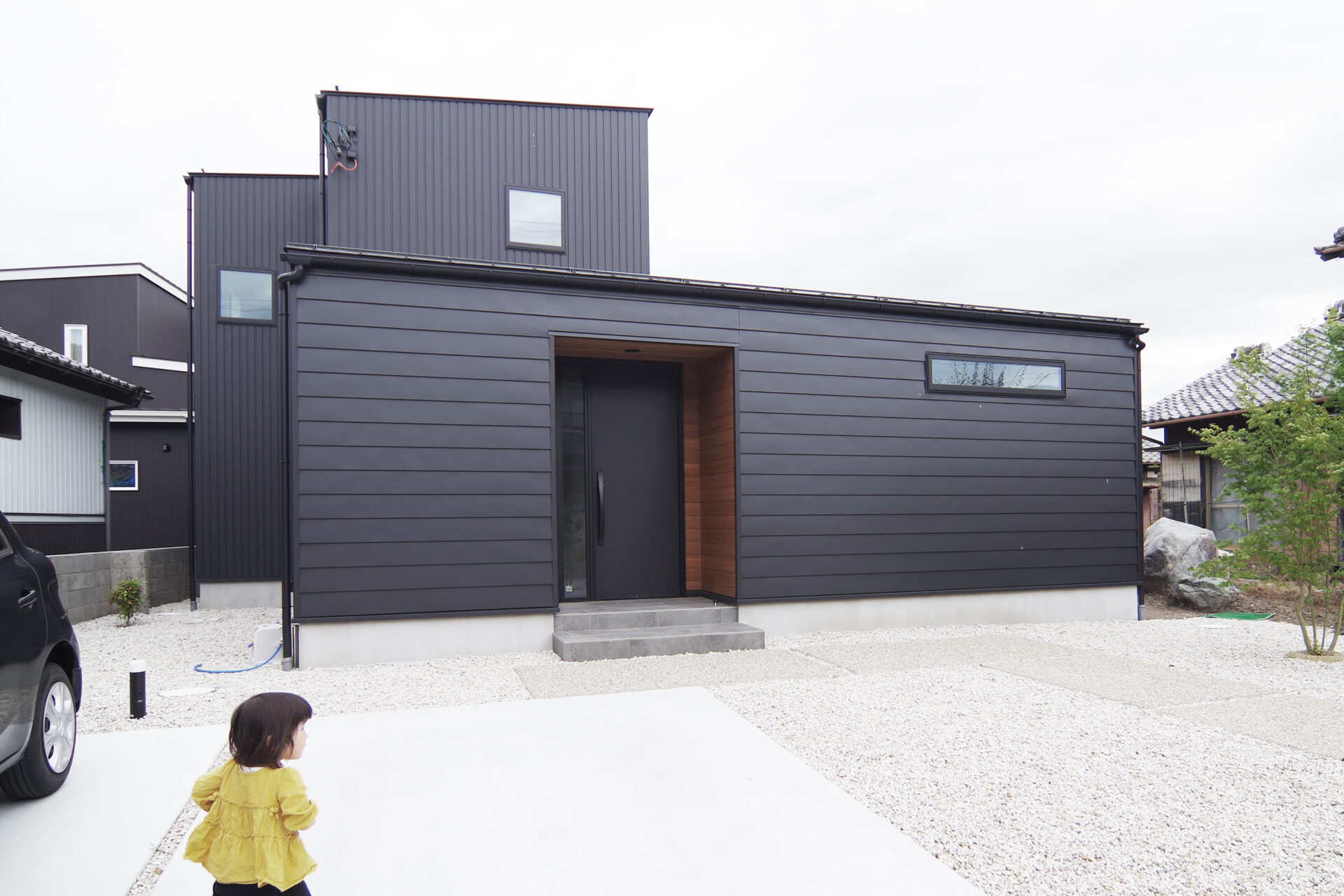 外観は黒のガルバリウムがモダンな印象。正面のみガルバリウムを横張にし、さりげないアクセントに。