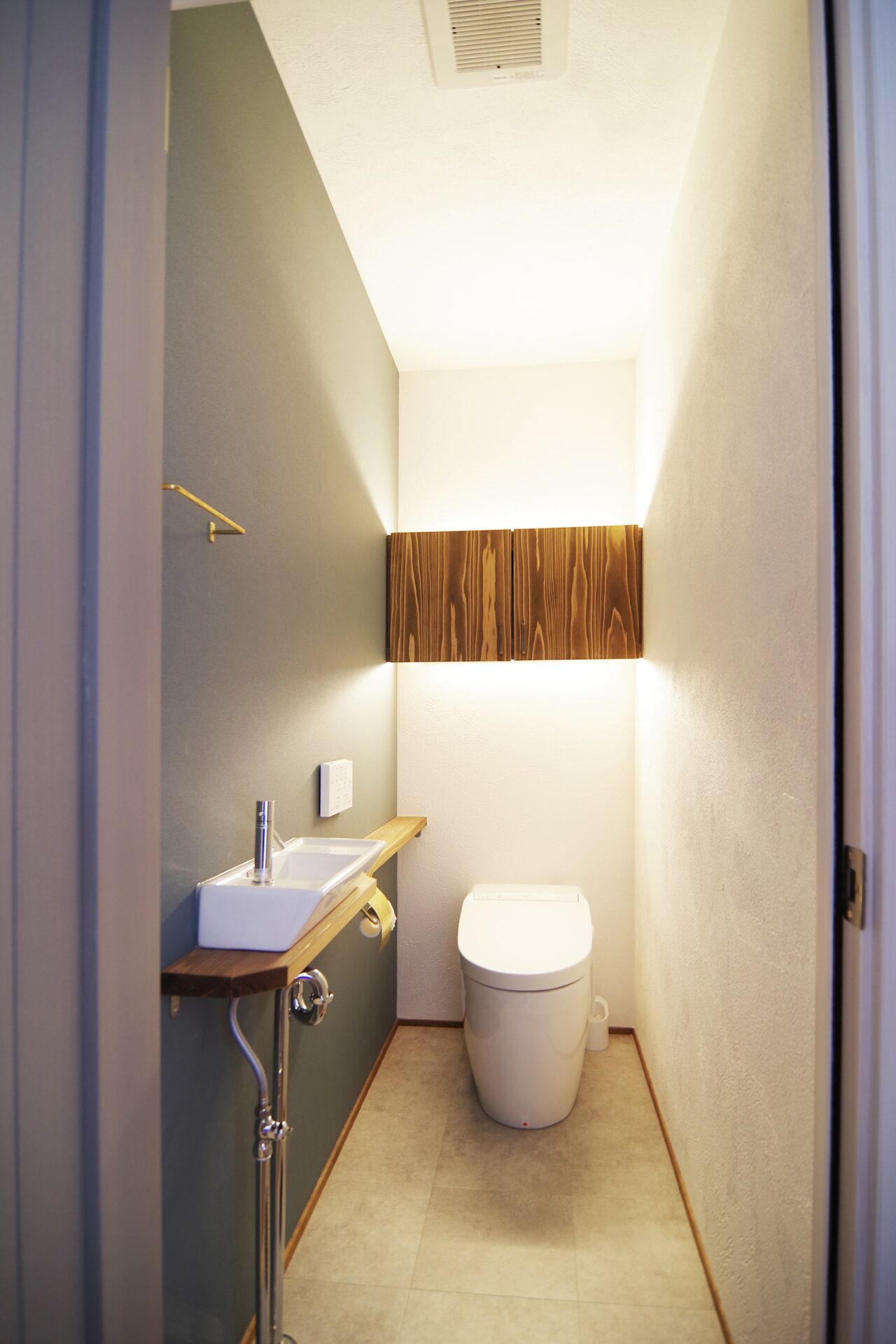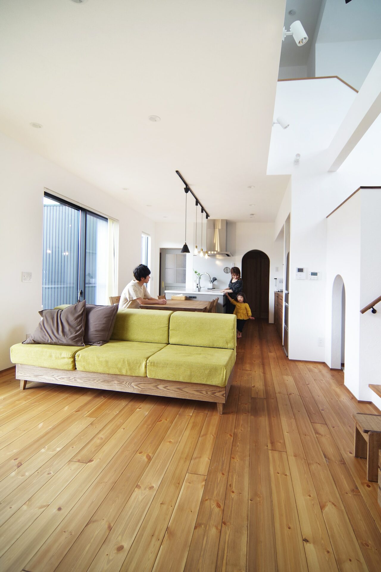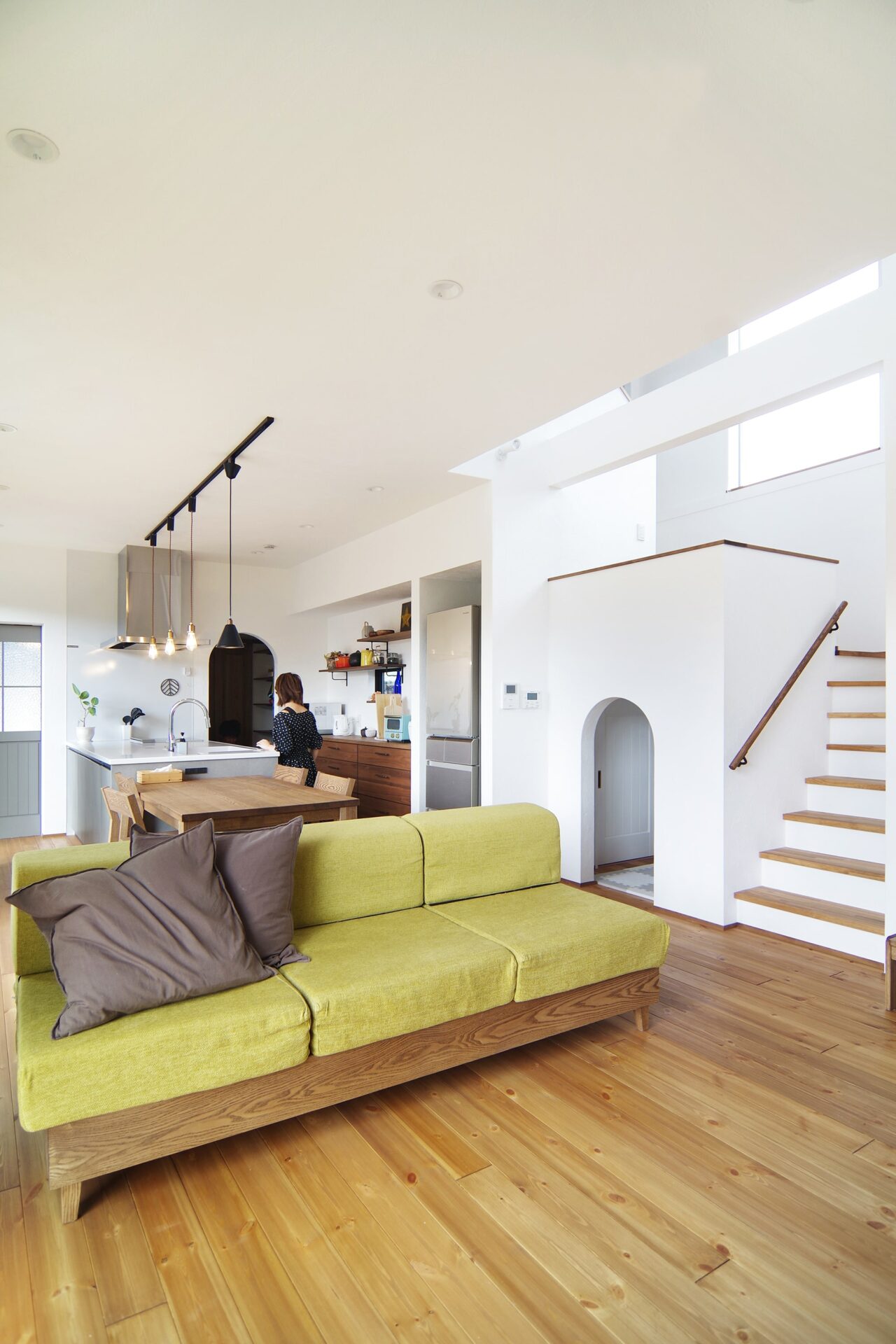 床はパイン無垢、壁天井は漆喰になります。ソファは本社工場で作る造作家具。ライトグリーンがお部屋のアクセントになっています。