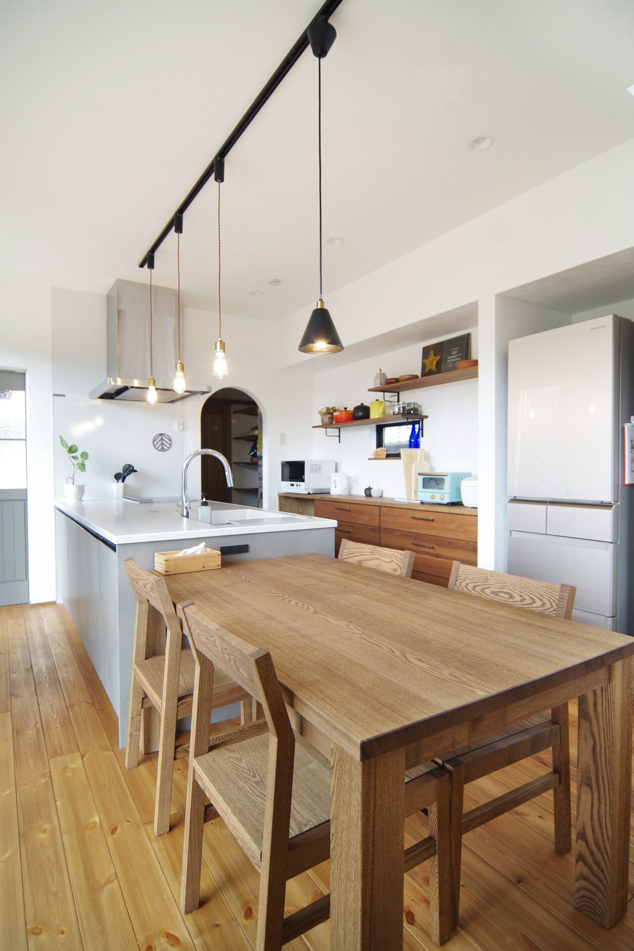 造作のキッチンの幅に合わせたダイニングセットとキッチン背面収納。