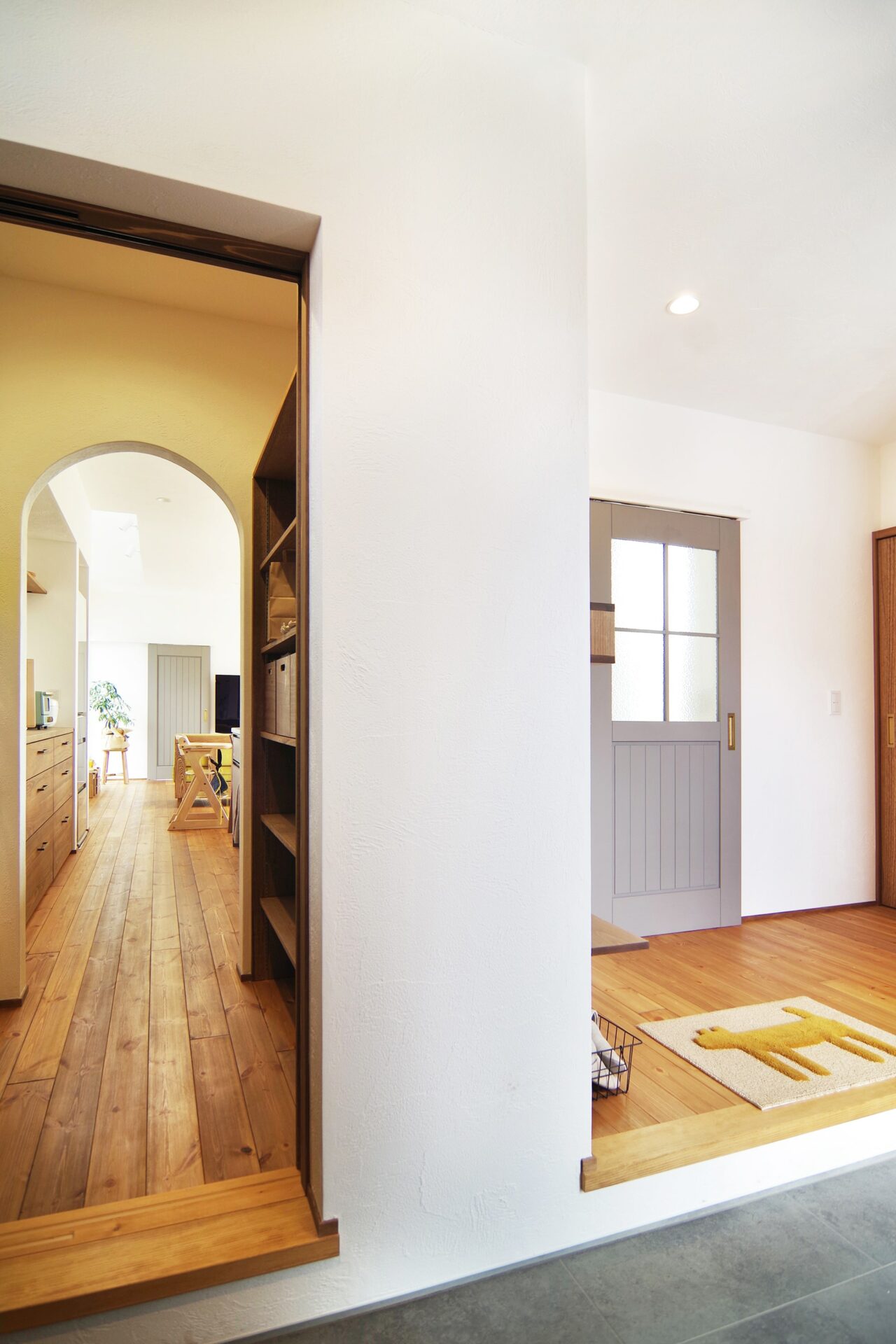 北側にあるとは思えない明るいリビング。大きな掃き出し窓と吹き抜け、南側のはめ込み窓からの採光により、暗さを全く感じさせません。