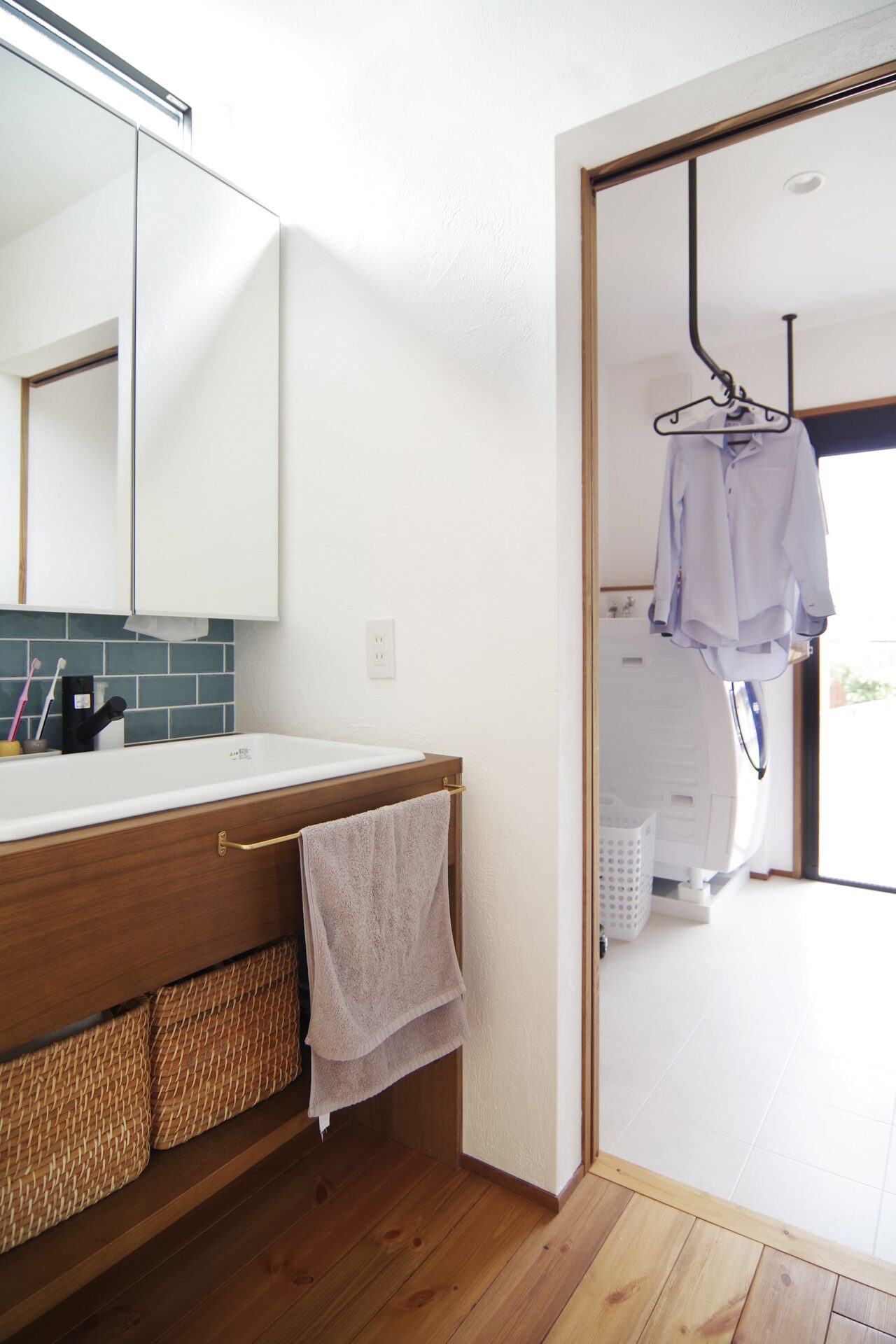 造作の洗面化粧台、奥は脱衣所兼ランドリースペース、ファミリークロゼットもあります。